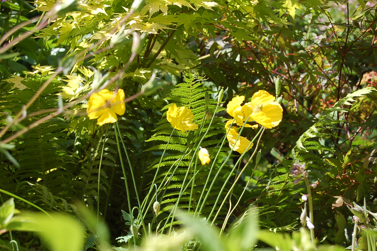 Sometimes the simplest and most common of plants are the stars of the garden. This yellow Welsh Poppy, Meconopsis cambrica, comes to life in the low-angled rays of sunshine at the beginning and end of the day. Considered by many gardeners to be a weed because it happily and freely self-seeds wherever it is happy, this diminutive gem has the knack of placing itself brilliantly. We wouldn’t be without it.