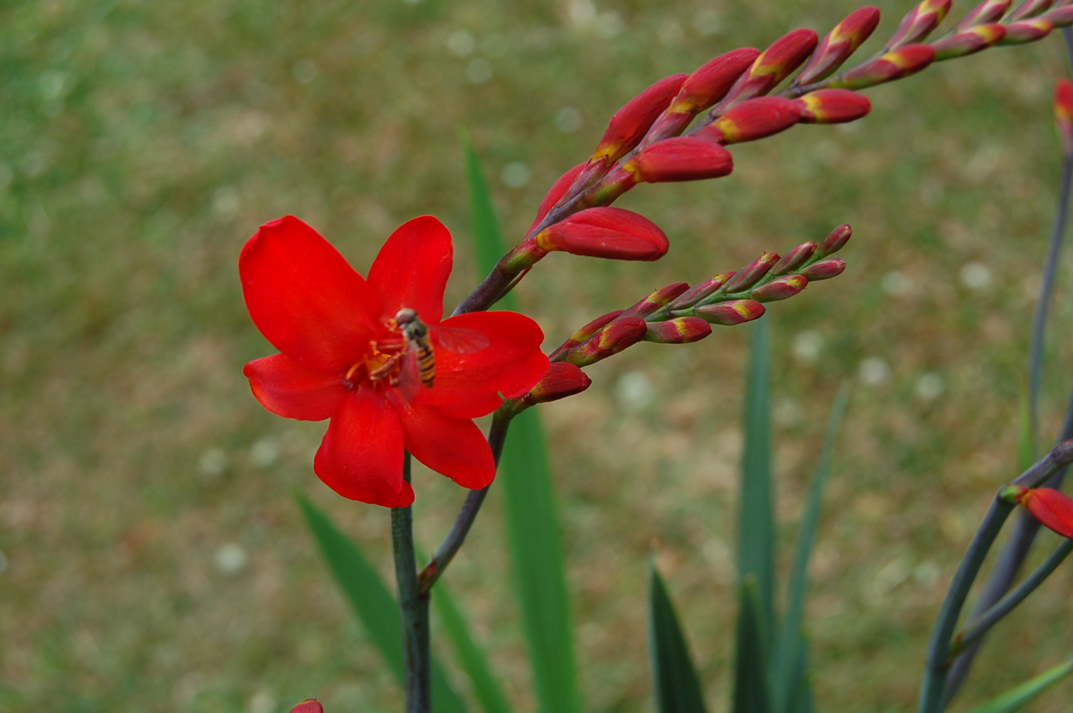 We have added more red to our Hot Border for extra zing! This extra red was provided by a crocosmia called “Walbertons Red”. The “Walberton” part of the name refers to the nursery in Arundel, West Sussex who introduced it. The nursery’s best-know introductions are probably Lavender Silver Edge and Scabious Butterfly Blue. We also bought Crocosmia “Walbertons Yellow” and both these crocosmias are richly coloured and flower strongly.