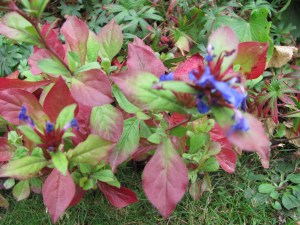 Oranges, yellows and reds are the colours of autumn but wandering around our patch today I was struck by the richness of the blues in the late blooms. The rich blue flowers of Ceratostigma plumbaginoides sit above its red tinted foliage. This is a plant to keep an eye on as the temperatures drop in the autumn because the red on its leaves intensifies and spreads. Such a beautiful plant with such an ugly name!