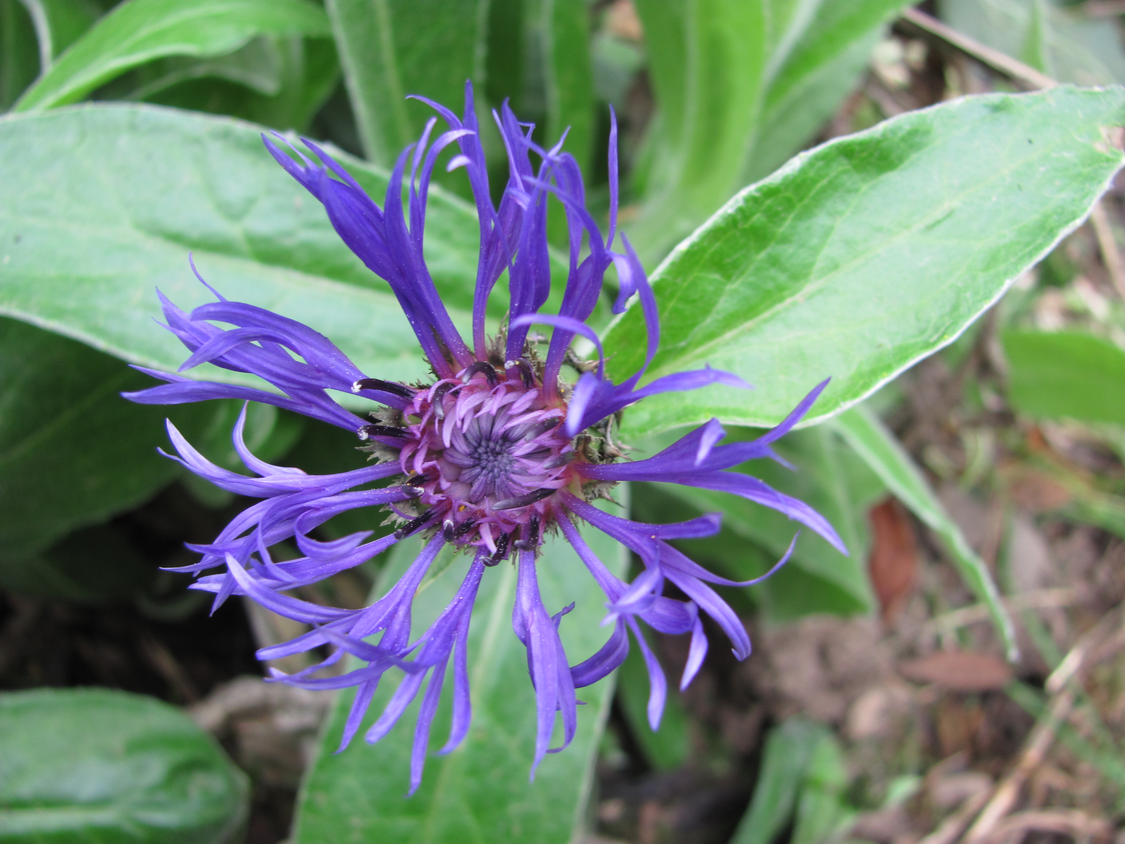 The blue flowers of the centaurea have been around for months with their delicately cut petals curling up from their dark purple centres above their soft hairy leaves.