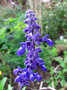 This is a hardy tough sub-shrub or woody perennial but the next blue flower is far from hardy – a salvia with intense blue spires atop dark blue stems with a metallic hue. We raised these from seed in the spring and have been enjoying their flowers since August. We must take cuttings to keep them over the winter.