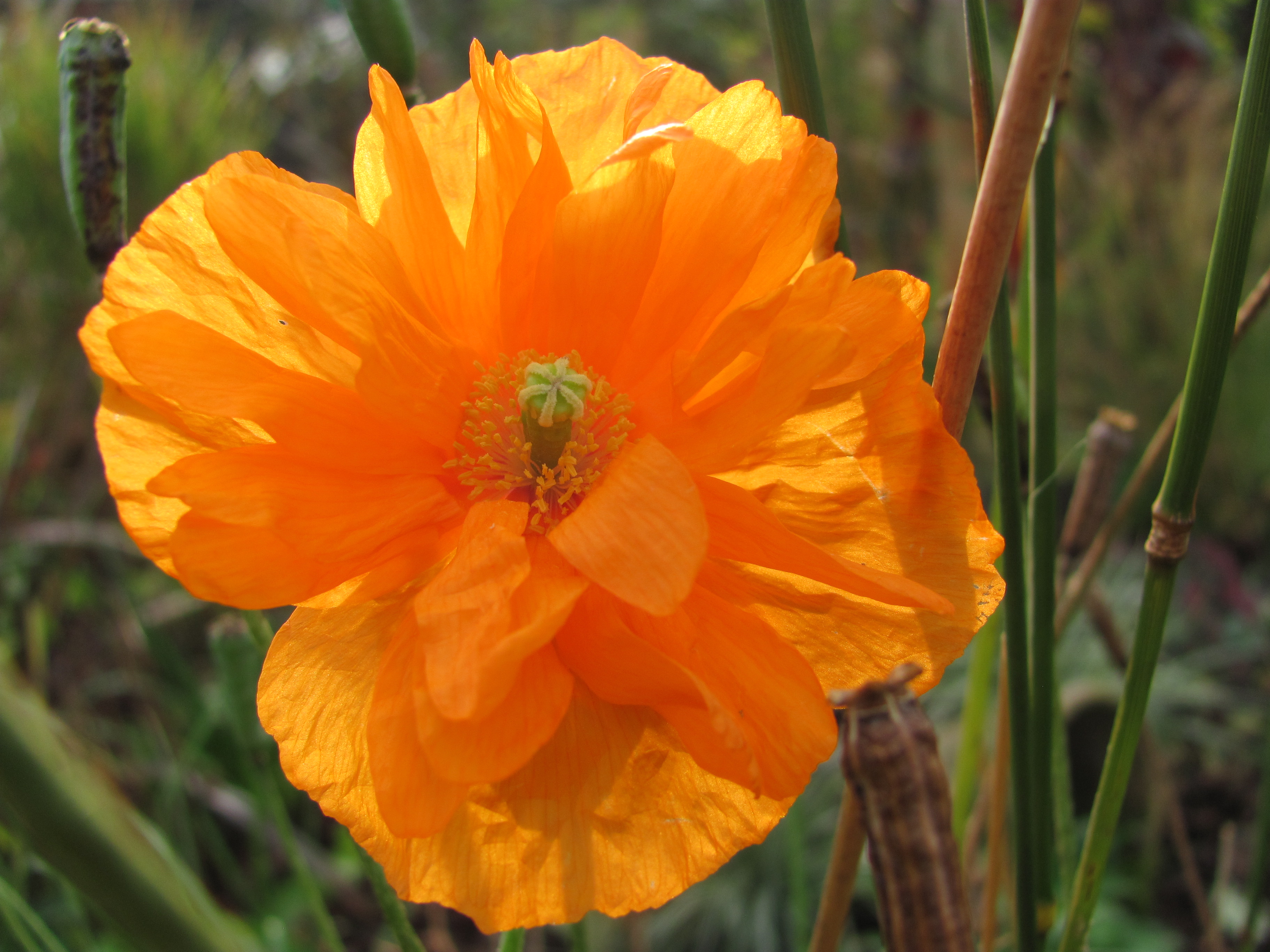 But the signs of autumn carried on all around us, the gentle watery song of the robin, the calls of redwing and fieldfare overhead. There are bonus flowers to appreciate too. Leading the way is the double orange flowered poppy, Papaver rupifragum. It simply shines. In bud it reveals a little of its silky amber secrets hidden within the tight hairy buds.