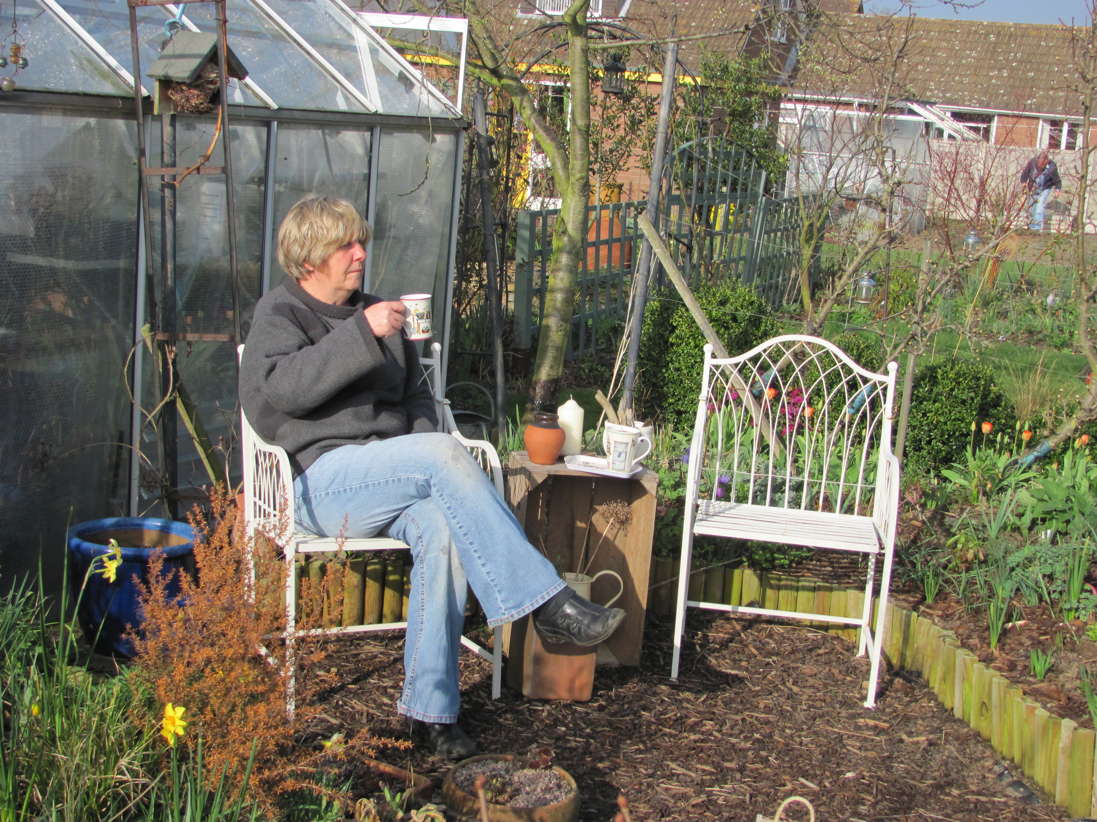 we can enjoy a cup of coffee in the garden without jackets on, and from our special gardening mugs,