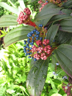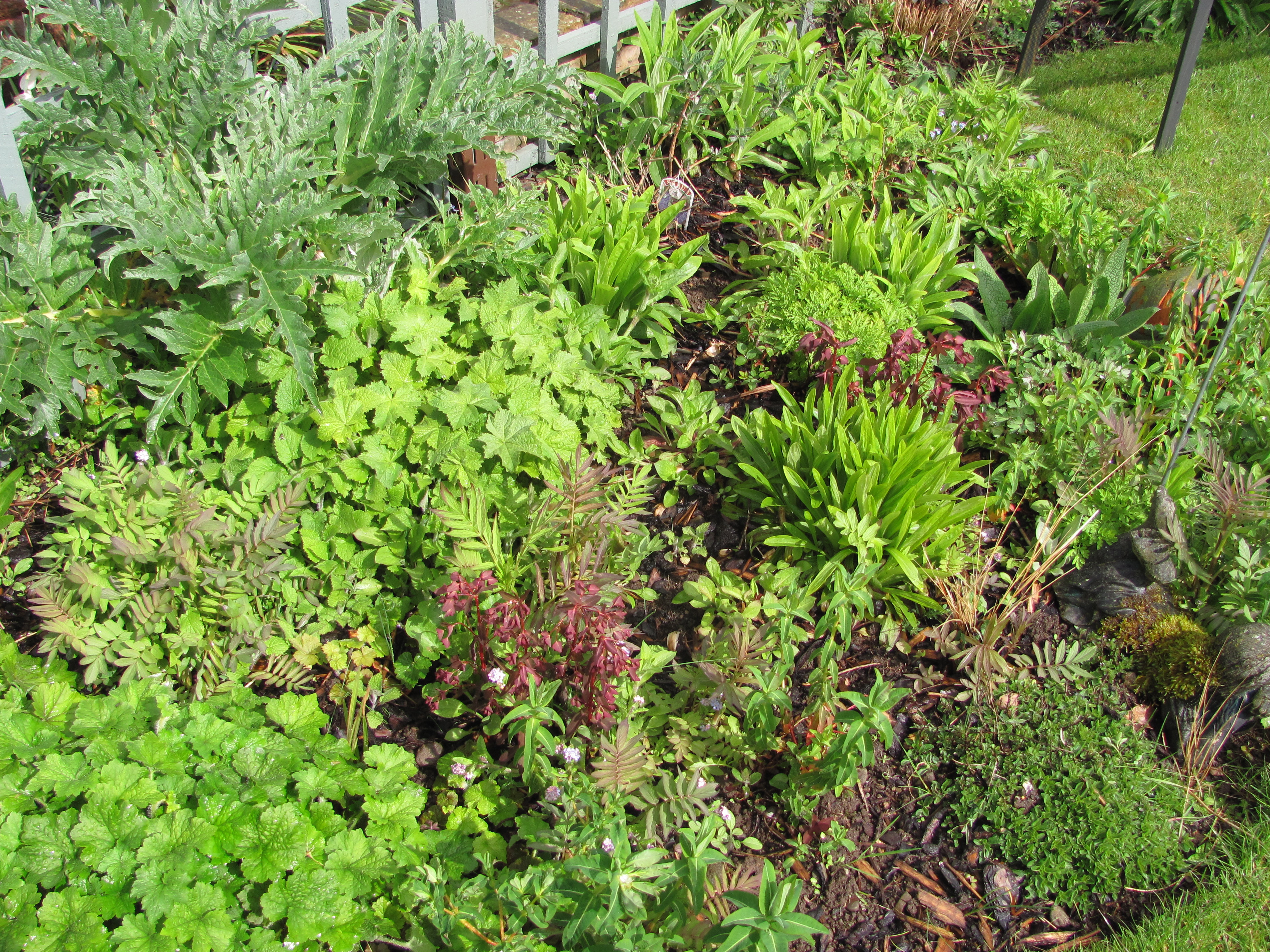 The benefit of all that rain after a year of drought in 2011 shows in the rapid growth of herbaceous plants in our borders. The greens look greener and the growth is lush and exuberant. The Trellis Bed looks so full after a few days of rain.
