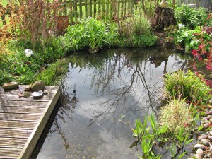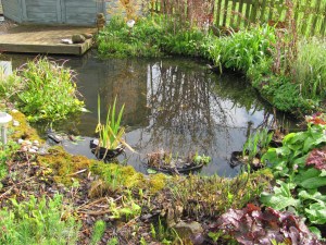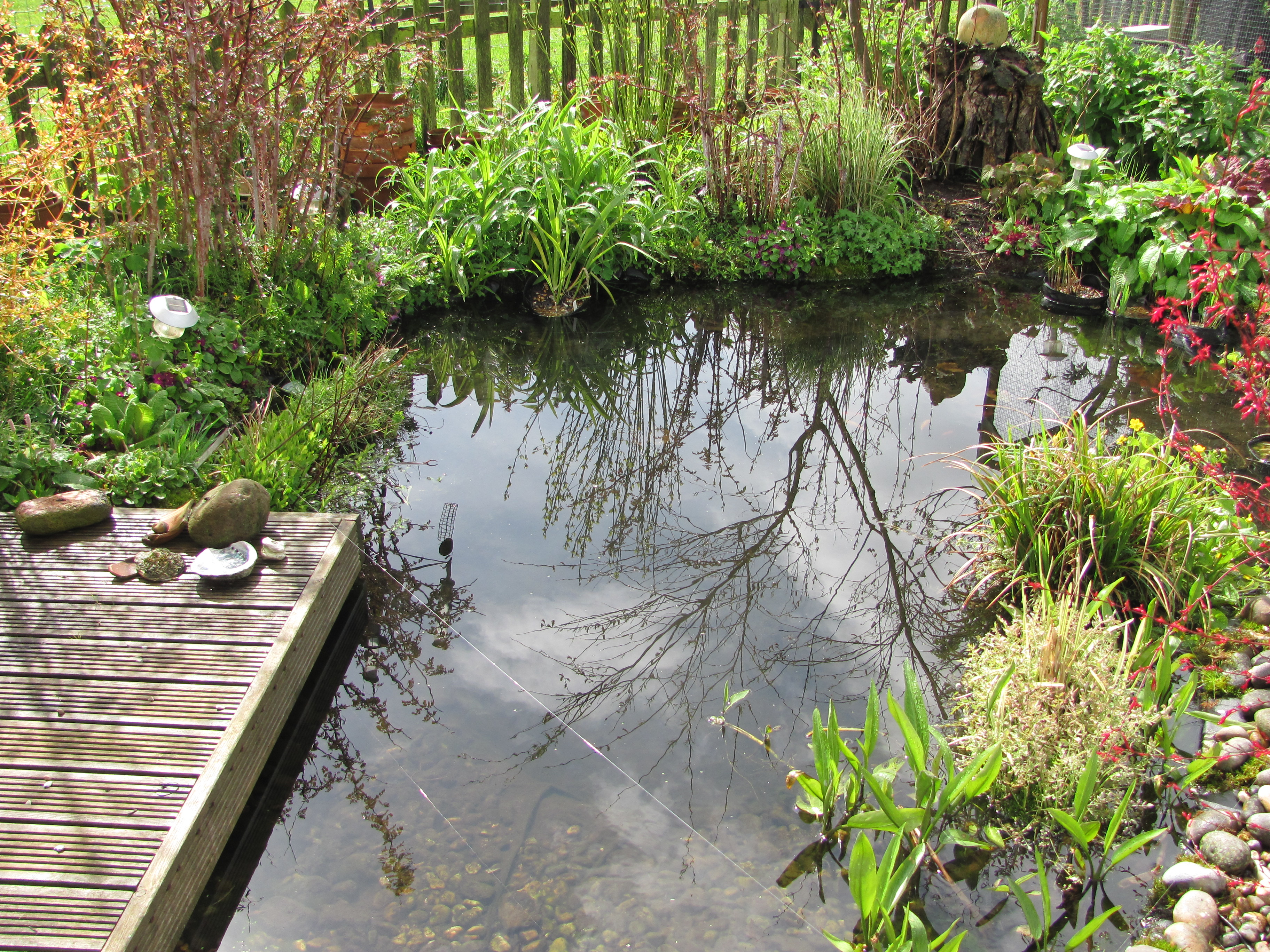 The photo below is taken from the decking end of the pool and shows how the rain has raised the water level right up to the deck, while the following one is taken from the bog garden end.