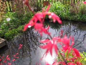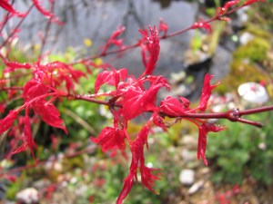 In the first photo we are looking through the fresh red leaves of a Japanese Acer at the wildlife pool.