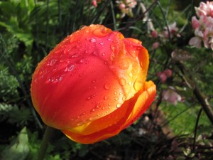 After days of heavy showers and longer periods of rain mixed with hail, the sun suddenly came out. The effect it had on the garden was magical – the plants looked healthier, the leaves greener and shinier and the colours of flowers intensified. Raindrops clung to foliage and blooms and reflected the light of the sun.