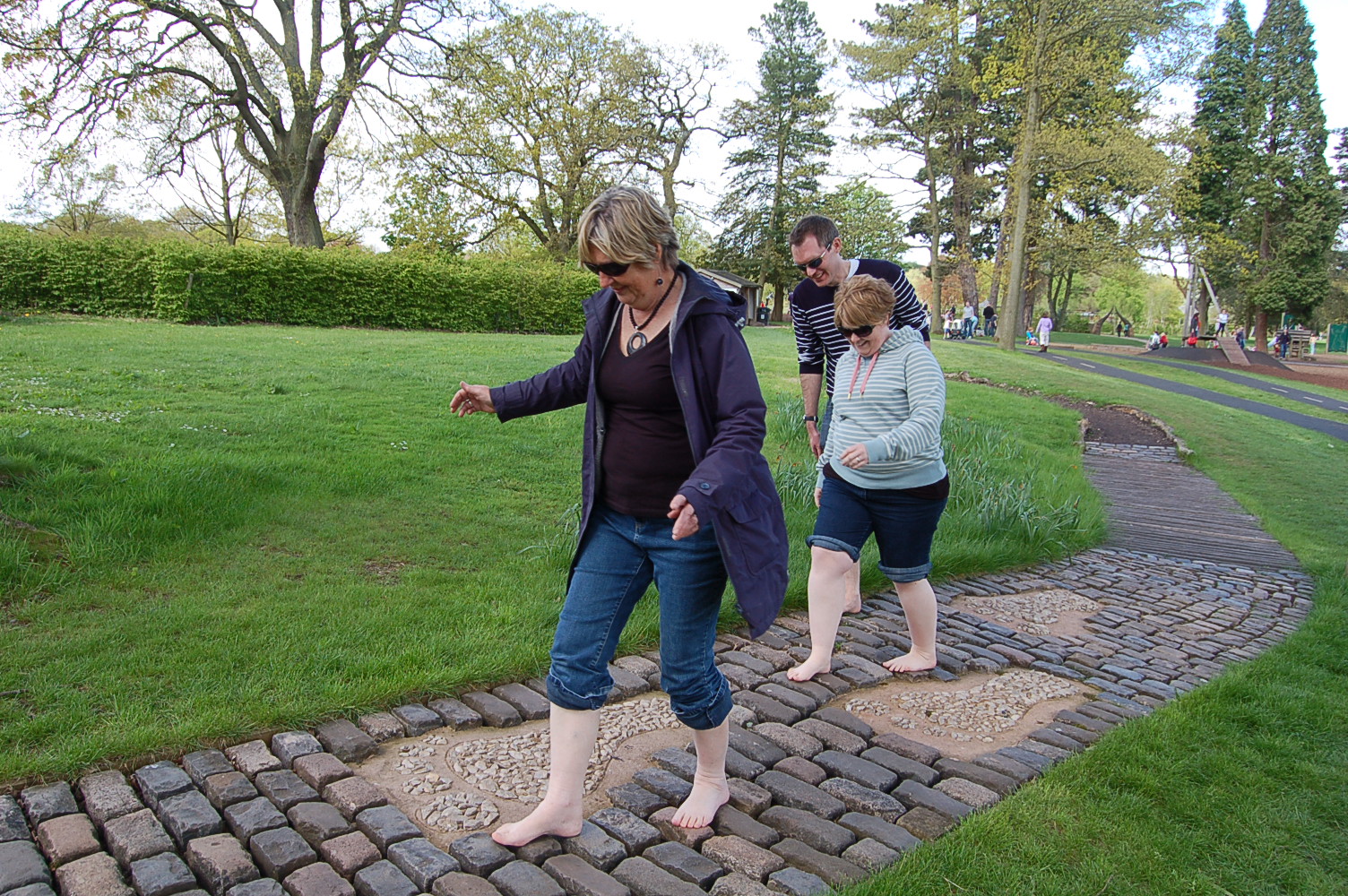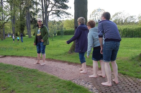 A brilliant design feature at this garden is having a most excellent coffee shop half way round. Should be compulsory! After refreshing ourselves we continued our wander but within a short walk of the coffee shop those of us who are young at heart were delighted to find a sensory walk. A ramble through the woods on a path made up of sections of all sorts of textured materials, bark, gravel, sand, tarmac and best of all a mud pool full of black sticky mud.