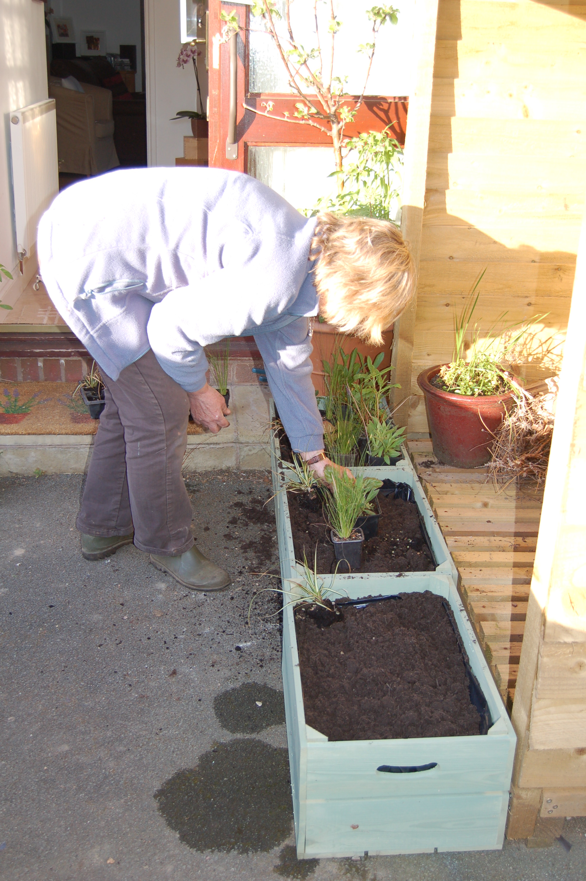 We bought three personalised planting boxes and a trug and went off to our favourite nursery, where after our usual coffee and carrot cake we bought a selection of perennials for the boxes and alpines for the trug. We bought 3 each of five different perennials and planted them out with our own seedlings of grasses which Jude had nurtured and brought on to suitable size. The perennial hardy herbaceous plants we bought were Catananche caerulea “Alba” with white flowers similar to cornflowers with the added interest of contrasting dark purple centres and yellow stamens, Salvia superba with its bright purple-blue spikes of flowers, Knautia macedonica with deep red “pin cushion” flowers, Veronica longifolia “Blue” the tallest of all with its elegant spikes held 3 feet high and the lovely white daisy Leucanthemum superbum “Alaska”. Fingers crossed now that they thrive in our boxes and give a warm welcome to our summer visitors.