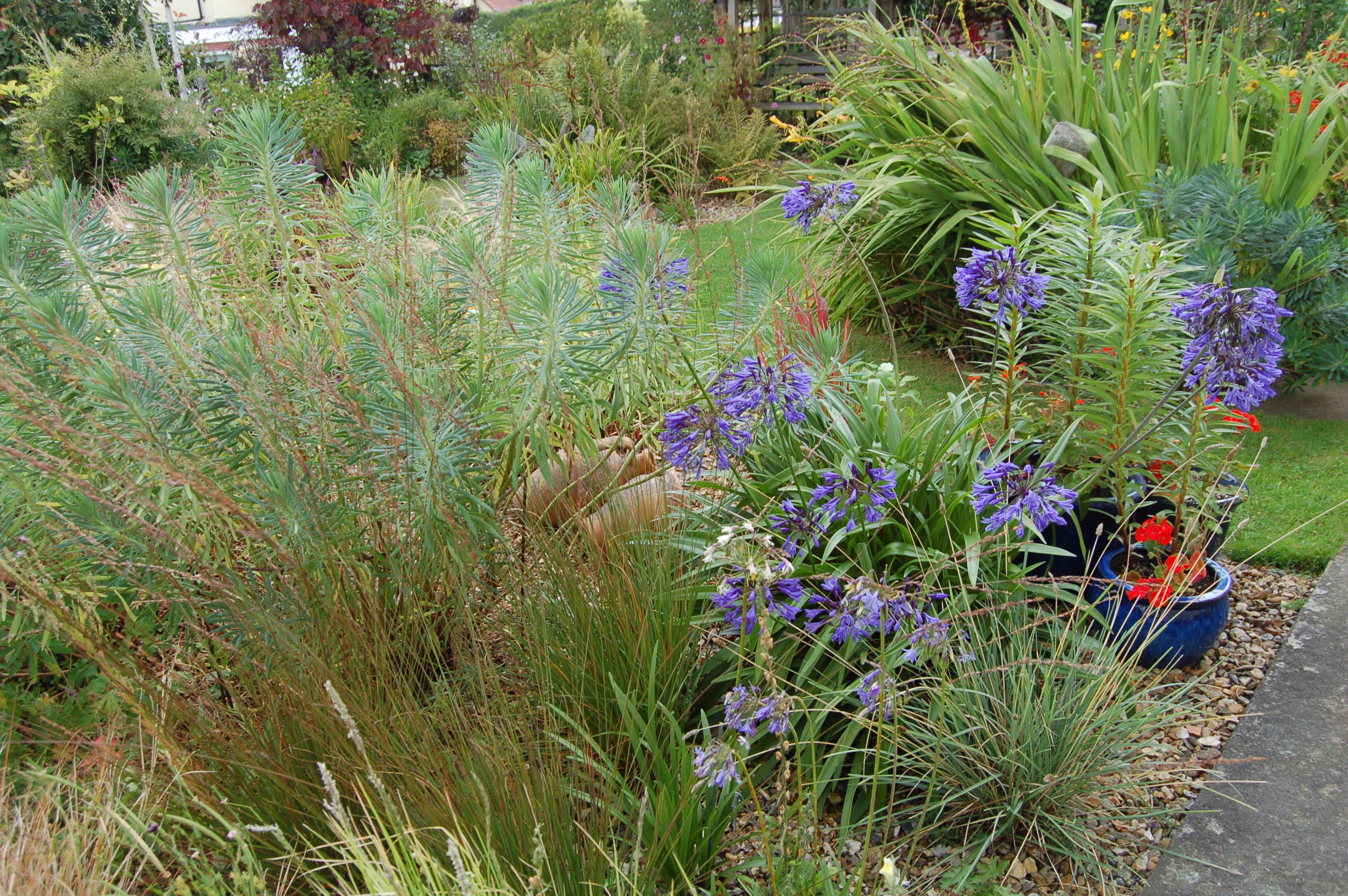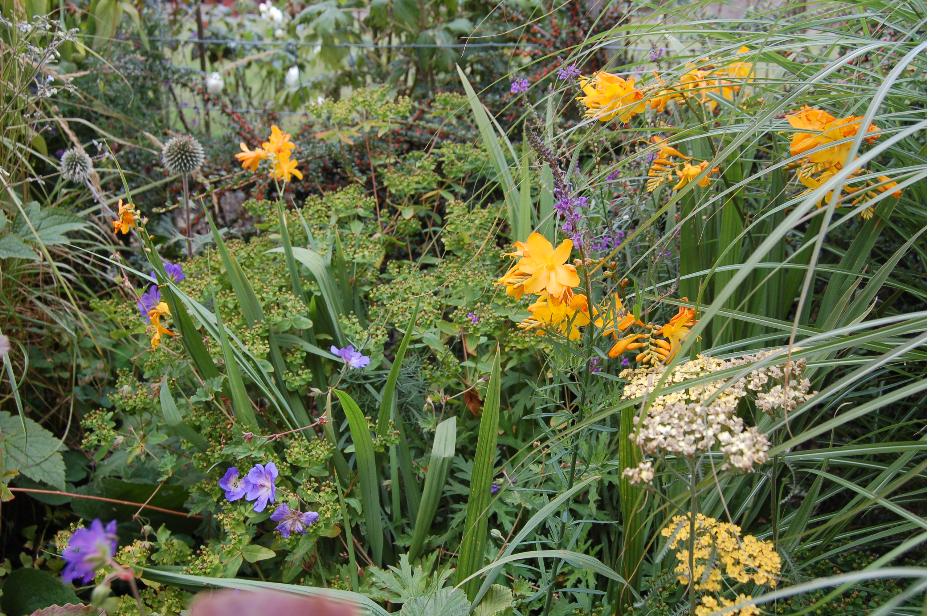 The pale blue fish continue to swim through the Seaside Garden. Behind the chimenia a bright yellow flowered crocosmia seems to glow beneath the standard holly.