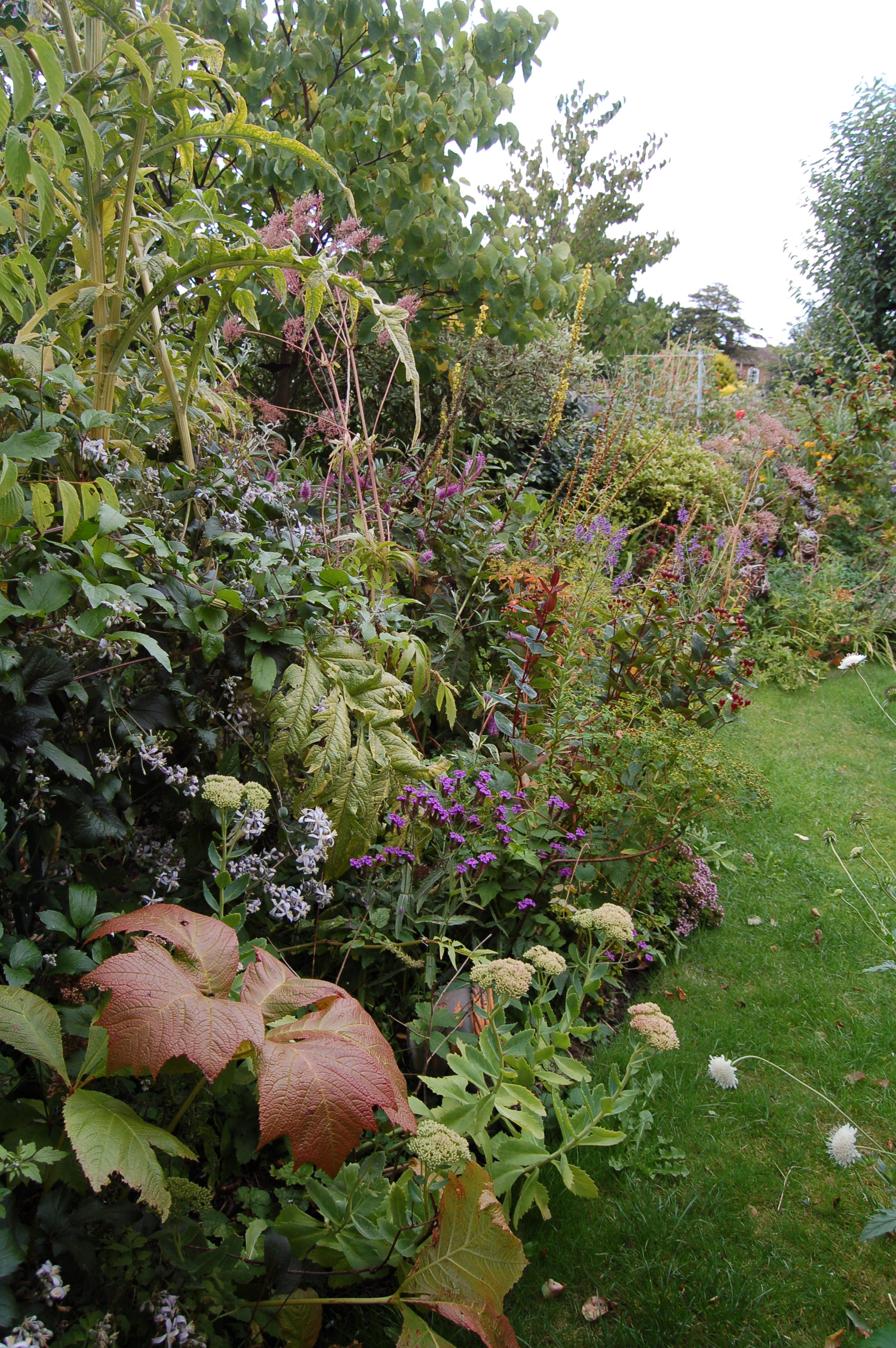 The other front garden borders still have patches of colour with the Perovskia’s pale blue flower spires looking good in a patch dominated by the white barked silver birches and purple leaves of Cercis Forest Pansy, Sambucus nigra Black Lace and Physocarpus Diablo.