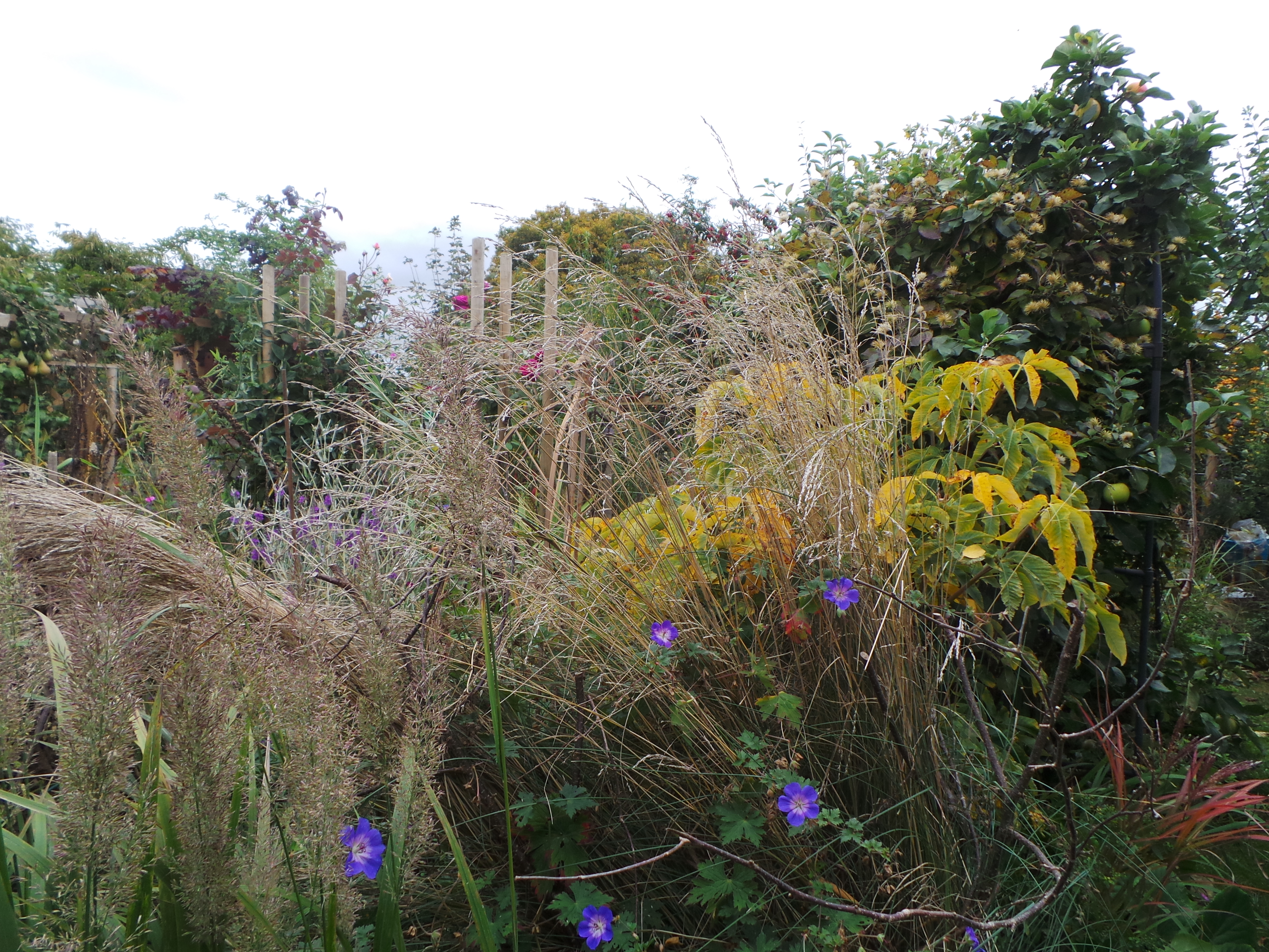 The whispy seedheads of mixed grasses provide a perfect foil for Geranium Rosanne. Behind our Chestnut beings to yellow.