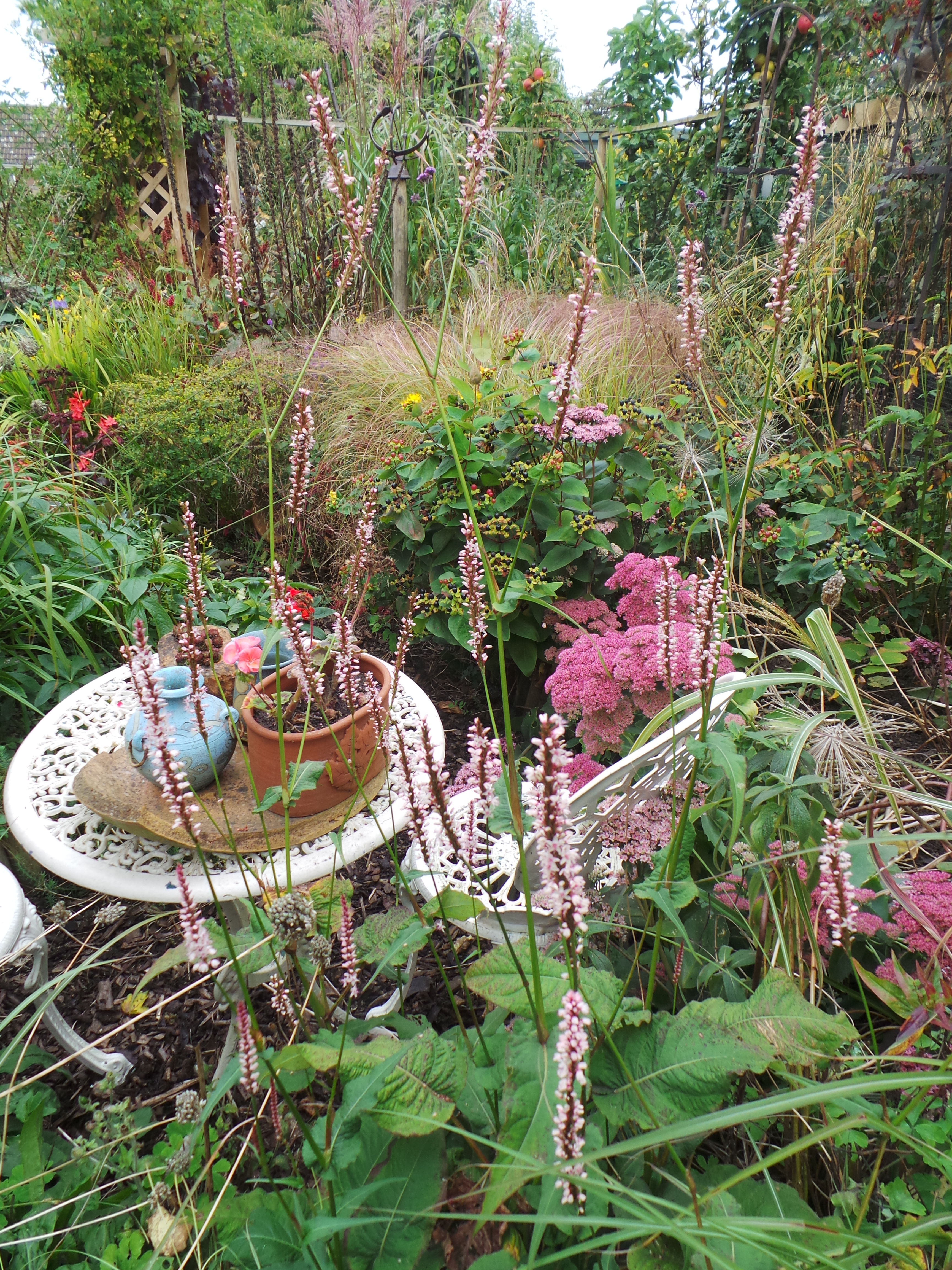 A second view of the Chicken Garden through Persicaria amplexicaule Alba.