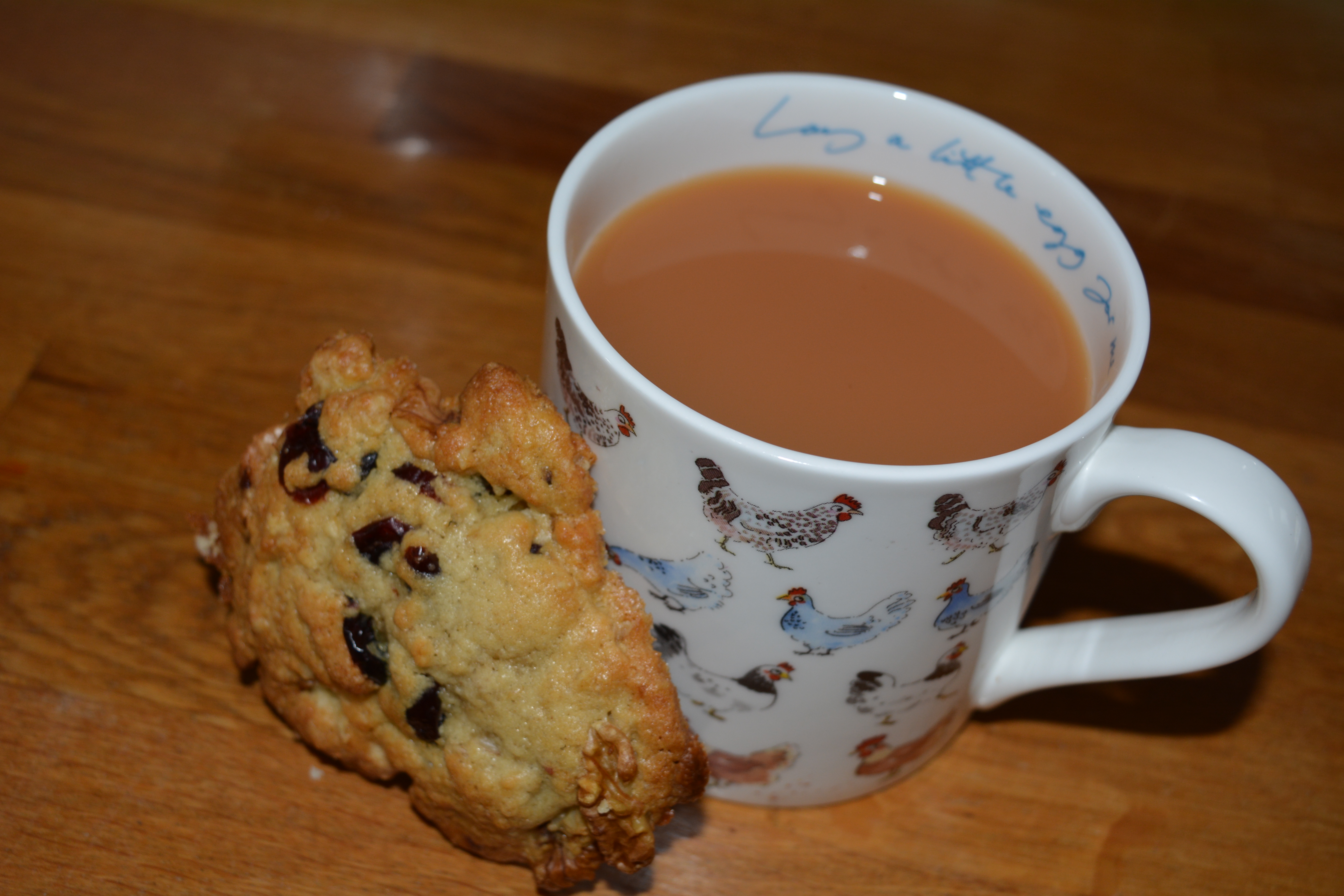 They smelled wonderful as they were baking and looked wonderful when cooling on their trays. Best of all though they tasted wonderful with a big cup of Clipper Tea drunk from a porcelain mug with chicken decorations! Nice present!
