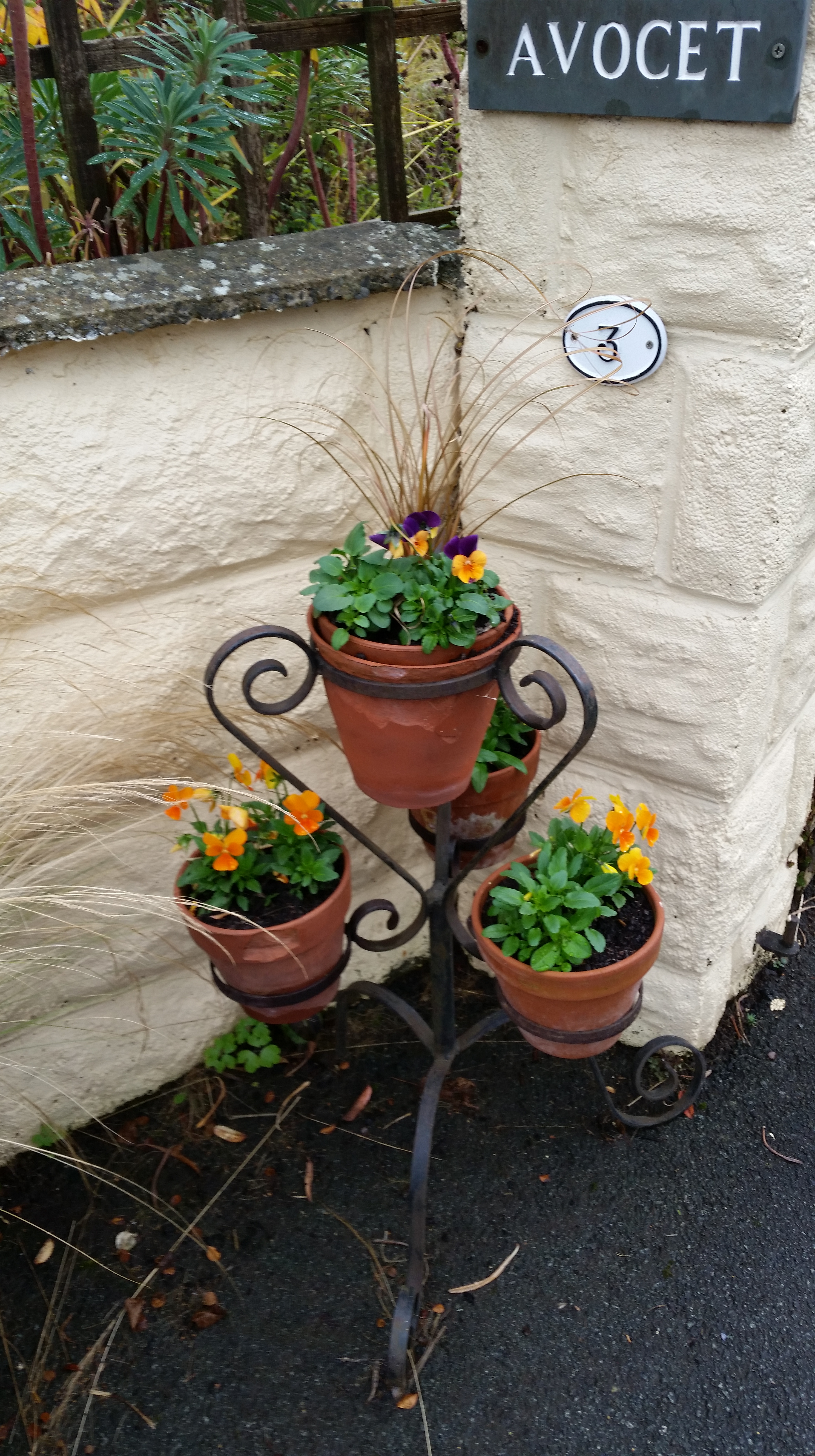 First job was to plant up the terra-cotta pots in the wrought iron plant stand with purple and yellow violas and some of our seedlings of our bronze evergreen grasses.