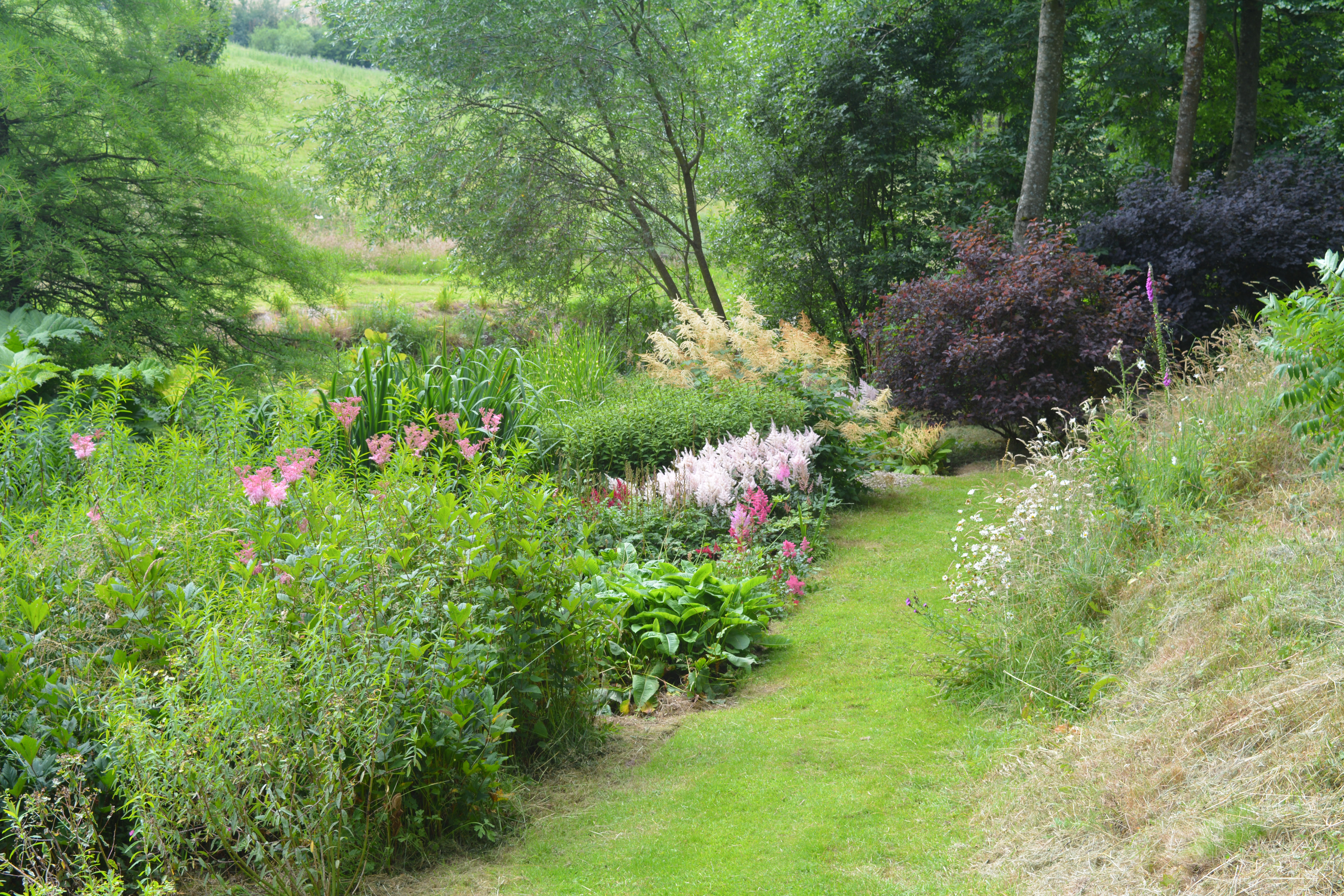 We love to visit our fellow Yellow Book gardens and then sharing them with you. In this post we will share our visit to Hill House Farm, another Herefordshire garden gem. We visited back in July. We liked the description presented in the NGS book, which enticed us to wander slowly down a long gentle slope through shrub and tree plantings in grass with closer cut paths marking the way down to a wildlife pool 200 feet below. Knowing that the garden had been developing for 40 years already gave added interest, as these gardeners were obviously thinking about and doing things in their garden. All good gardeners will never stop learning!