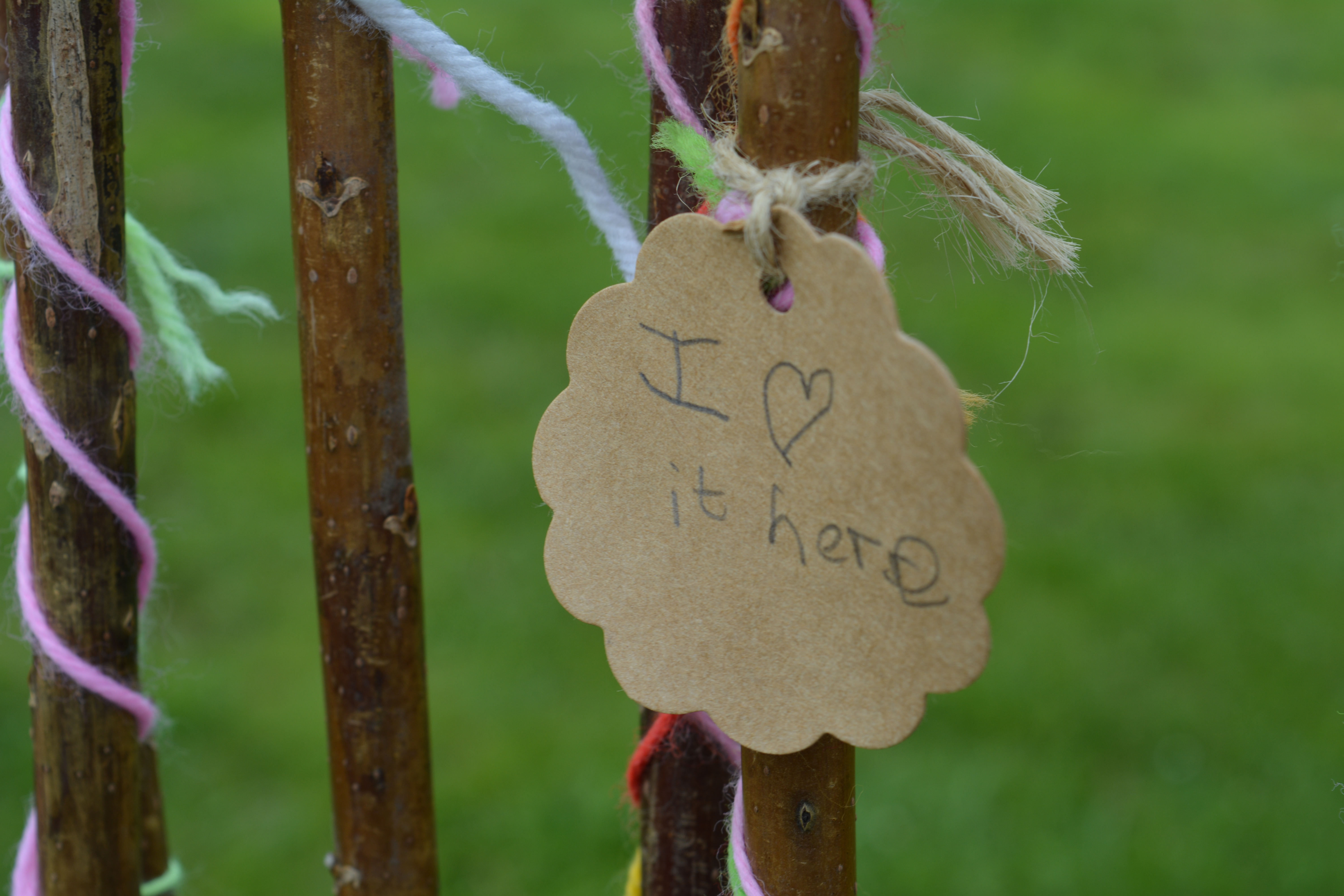 Tall willow wands were attached to a wooden fence and they were decorated with coloured wall. Children had written their thoughts about Attingham Park on card labels and tied them to the uprights. We enjoyed reading them greatly.