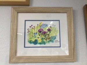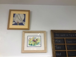 And here it is framed and on daughter and son-in-law, Jo and Rob’s wall. The left hand pic shows it alongside my brother, Derrick’s pastel drawing of a magnolia.