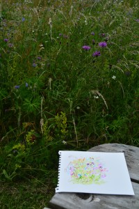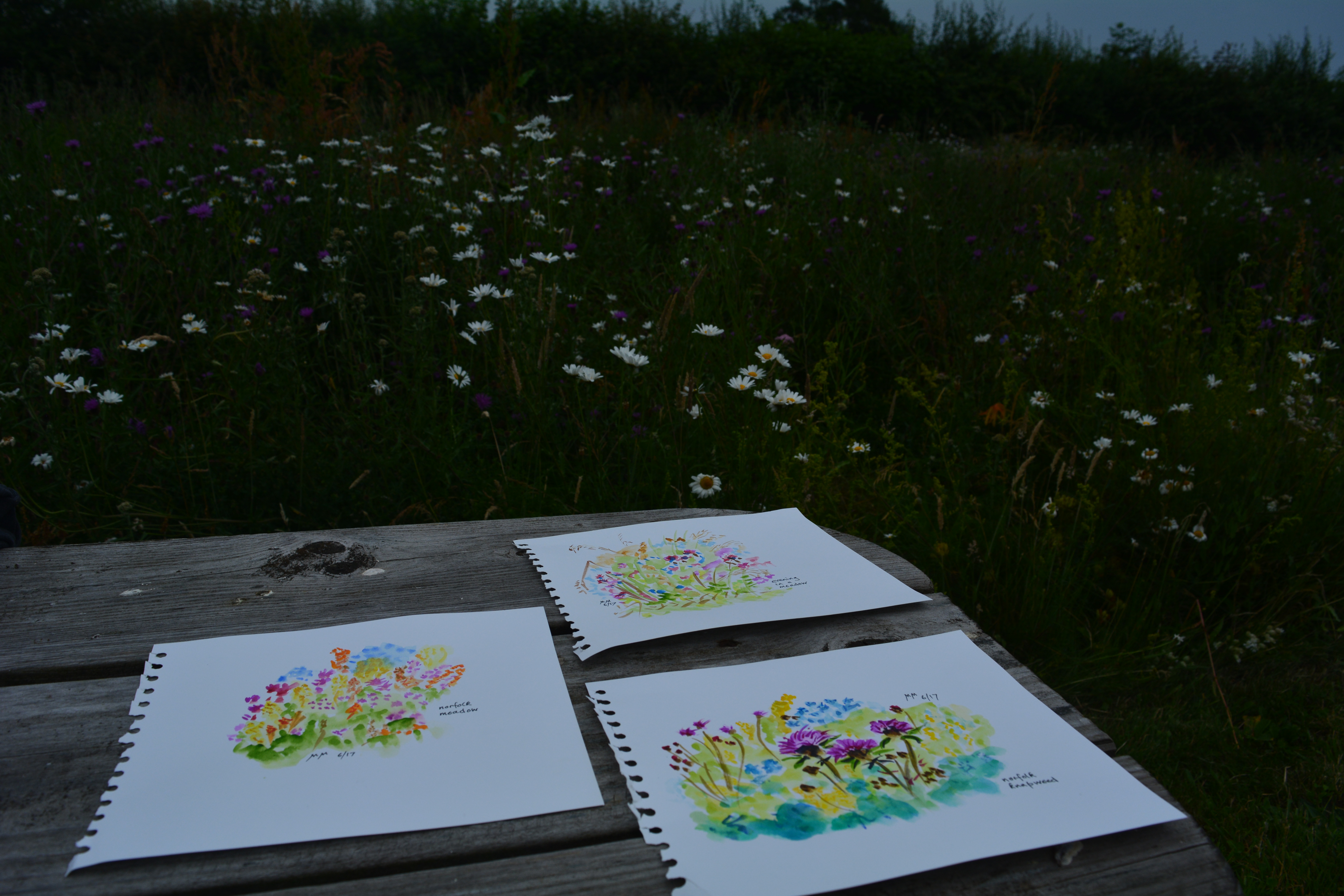 I decided it would be a challenge to paint the flowering meadow sat in the picnic bench in the very centre. So I set up my gear and had a go.
