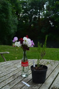 We ate outside as often as possible on a terrace overlooking a small lake surrounded by mature, native trees, Alder, Ash and Oak. These trees were favourite haunts of owls who entertained us with their calls as light faded each evening. We brought the sweetpeas back from Houghton Hall, where they grow in the walled garden and visitor are invited to use the scissors and string provided to pick and tie a bunch. The Lavender, a Dutch Lavender, in the pot we had bought from another garden we visited. It is now planted at home.
