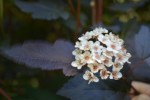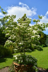 A Cornus kousa on the lawned area loked at its best, with creamy white bracts covering it from head to toe. The light emphasised the shapes and textures of quite ordinary trees ans shrubs lifting them above their normal character, including this tall conifer and the little Box shrub.