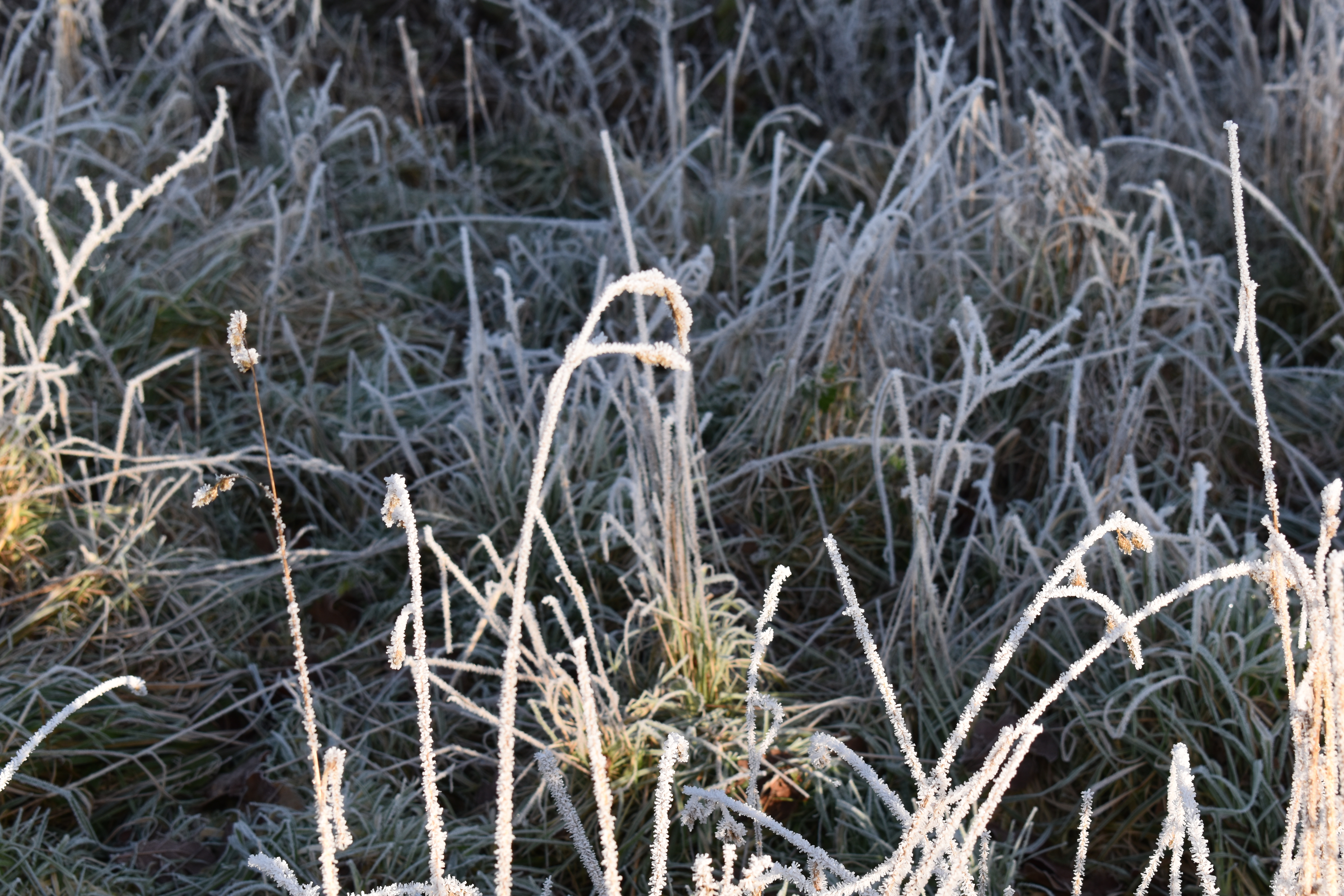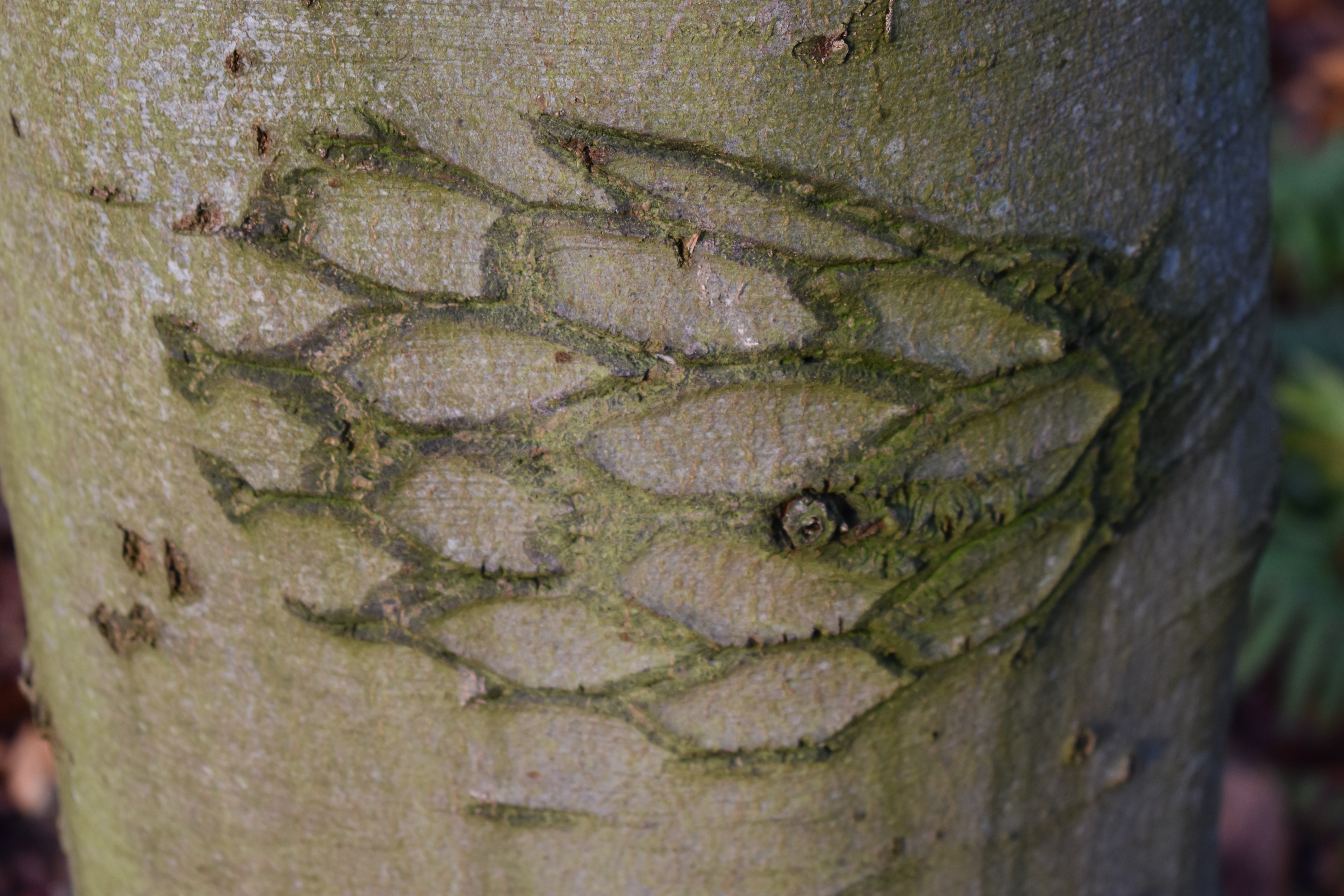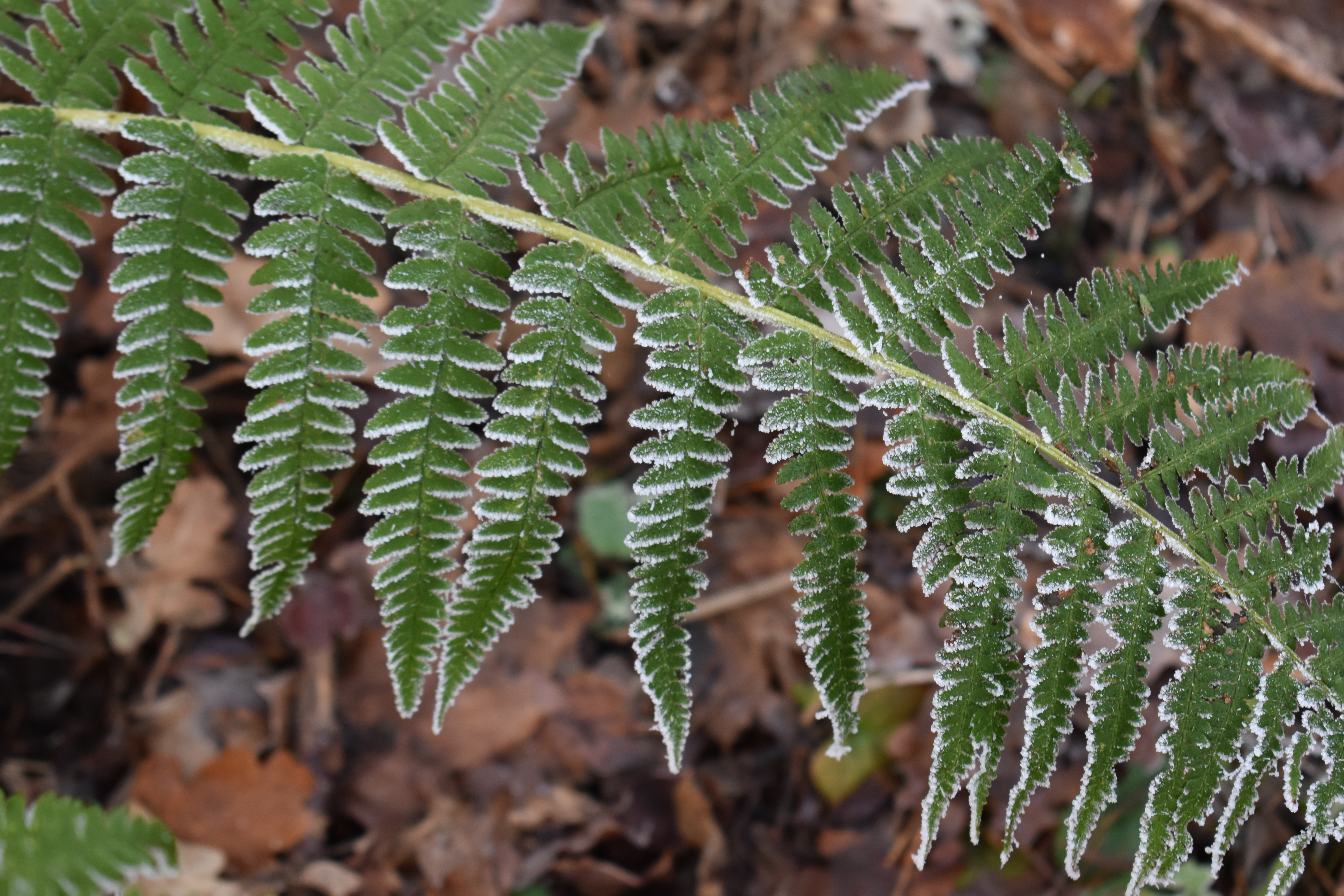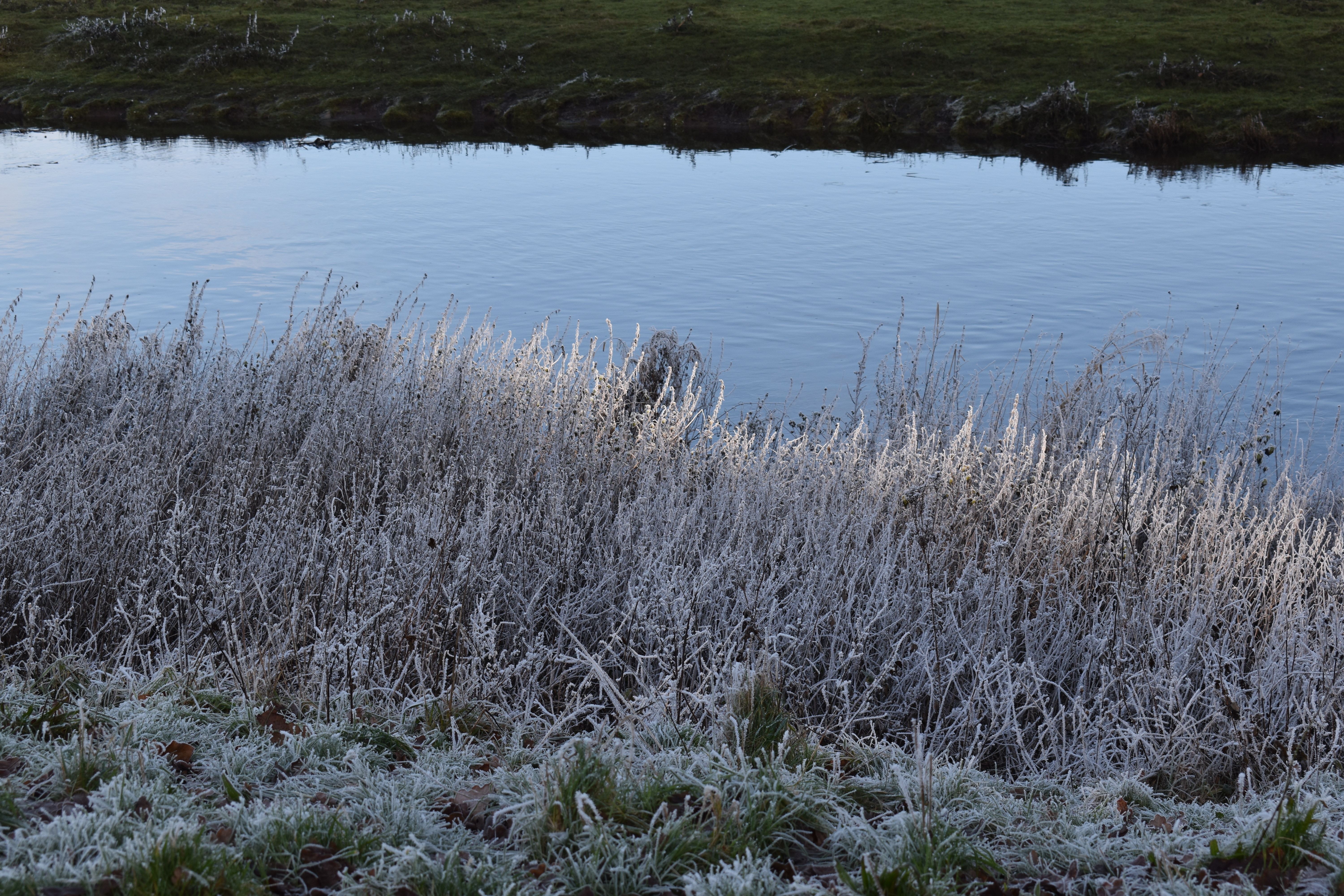 Droplets of melted frost hung delicately from fine twigs but at ground level frost still covered fallen leaves. The strange pattern on the tree trunk in the last photo in this block was a real mystery to us. We could think of no explanation for it.
