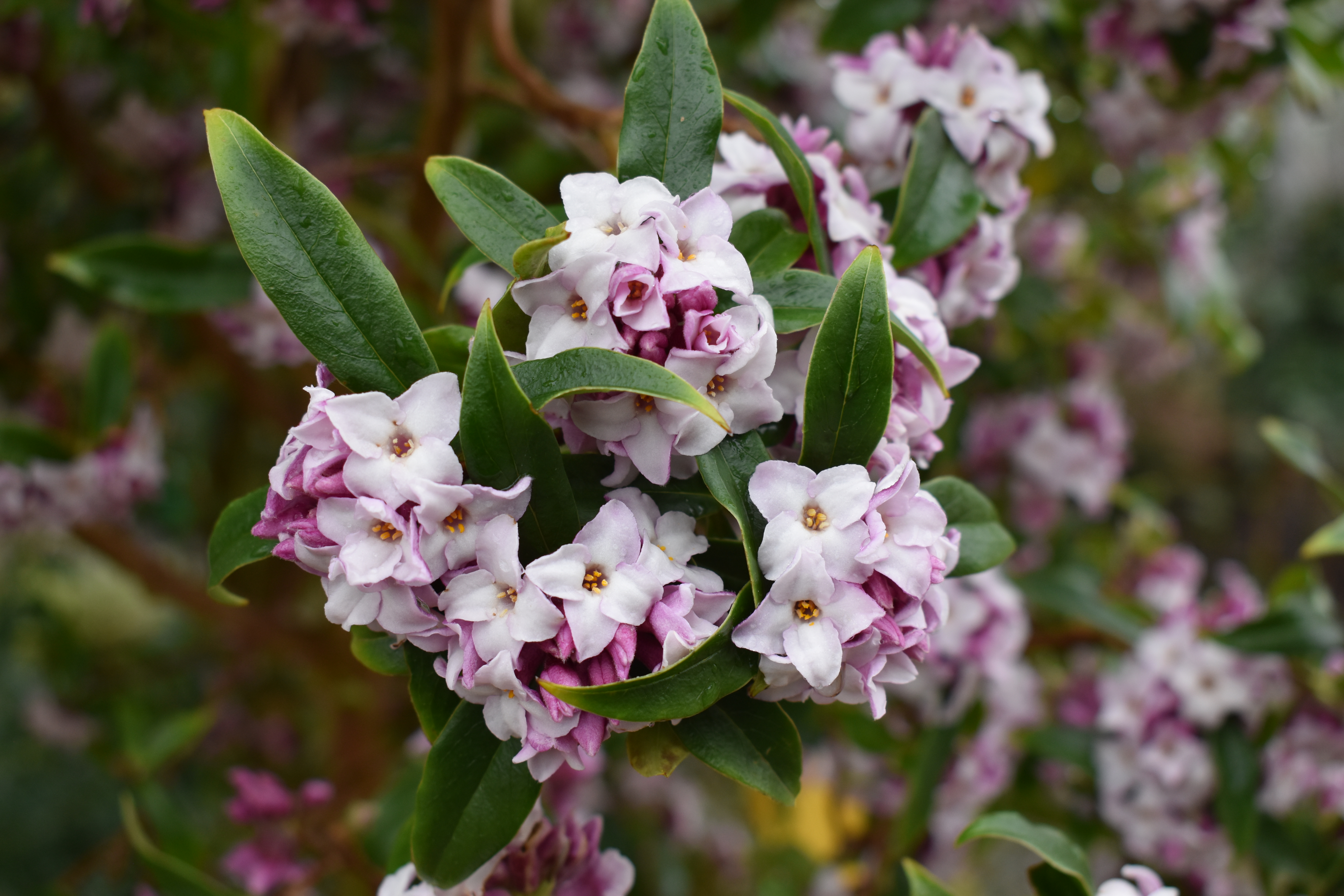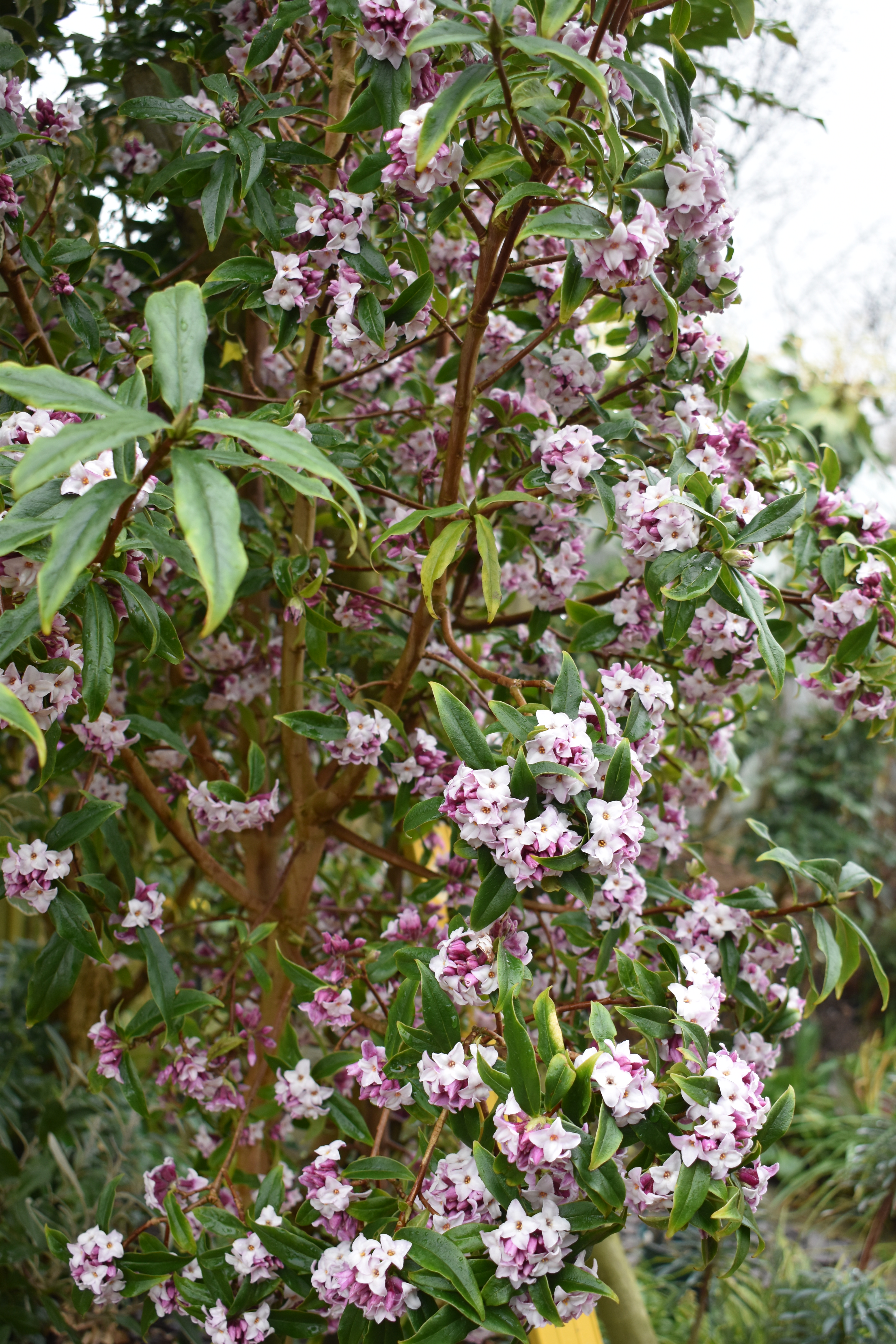 The first set of photos illustrates our Daphnes, D. bhuloa ‘Jacqueline Postill’, which I think emits the best aroma of all winter flowering shrubs. This year it is flowering better than ever with bigger clusters of flowers and far more of them. we grow it in the Winter Garden close to the conservatory and alongside a path to get best value!
