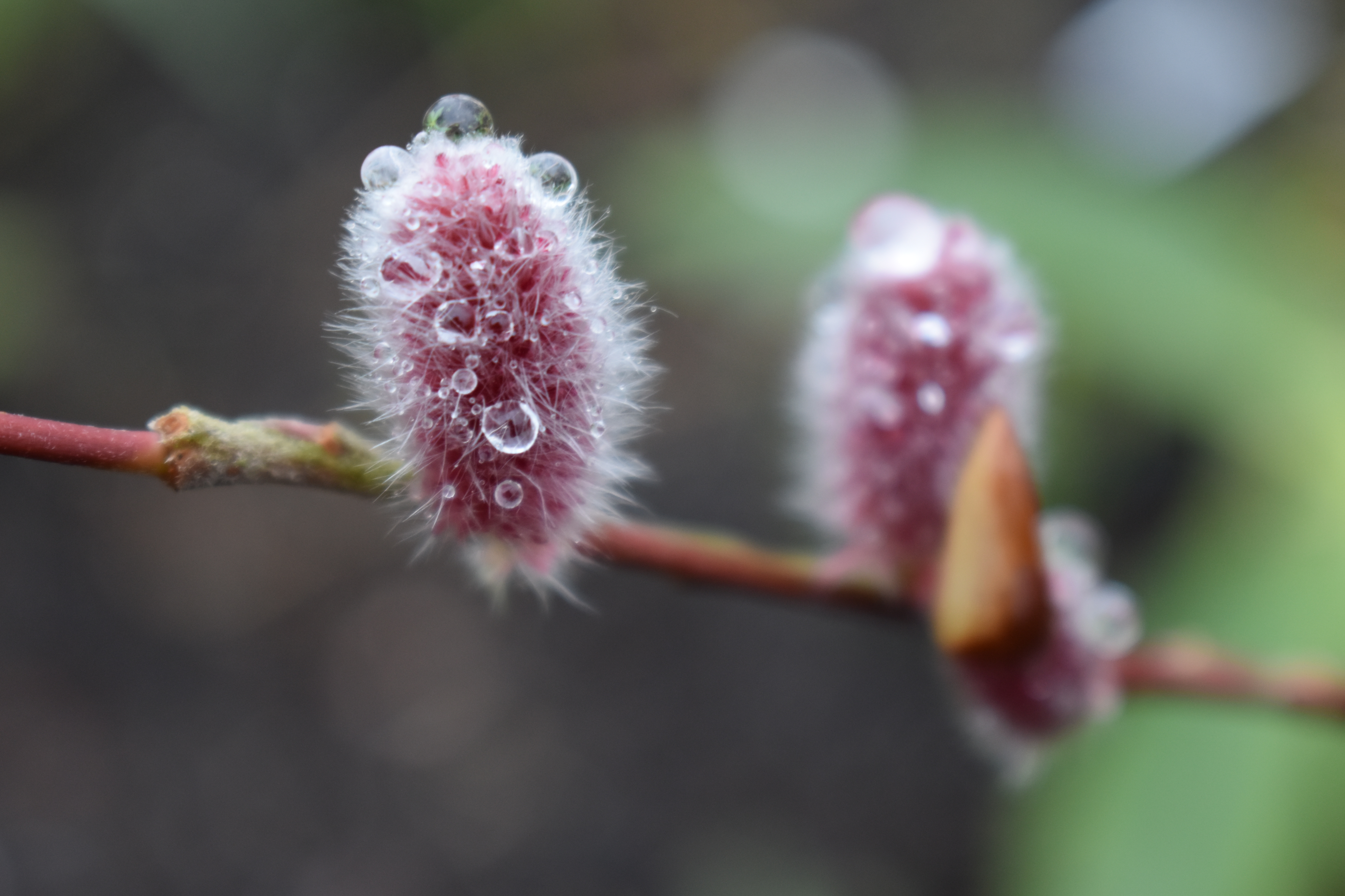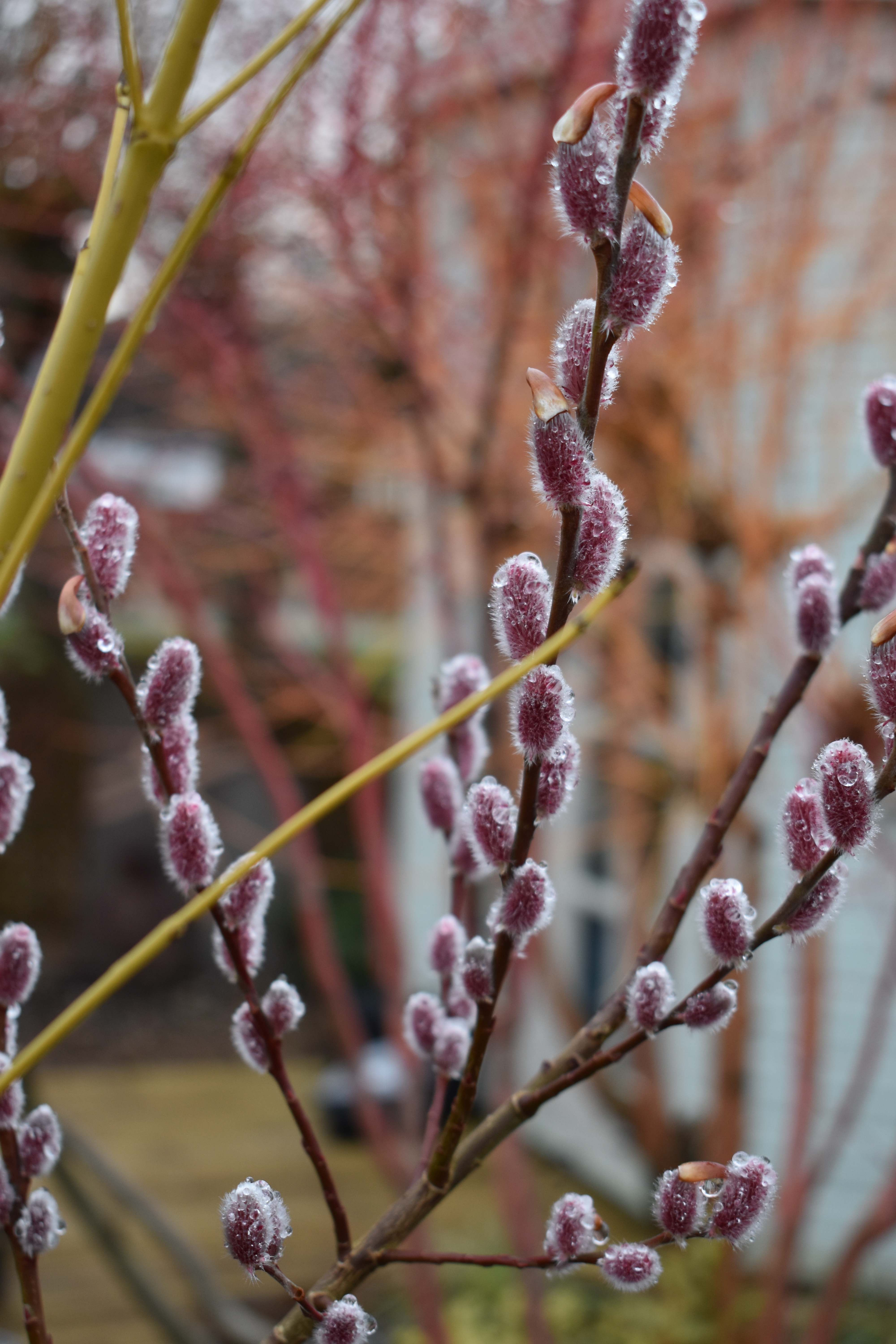 We grow lots of different willows in our garden which look good in the garden in winter, either for their coloured stems or for their beautiful catkins. My favourite is Salix gracilistyla ‘Mount Aso’ with catkins of dusky pink and grey as featured in the first 3 photos below. I took these photo just as a shower stopped and the catkins caught droplets on their hairs adding an extra dimension to this willow’s beauty