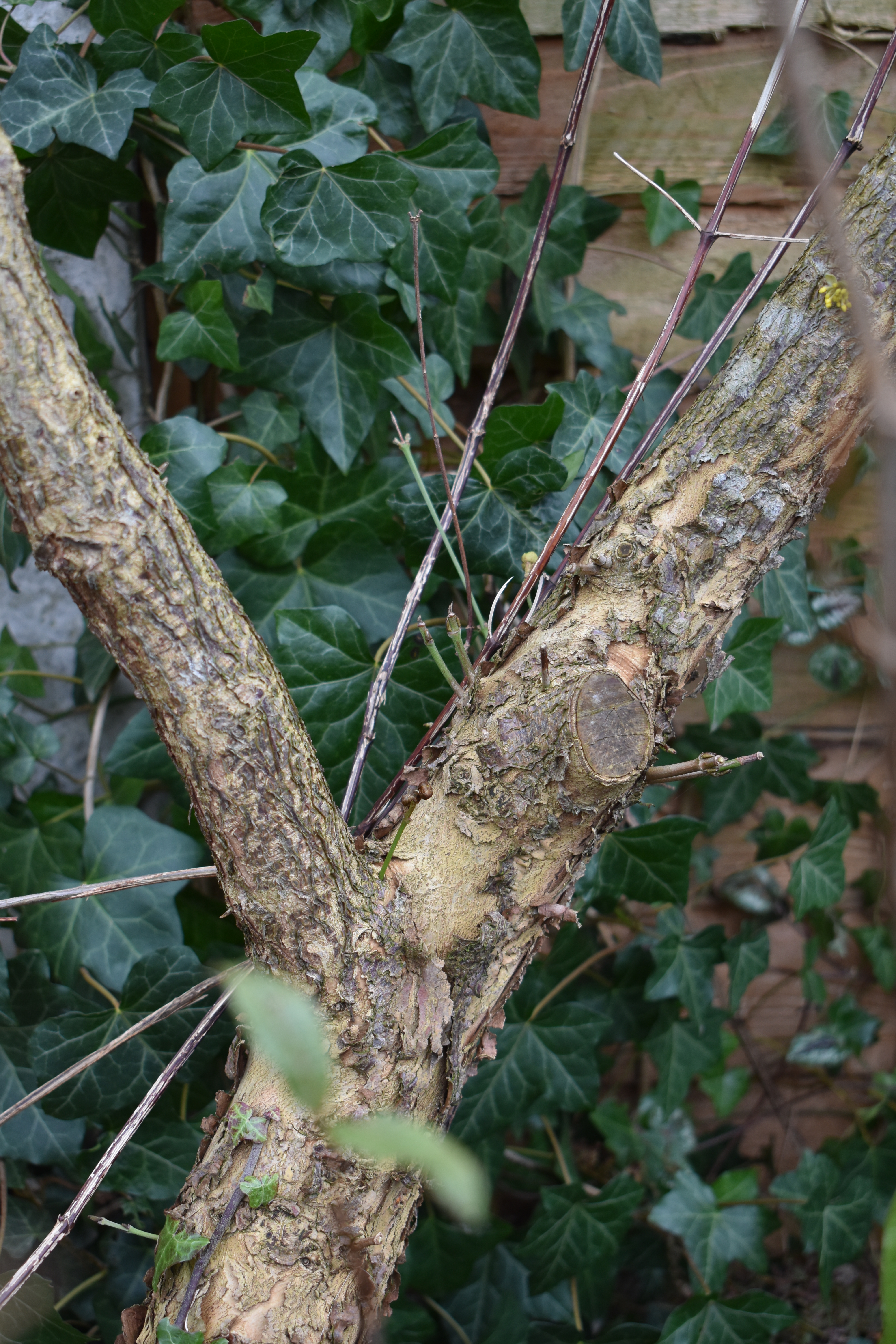 When we are washing up we can look out of the kitchen window and see the wonderful Cornus mas, commonly known as the Cornelian Cherry. It is such a cheerful flowering shrub with its bright yellow-green scented flowers which open on bare stems and give us weeks of interest. Later in the year these flowers are followed by red coloured grape-like berries, which once fallen to the ground re loved by blackbirds. It has the extra bonus of beautifully textured bark too.