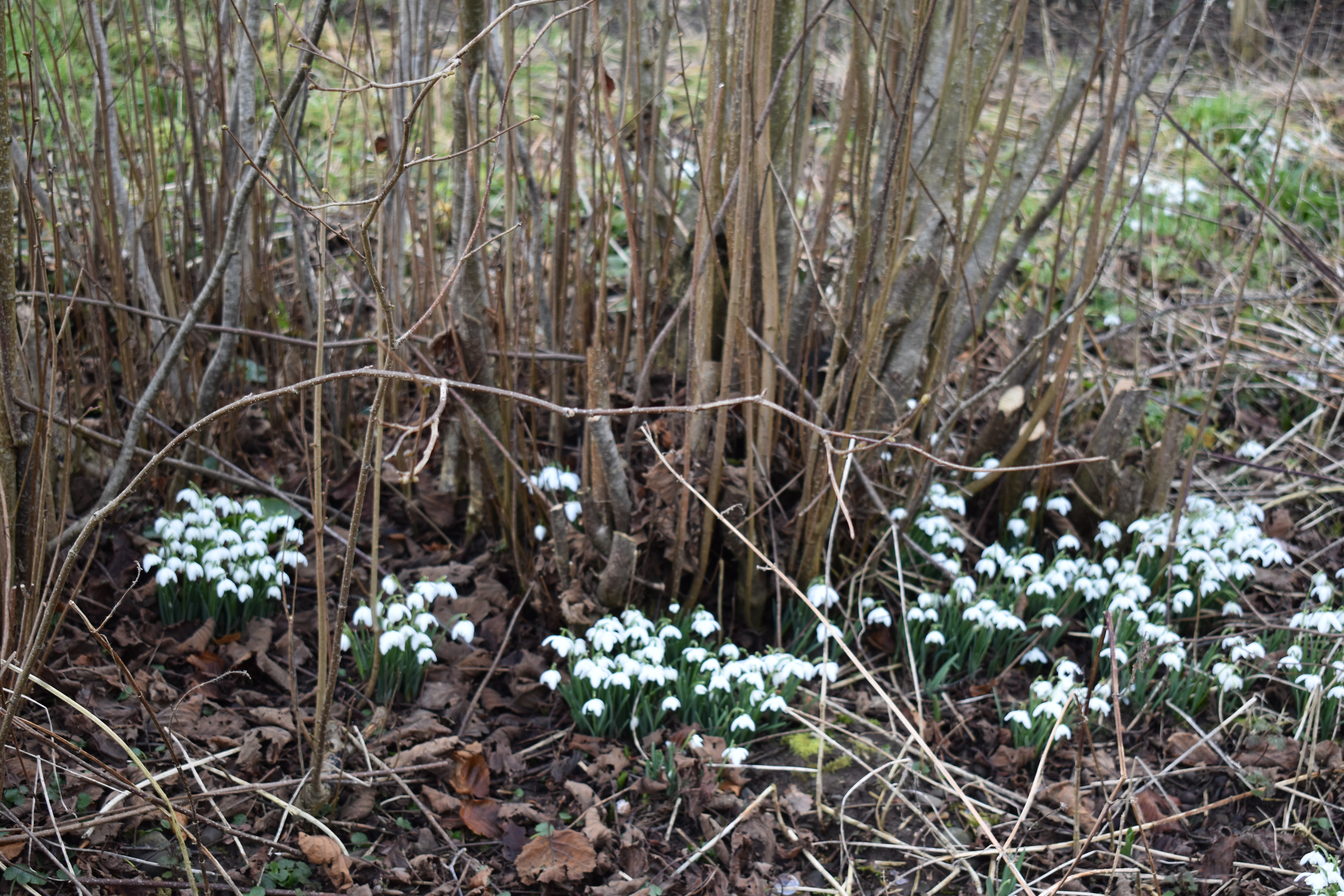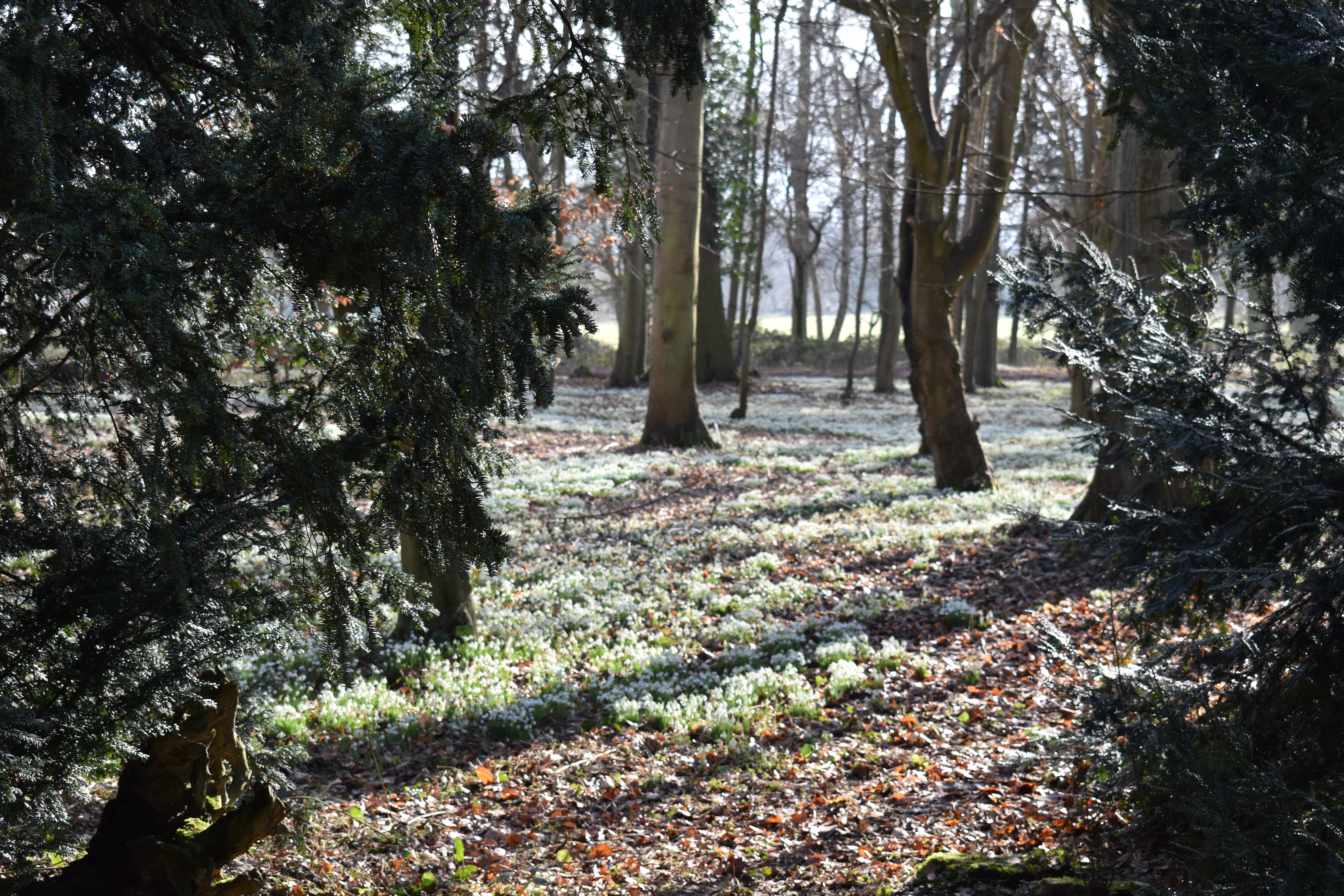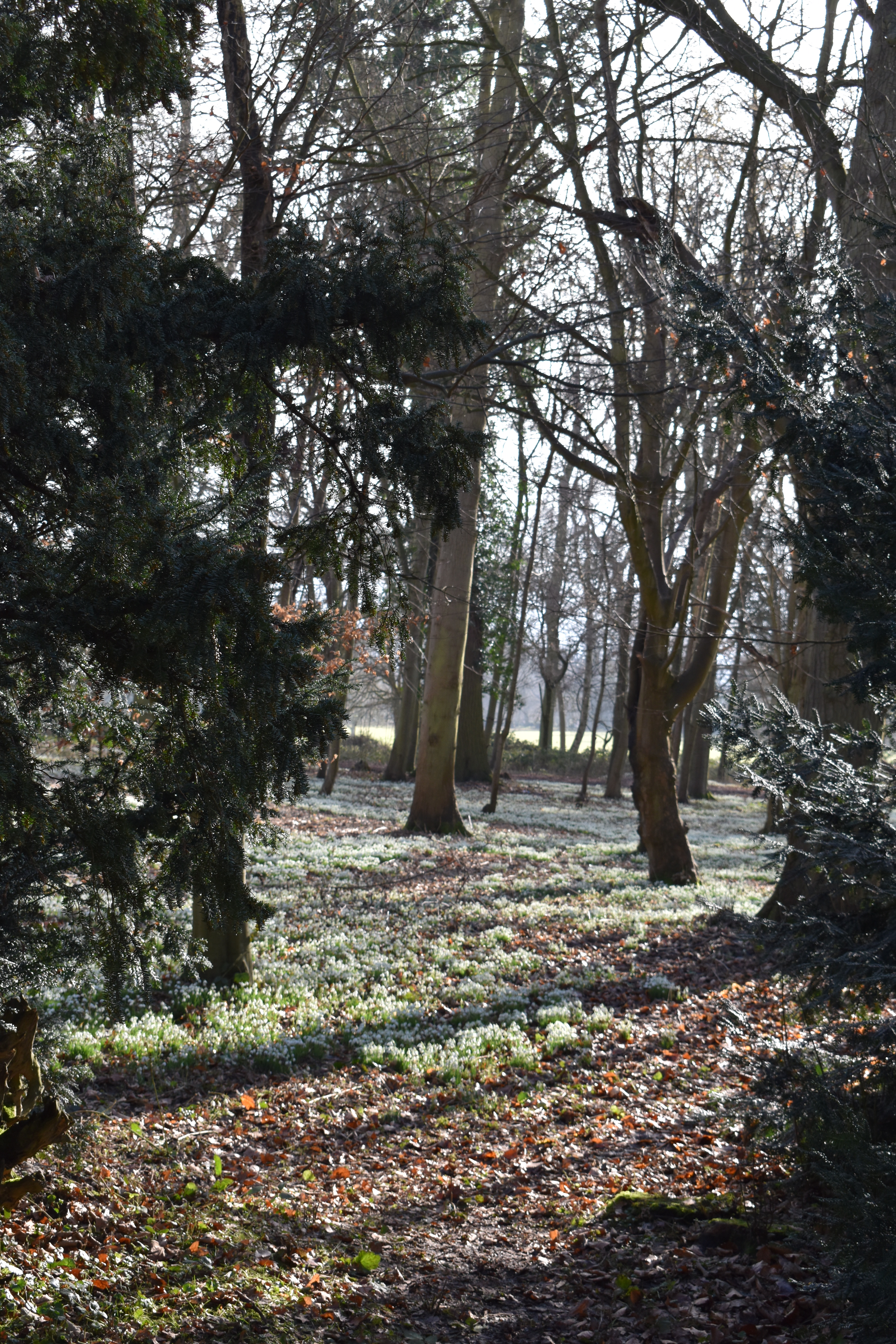 We hadn’t walked far when we wandered through a grove of young yews, Taxus baccata. The low winter sunshine lit up new needles on the ends of many branches, giving bright green against deeper tones. On lower branches the sunlight gave a sheen to the upper branches and beneath and between patches of pure white from snowdrops (Galanthus nivalis) glowed boldly.