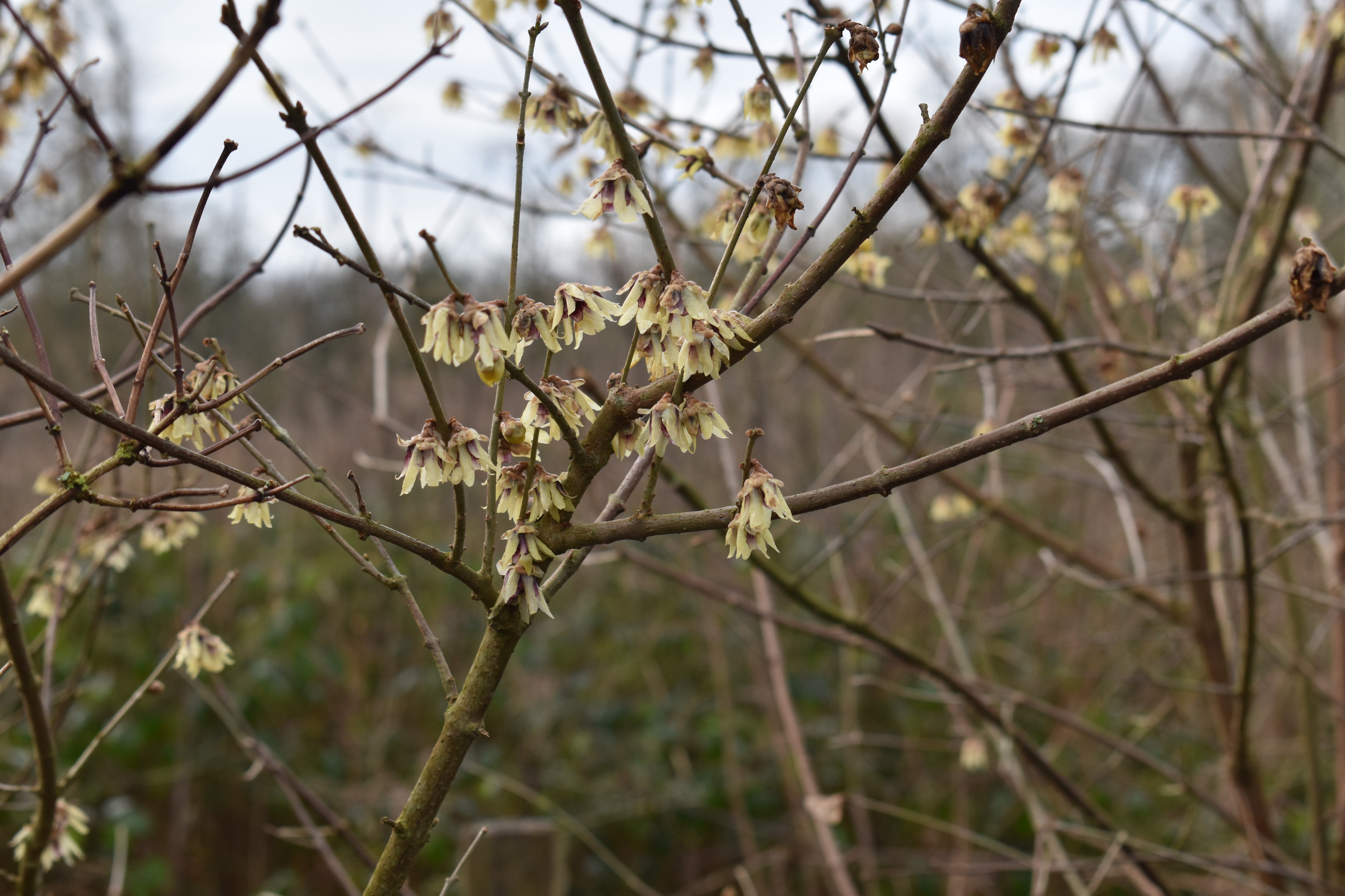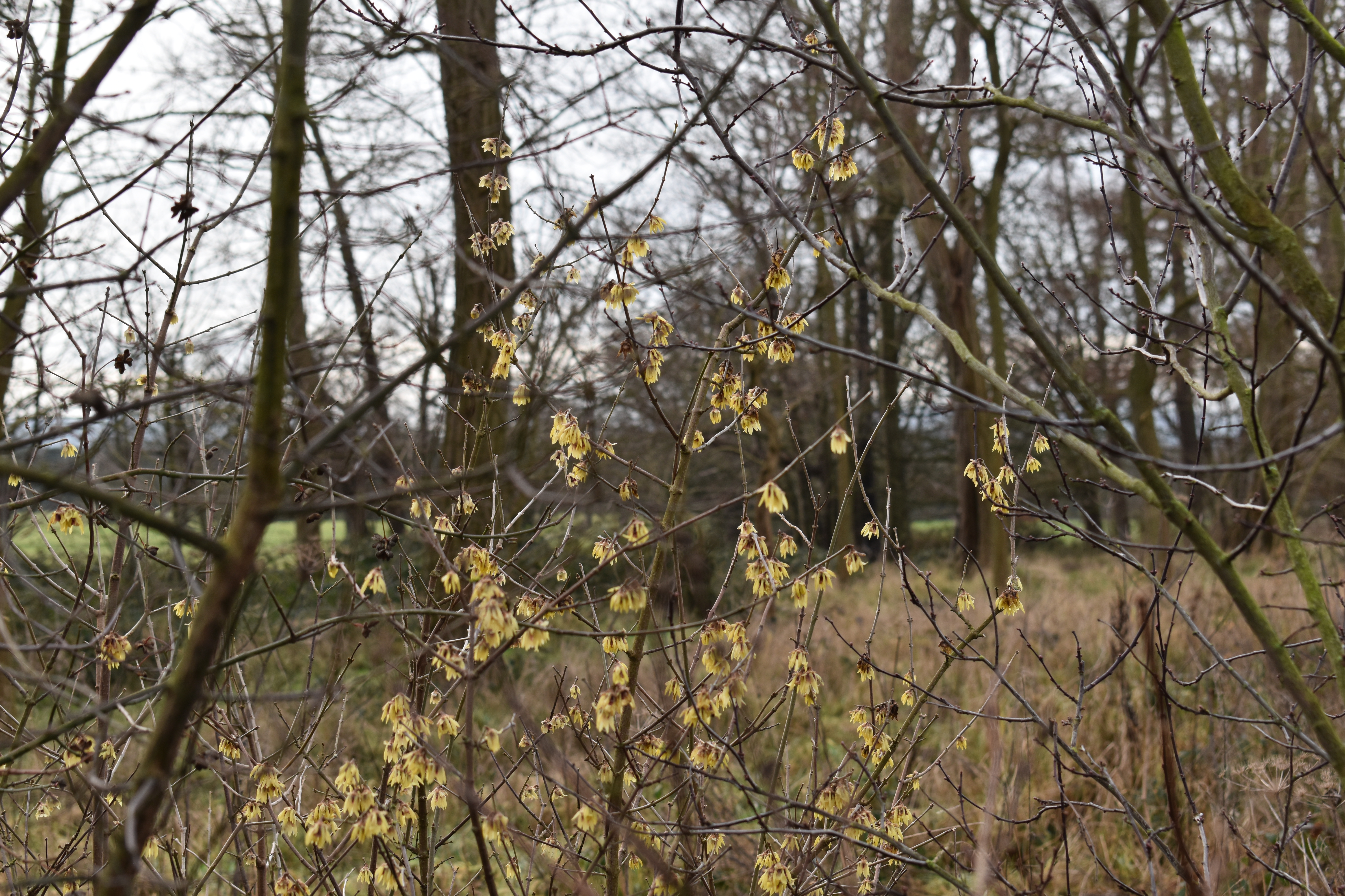 As we approached the walled garden we noticed two winter-flowering shrubs showing off their yellow blooms in the border alongside the gravel pathway. They were in fact two varieties of the same shrub, both lightly scented called chimonanthus.