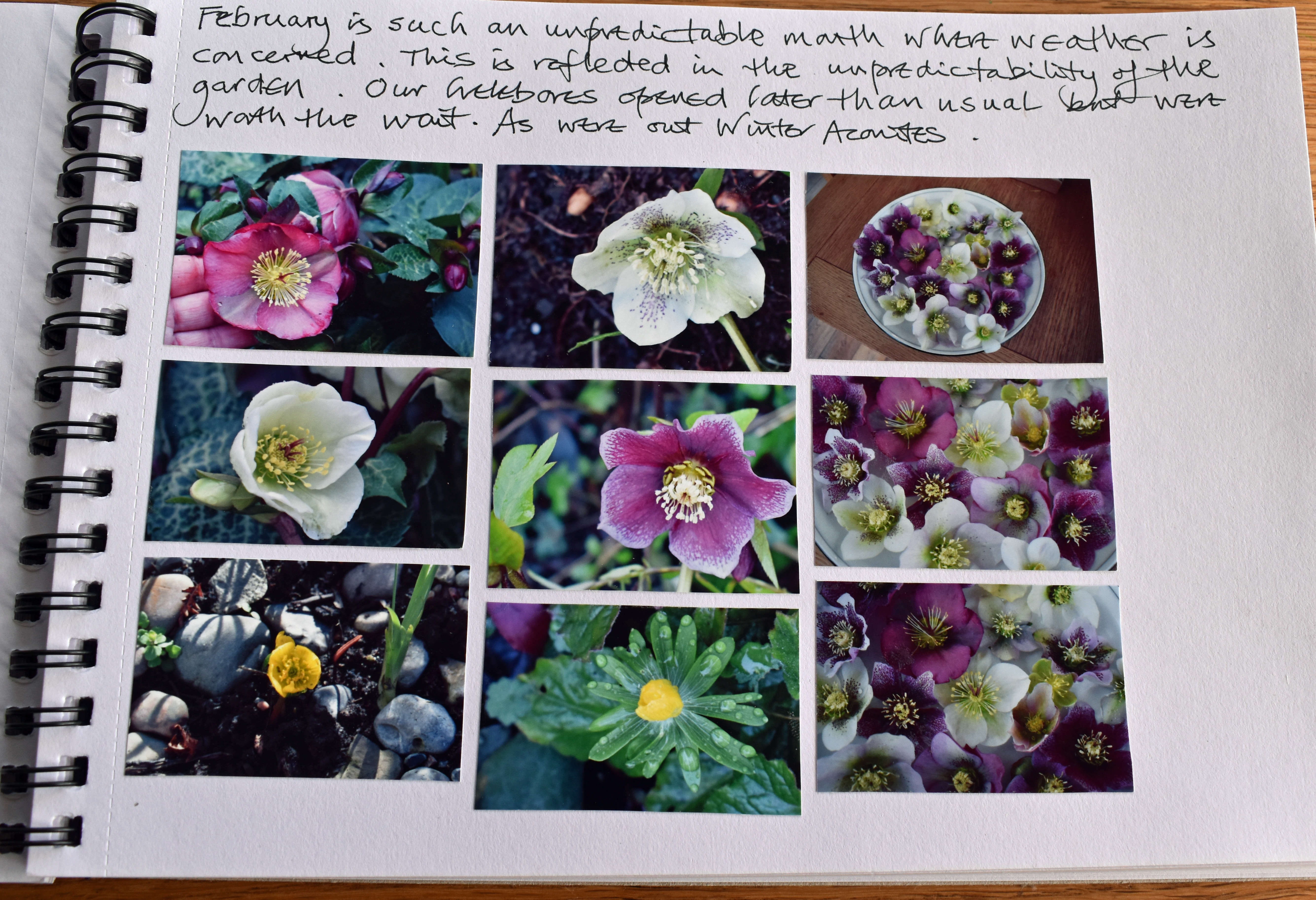 The first page for February began with me writing, “February is such an unpredictable month where the weather is concerned. This is reflected in the unpredictability of the garden. Our hellebores opened later than usual but were worth the wait, as were our Winter Aconites.”