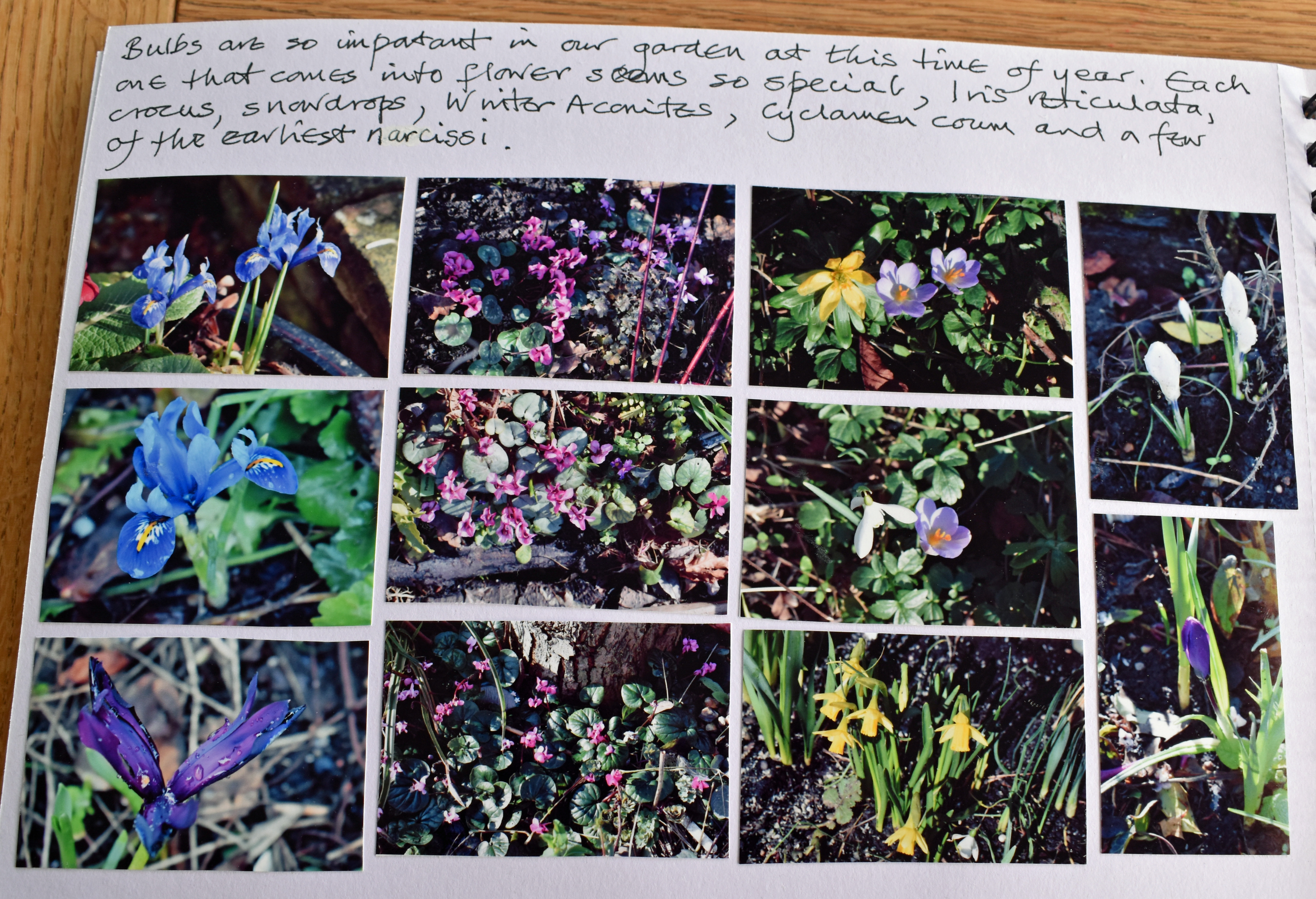 Winter flowering bulbs were the theme of the next page where I wrote, “Bulbs are so important in our garden at this time of year. Each one that comes into flower seems so special, Iris reticulata, crocus, winter aconites, Cyclamen coum and a few of the earliest narcissi.”