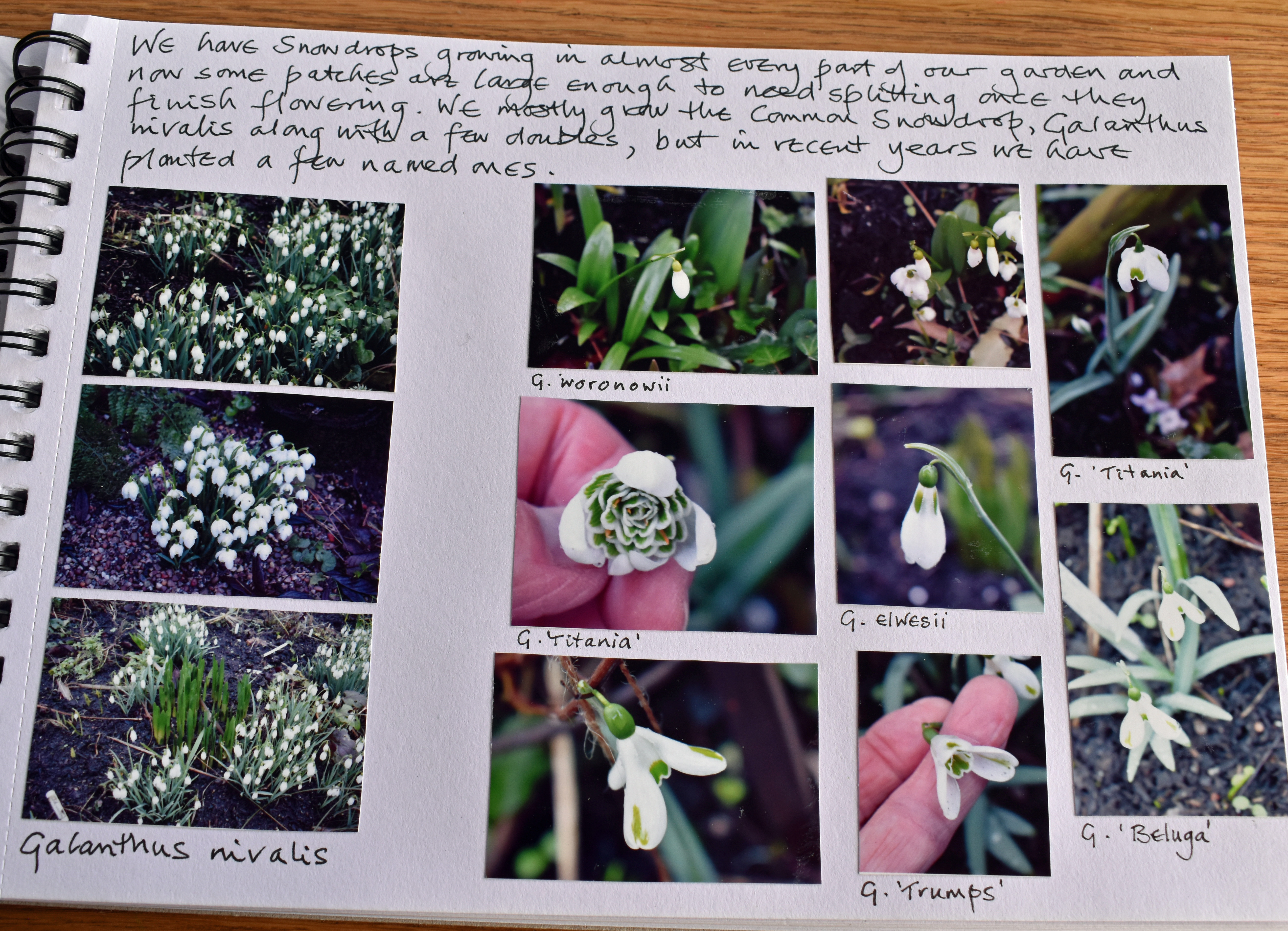 Another of our favourite winter flowering bulbs features on the next page, Snowdrops. I wrote, “We have snowdrops growing in almost every part of our garden and now some patches are large enough to need splitting once they finish flowering. We mostly grow the Common Snowdrop, Galanthus nivalis with a few doubles, but in recent years we have planted a few named cultivars.”