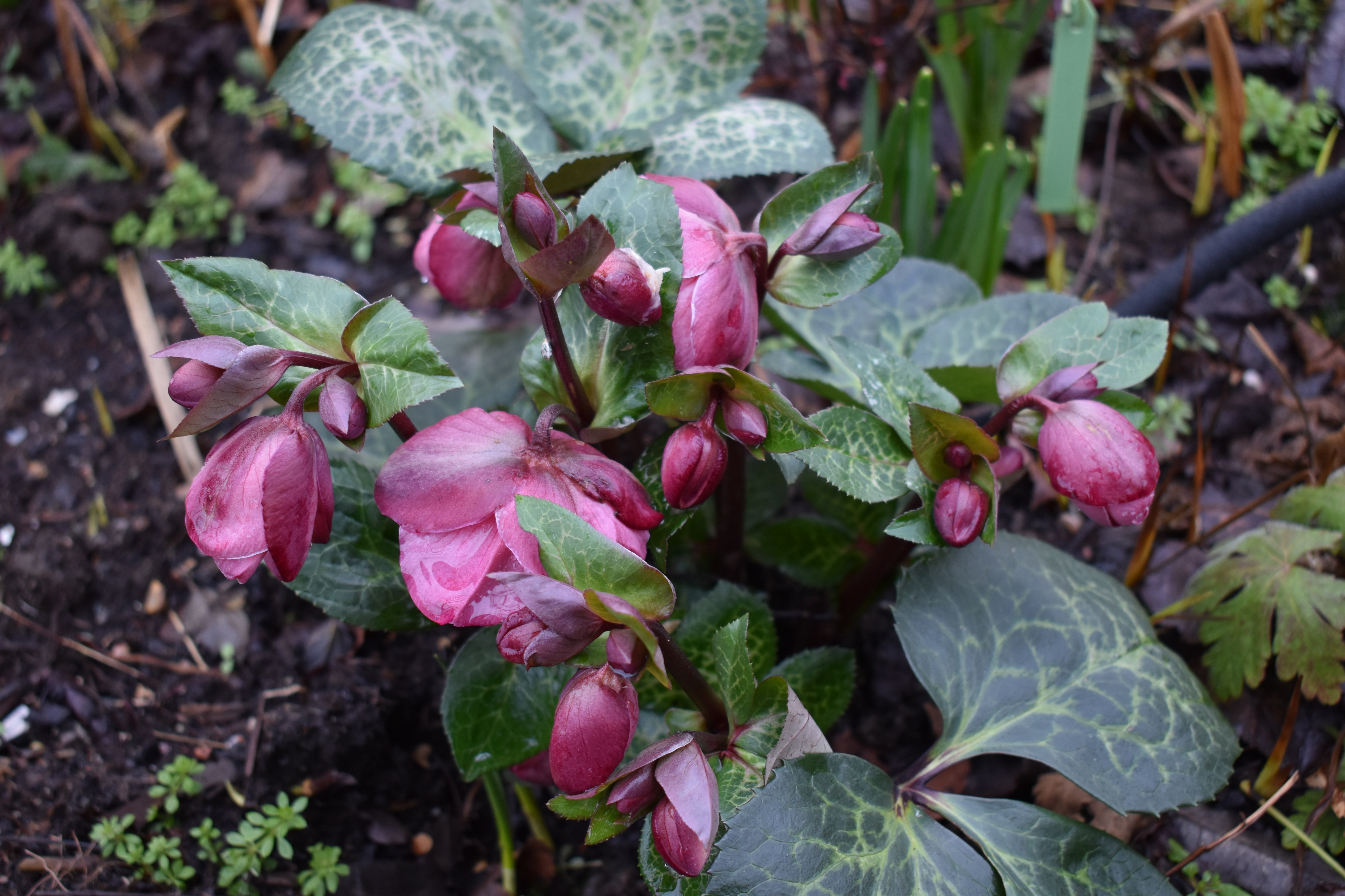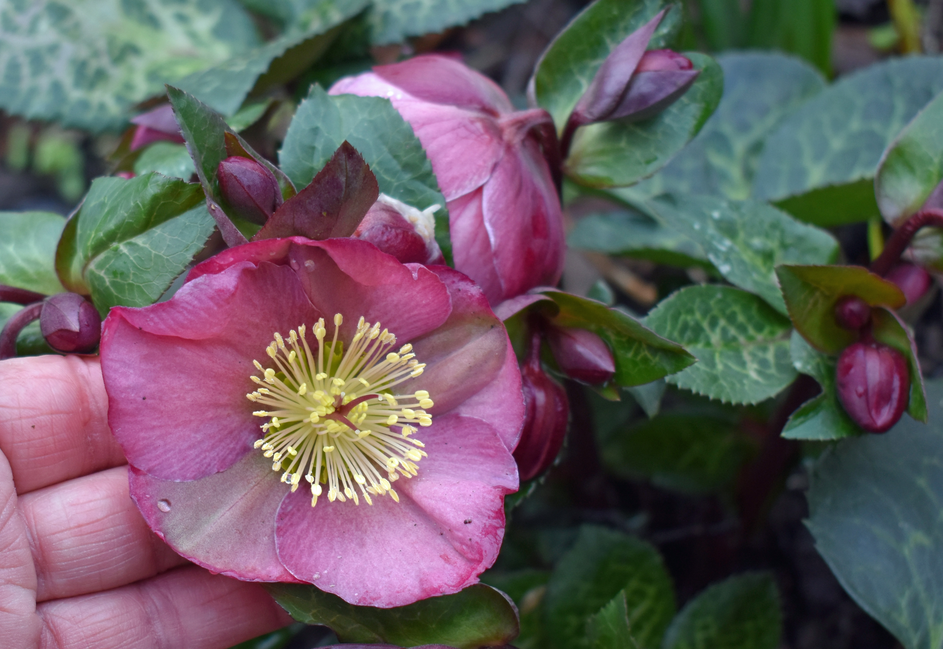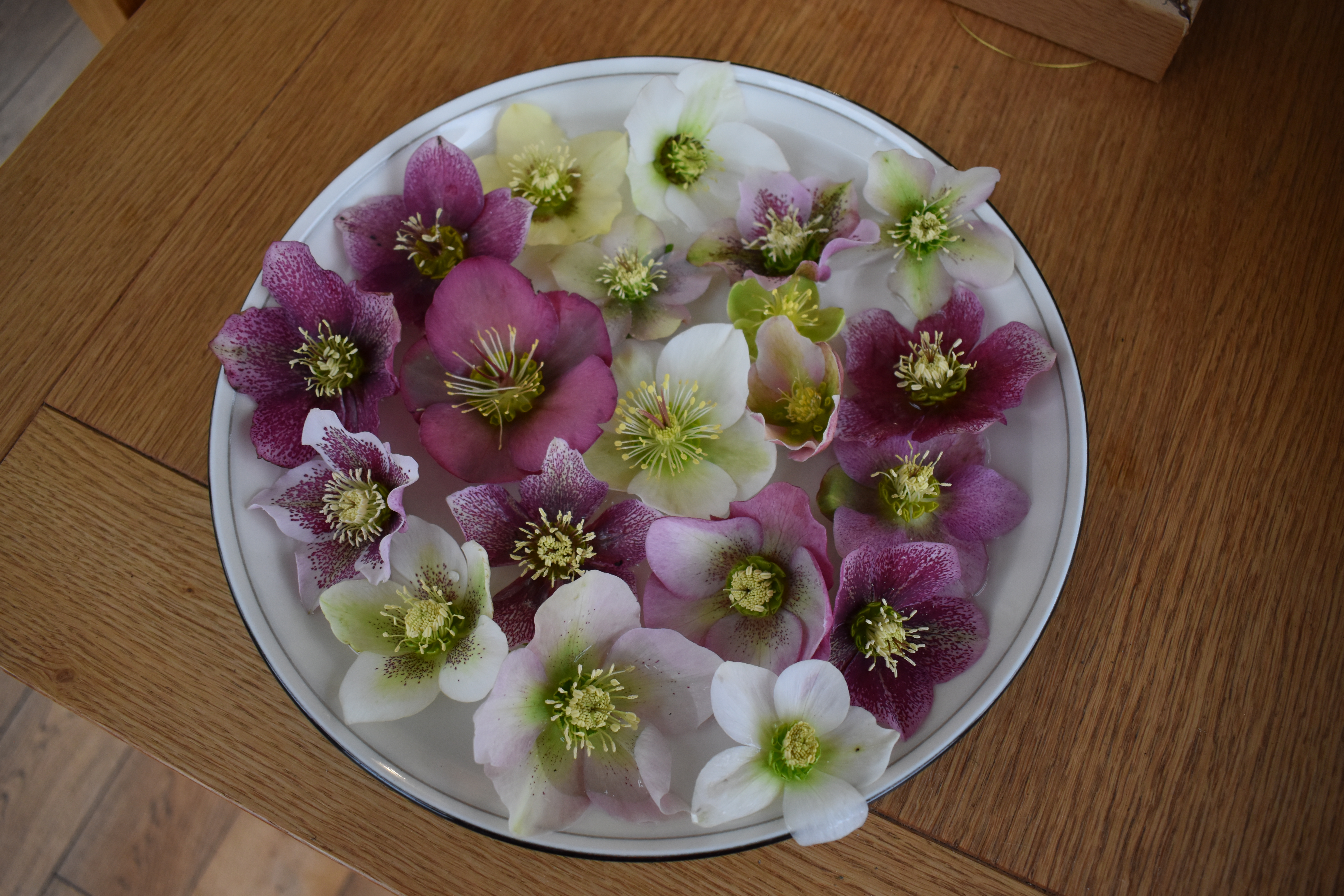 Every February we pick several flower heads of different hellebores to float in a dish to see these lovely blooms close together side by side.