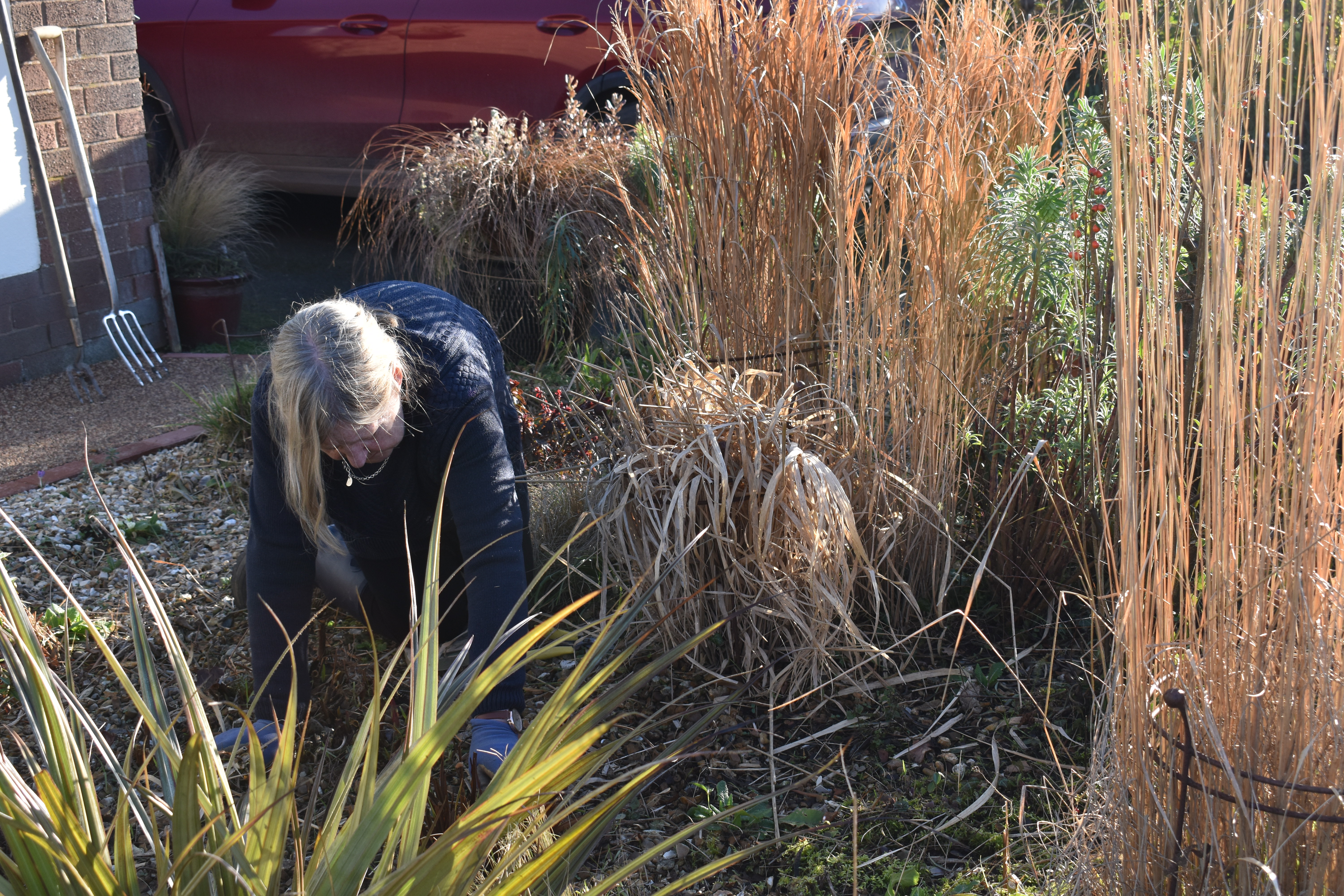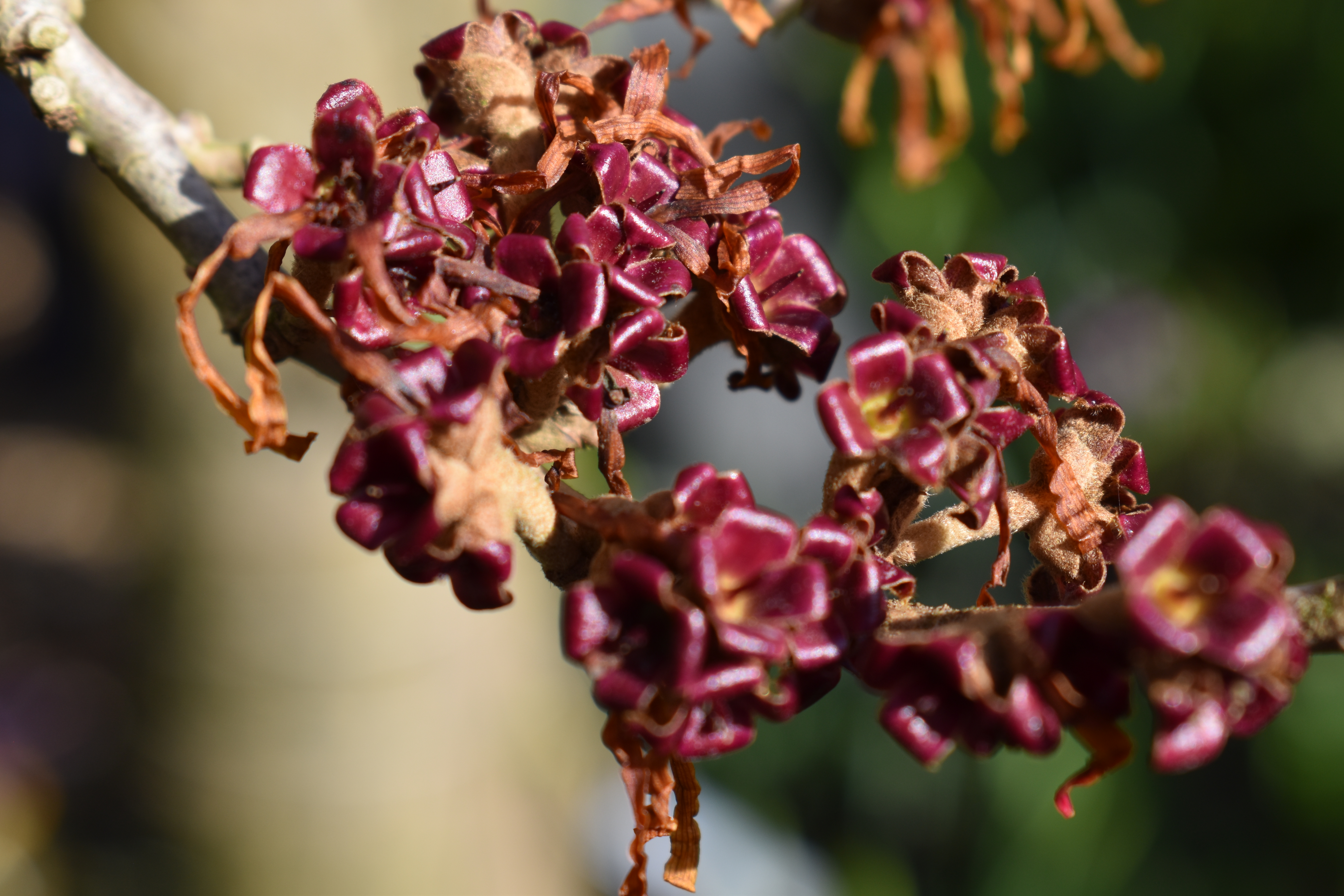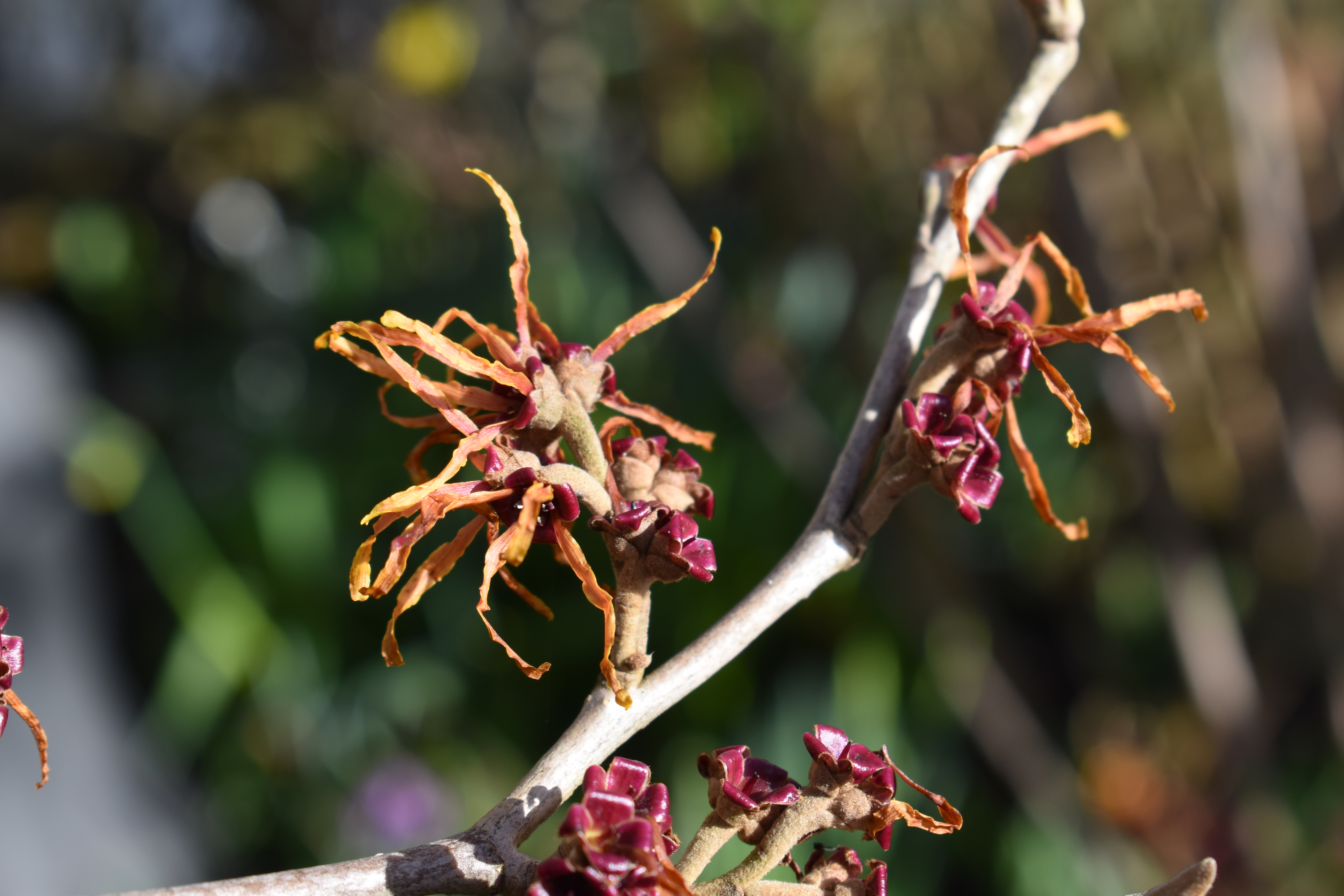 Witch Hazels feature next, “Our three Hamamelis, Witch Hazels, H. ‘Diane’, H. ‘Jelena’ and H. ‘Harry’ have been sharing their brightly coloured and sweetly scented blossom with us for quite a few winter weeks. As the petals begin to fall the deep maroon/red flower bases provide new interest.”