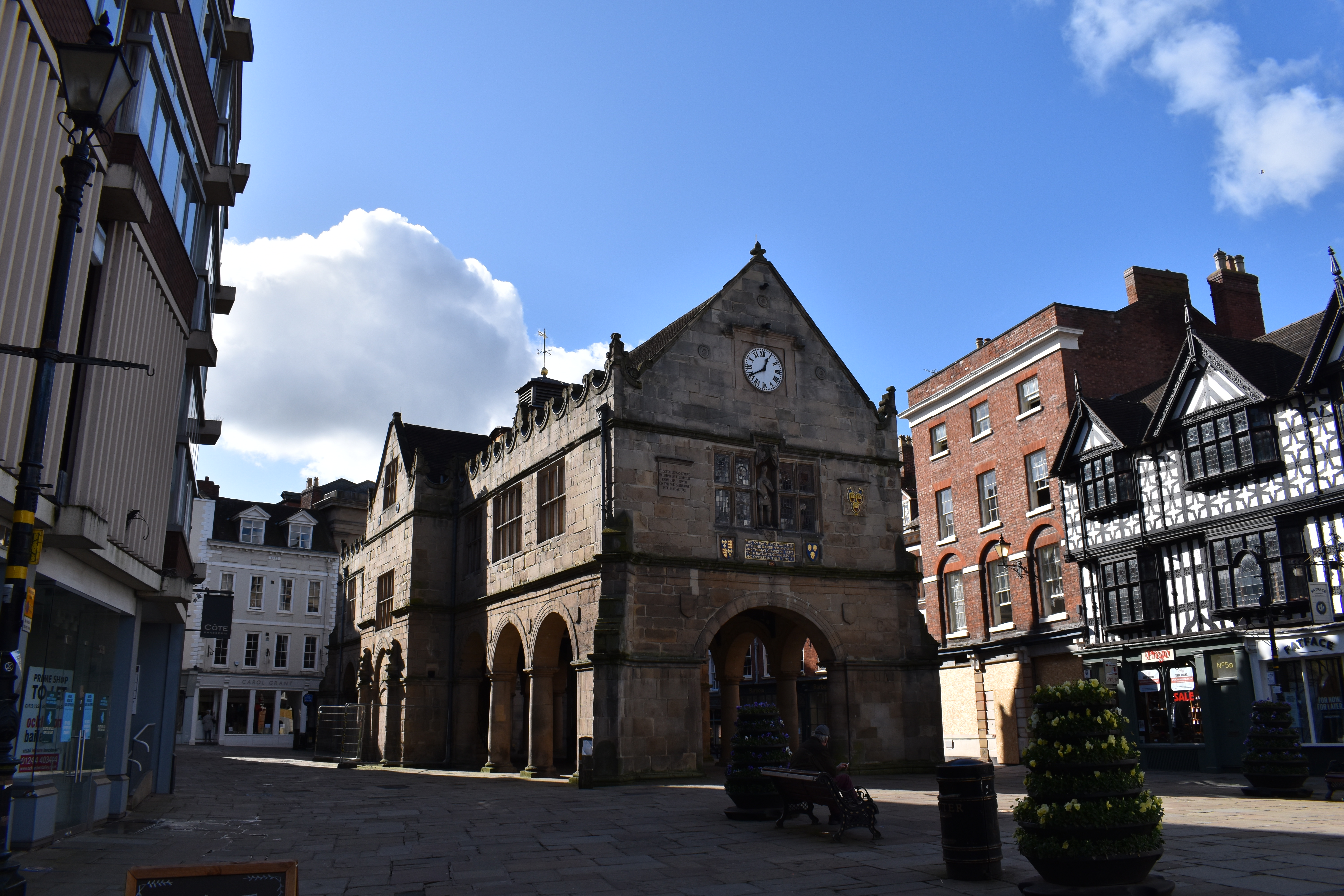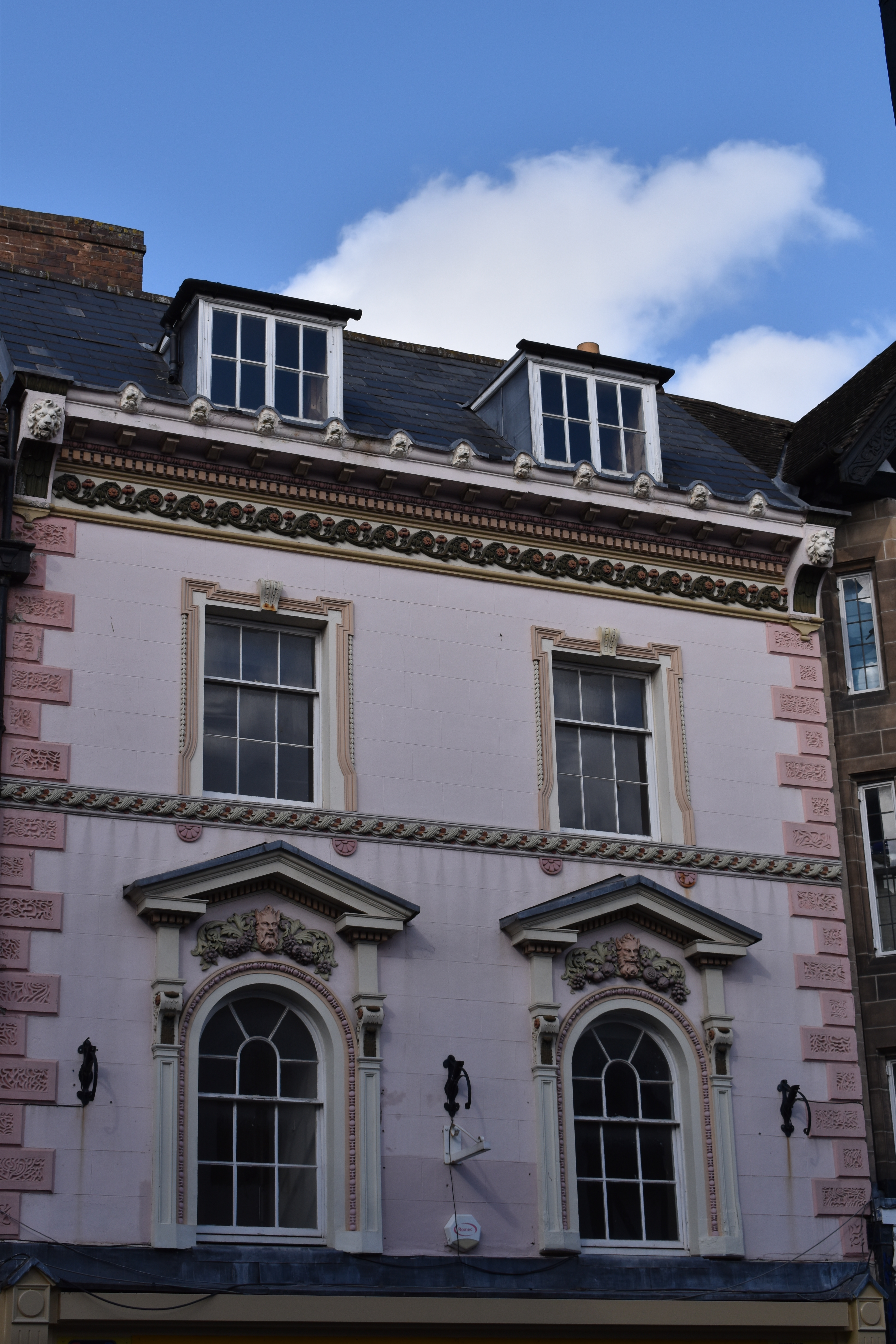 We left this area by following a narrow passageway called Grope Lane. Shrewsbury has its own name for these narrow alleys, “shuttes”, but the steep one we took is called simply ‘lane’. It took us down into the High Street where we made for the Market Square. This area is home to an interesting array of architectural styles, but sadly some of our favourites were hidden behind scaffolding.