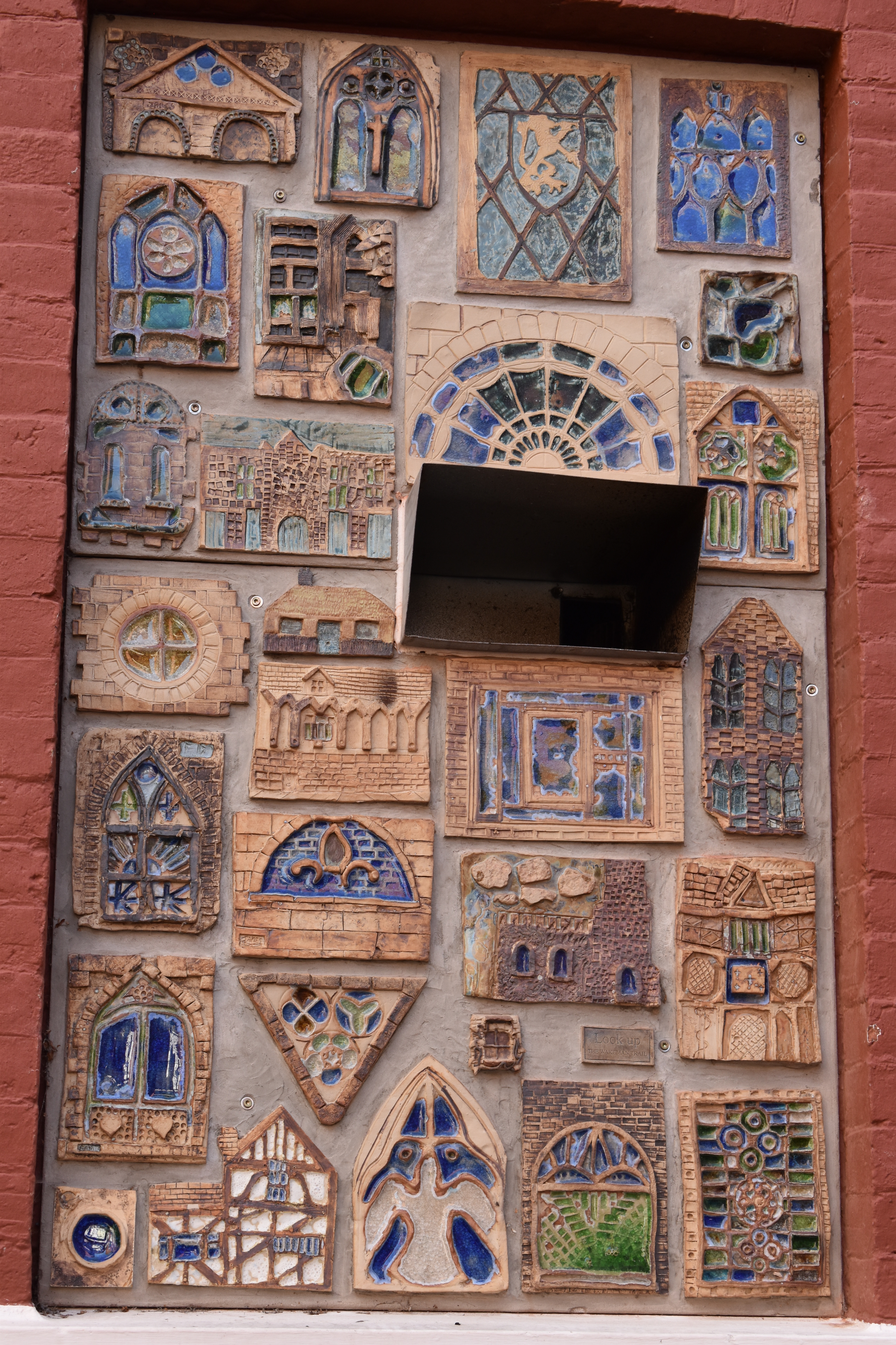 Before taking the steps we passed this interesting colourful building with a ceramic tile montage adorning a window place. It is one of a series to be found around Shrewsbury made by the students of the Wakeman School had created featuring things seen while looking upwards in the town.