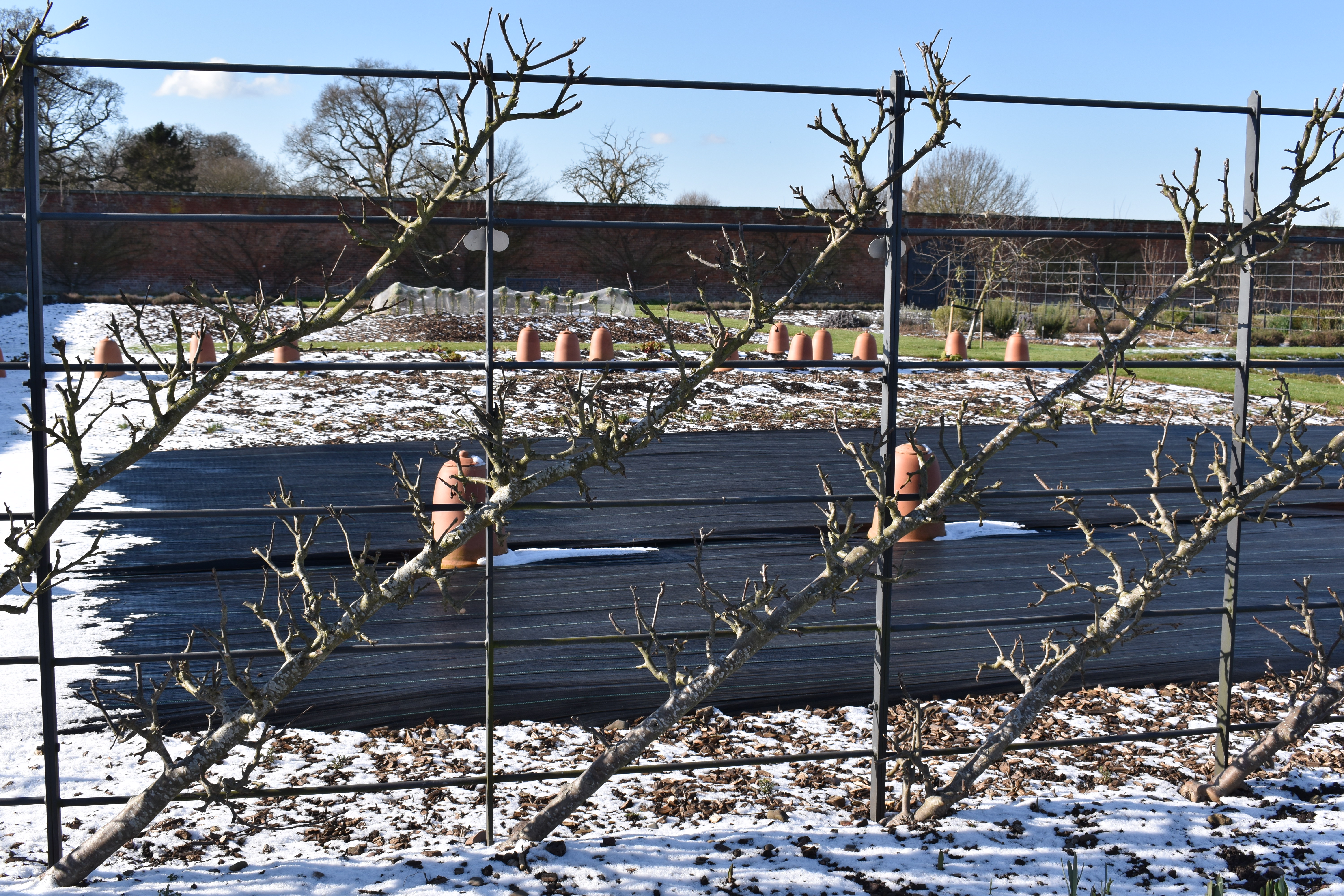 Completely different forms of tree shapes could be seen in and around the walled garden where fruit trees had been skillfully trained against the red brick walls or along tightly strung wires.