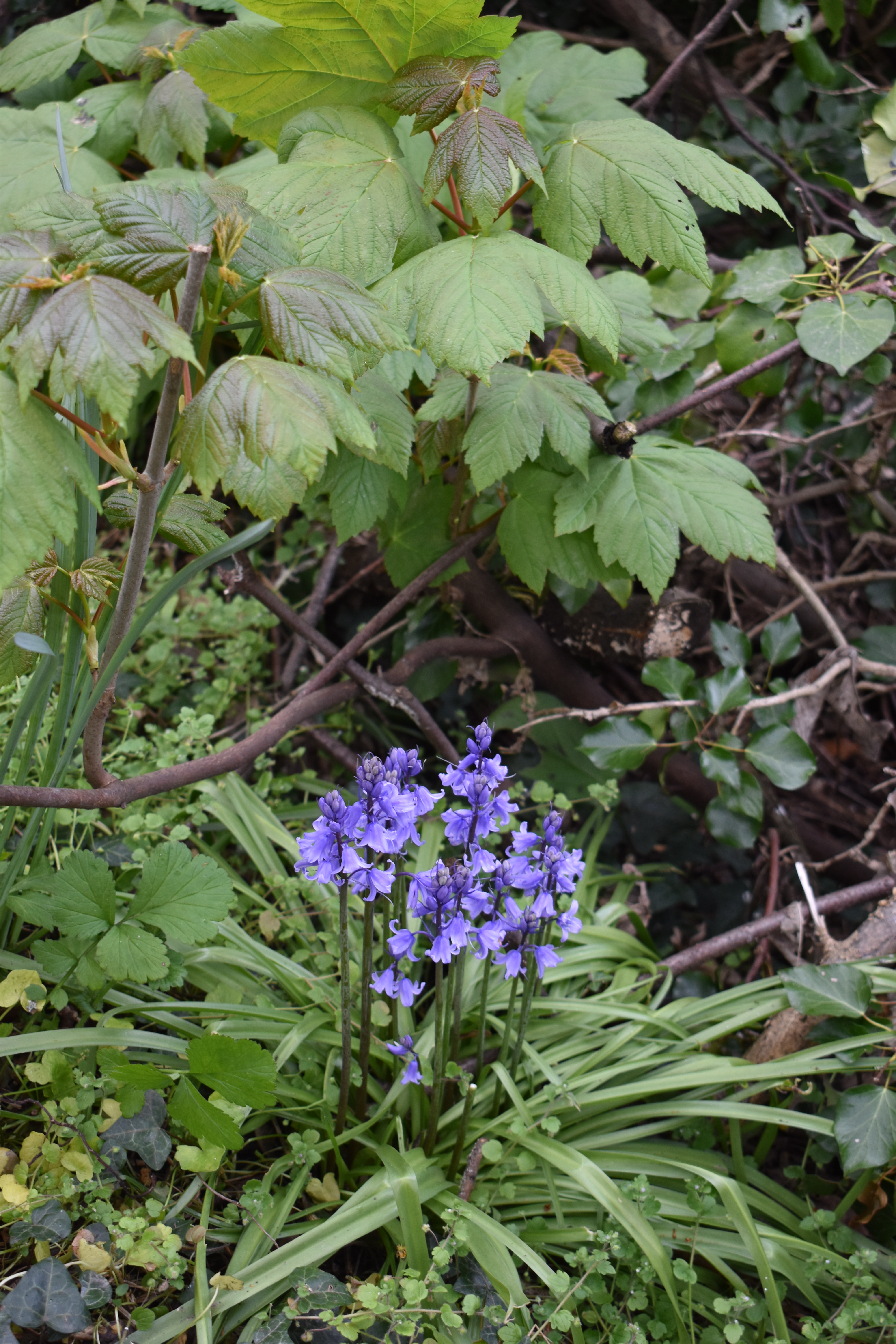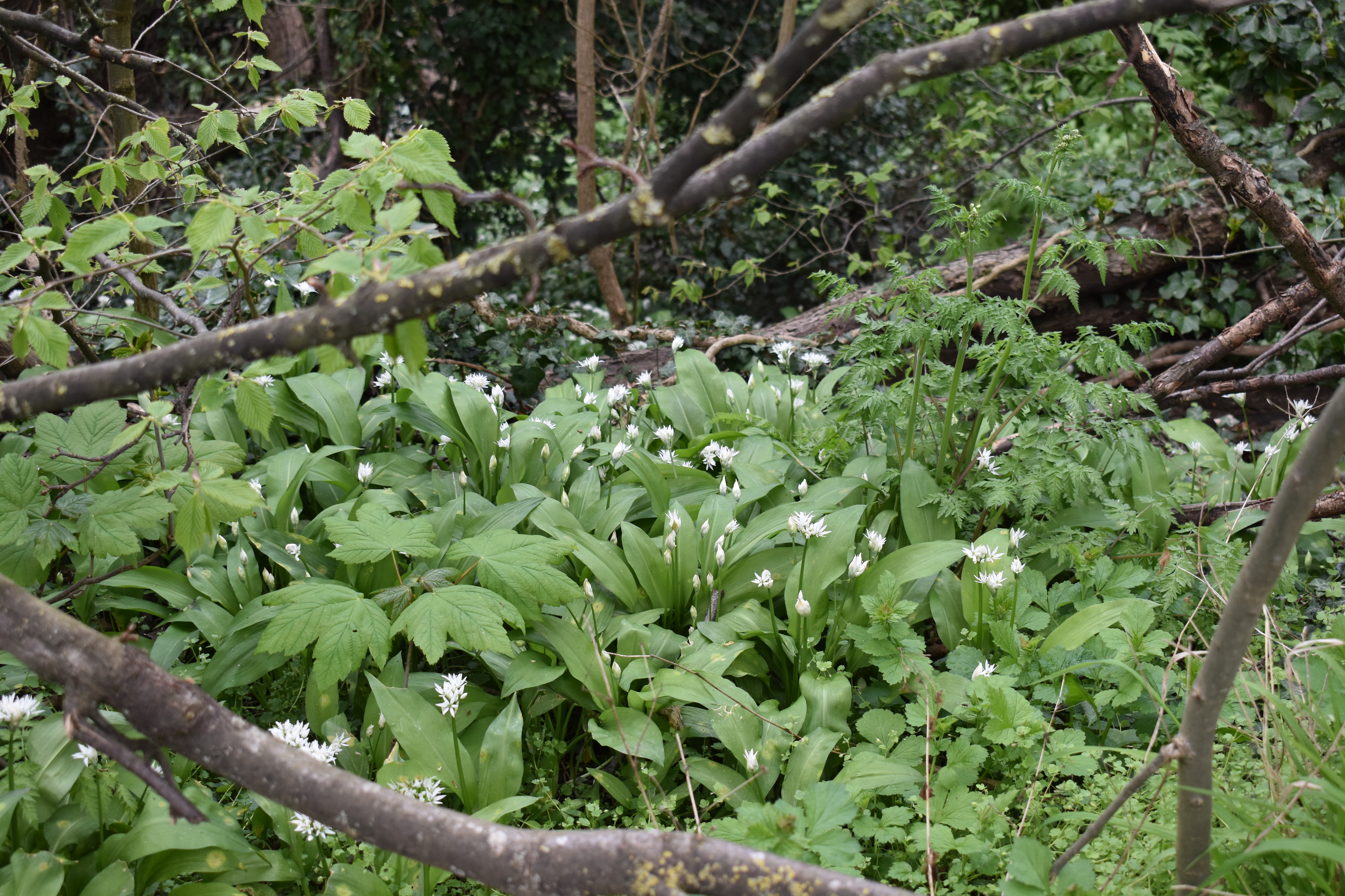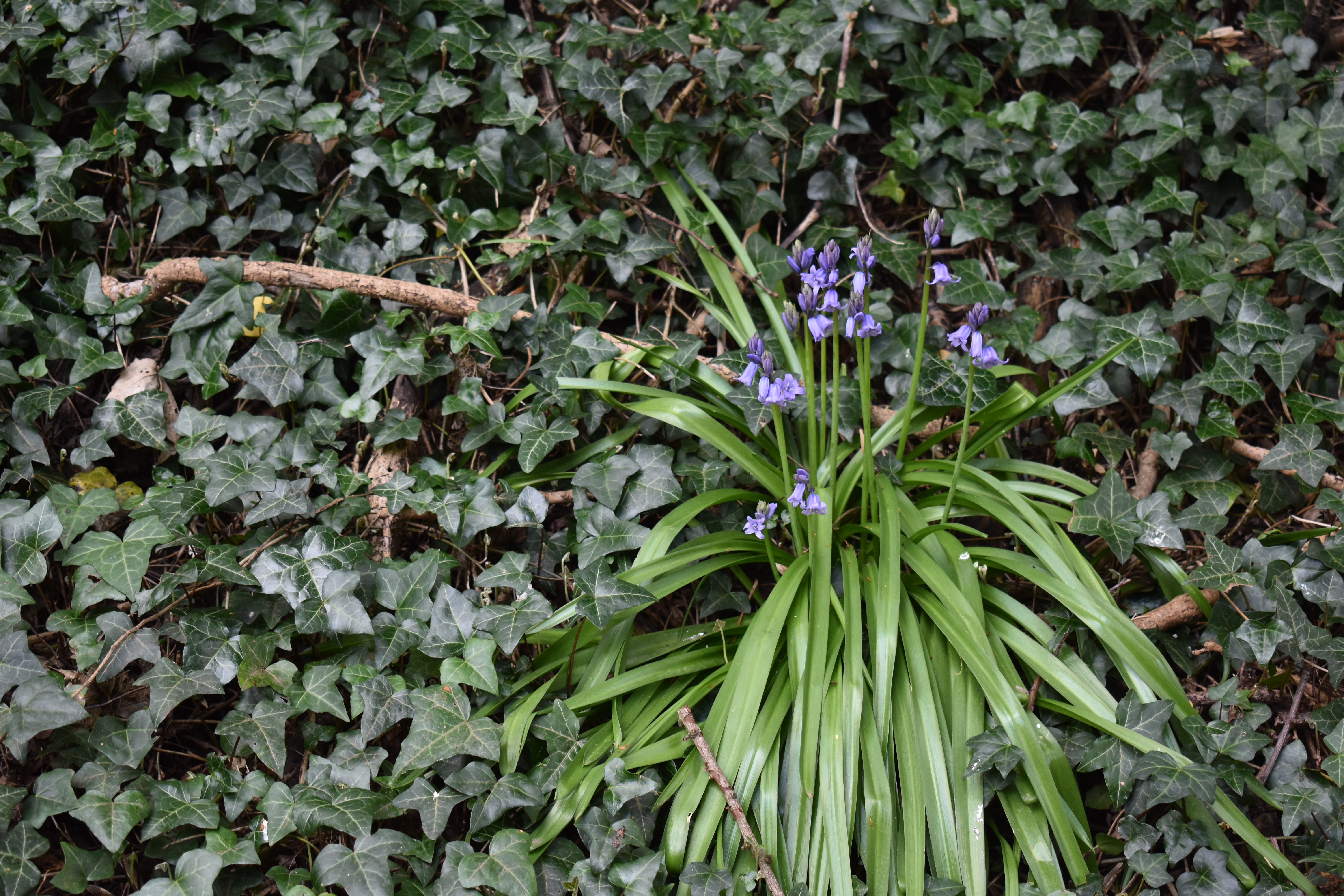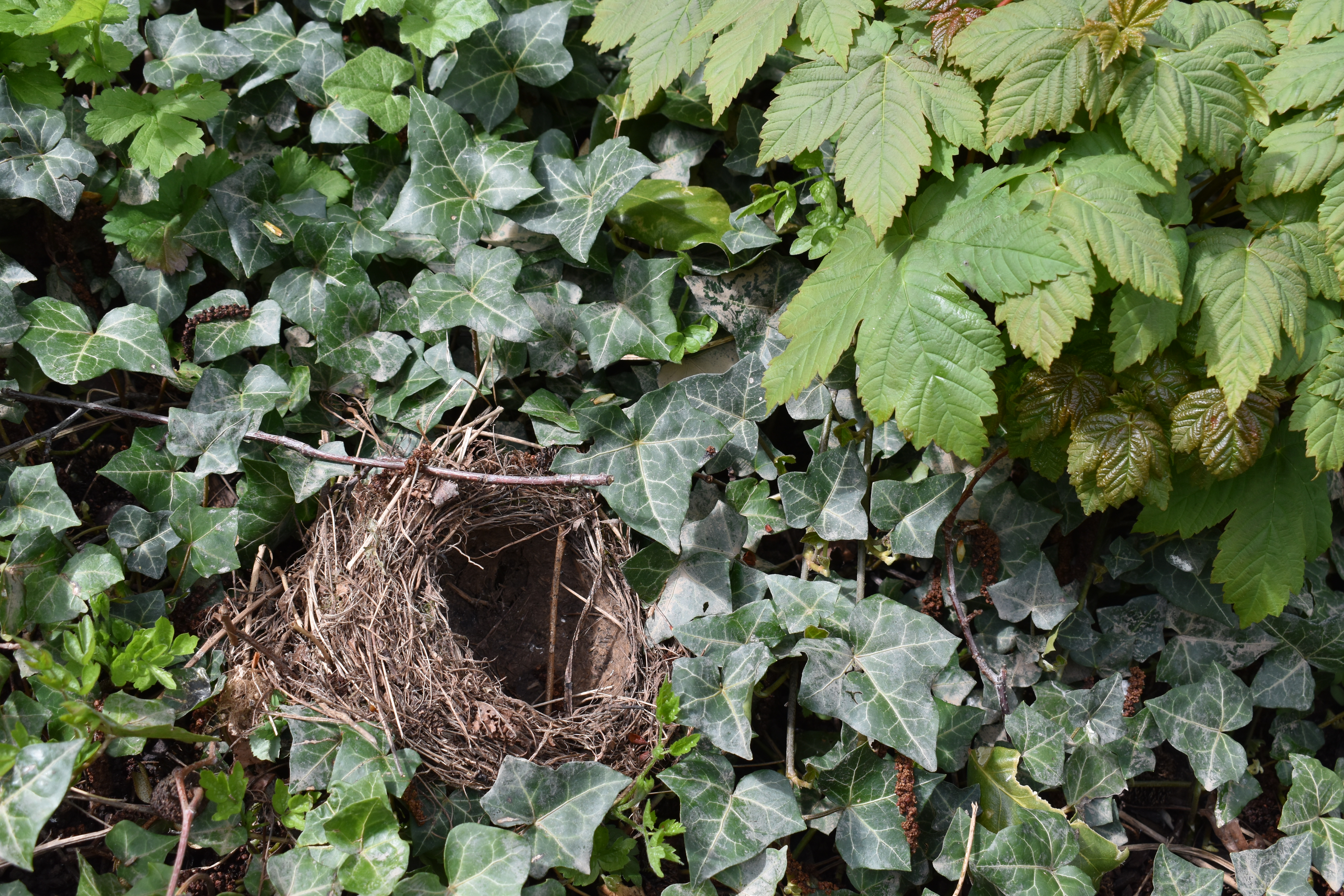 To our right as we wandered along the back of the supermarket the ground sloped upwards and was cover in deep green ivy dotted with clumps of Bluebells just coming into flower. We were surprised when Jude found a nest fallen from the branches of one of the tall sycamore trees. It was a nest constructed beautifully from dried grass stems and lined with a cup of dried mud so would have belonged to a pair of Song Thrushes who would have nested in the ivy covering the tree trunk.