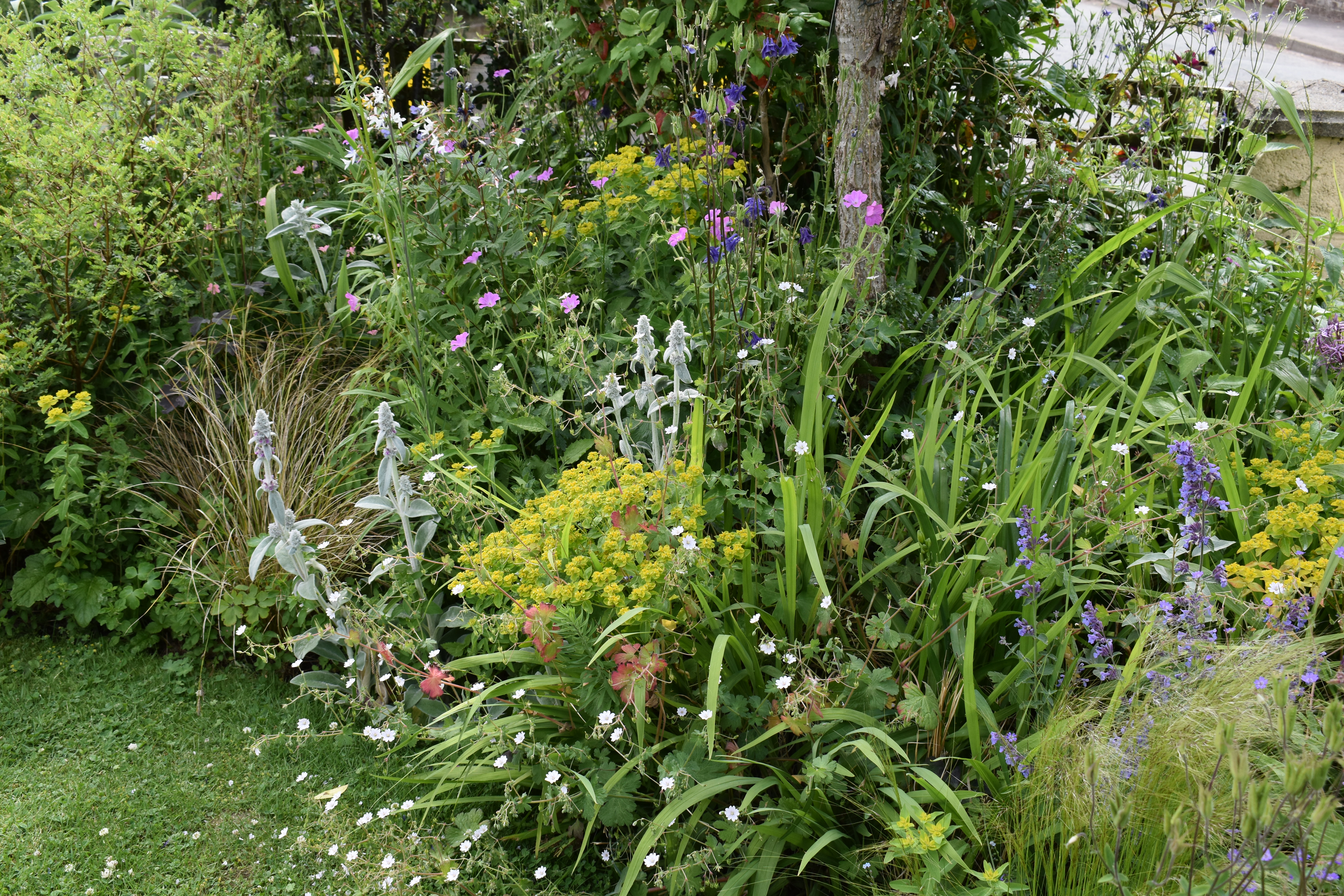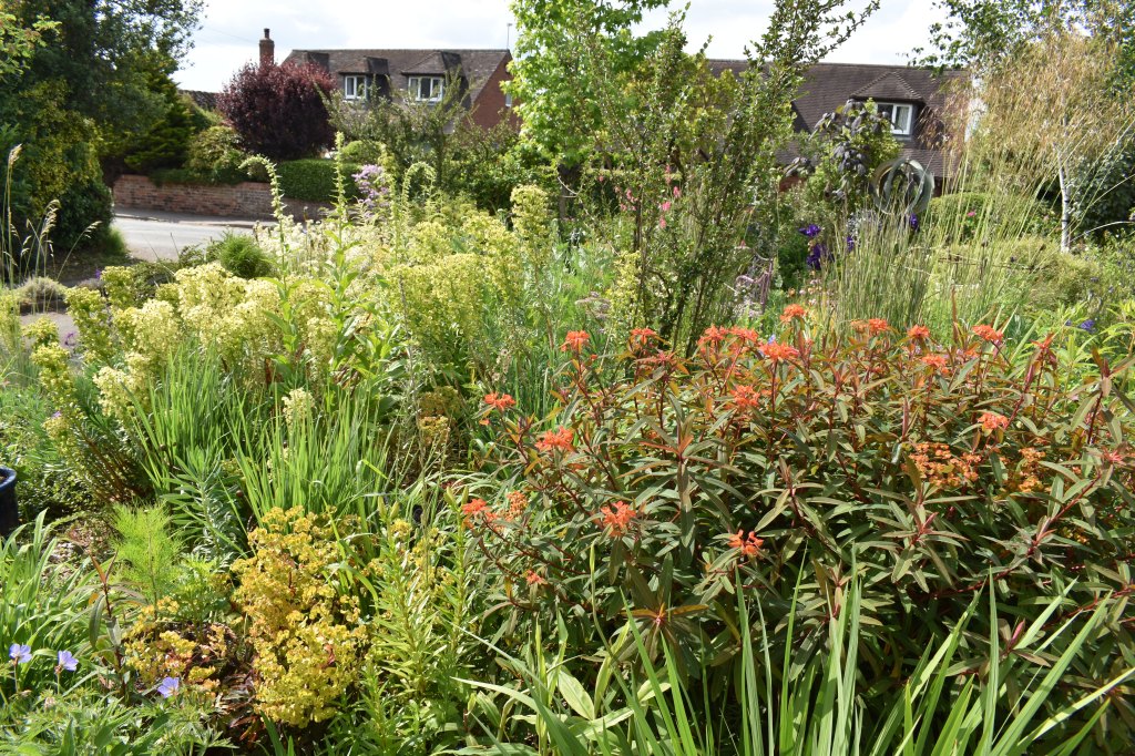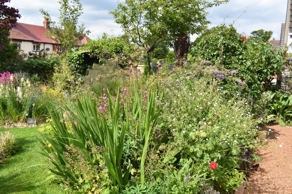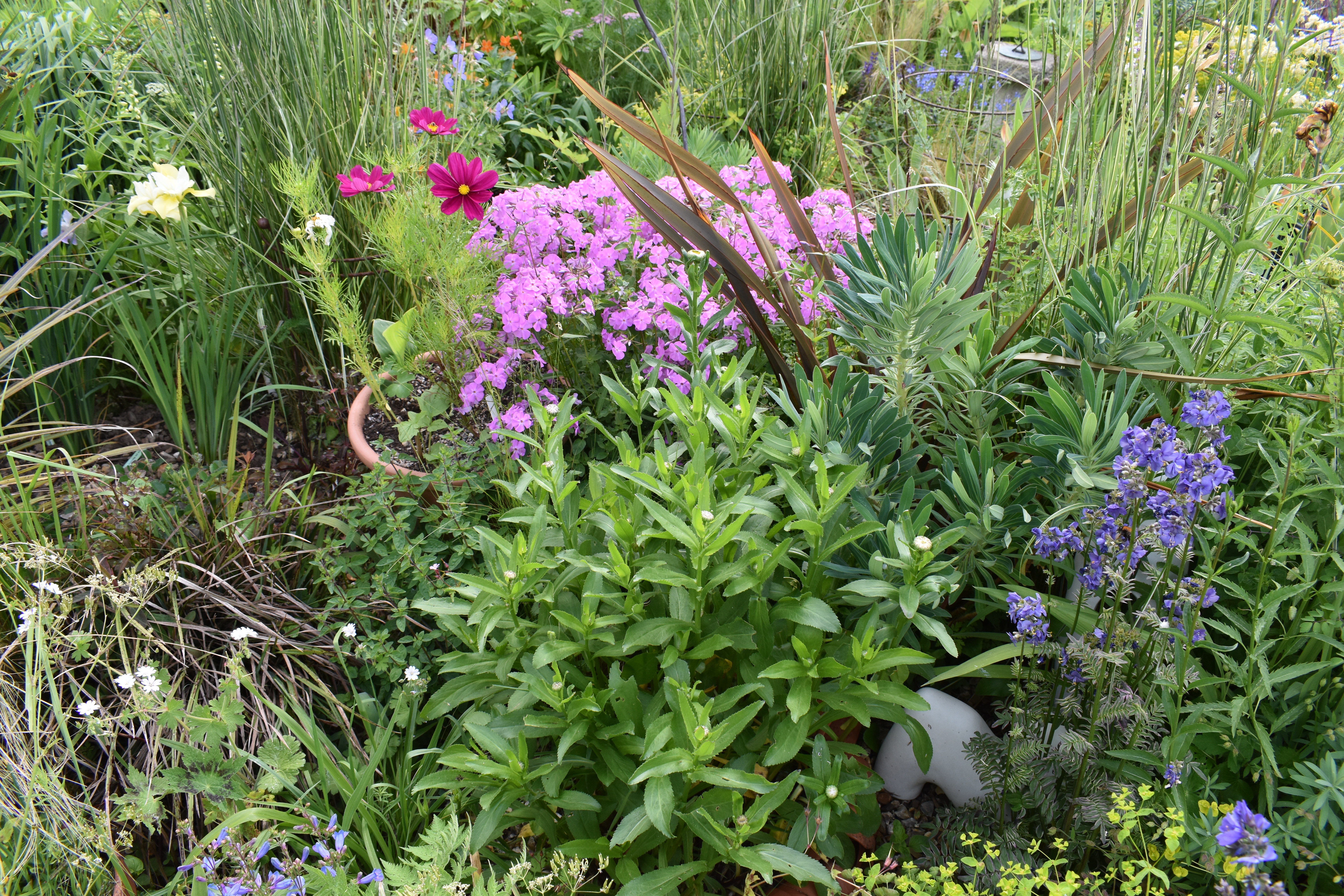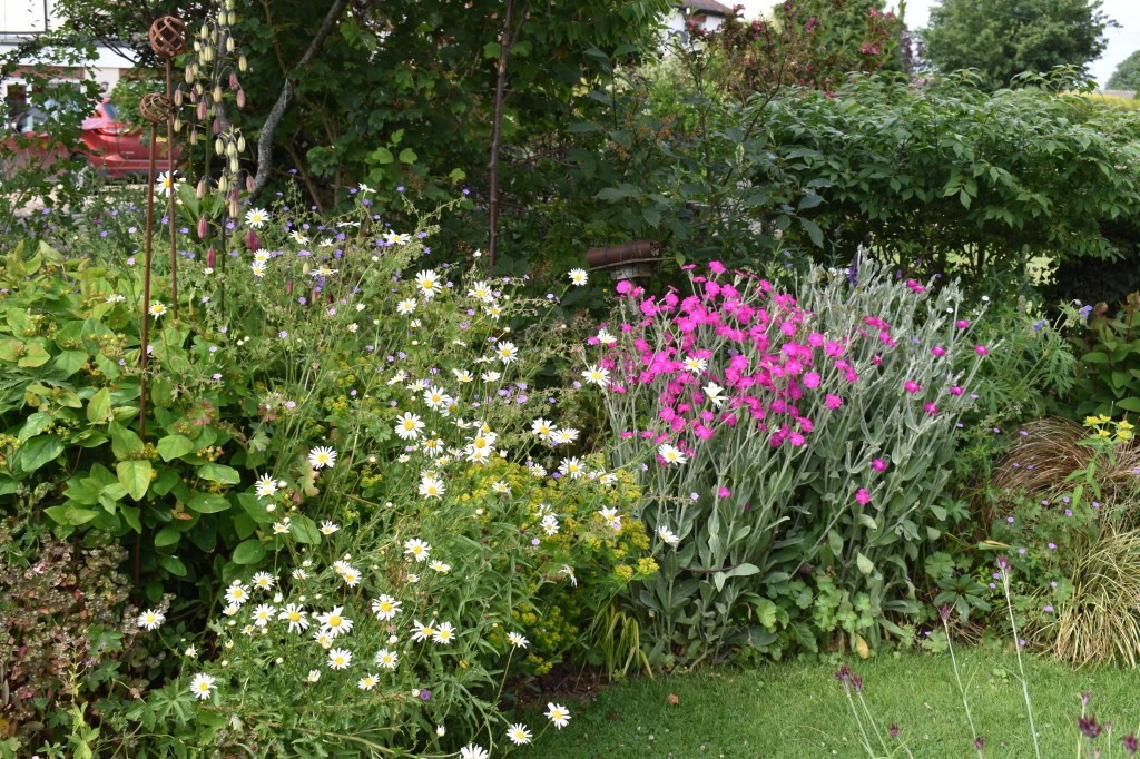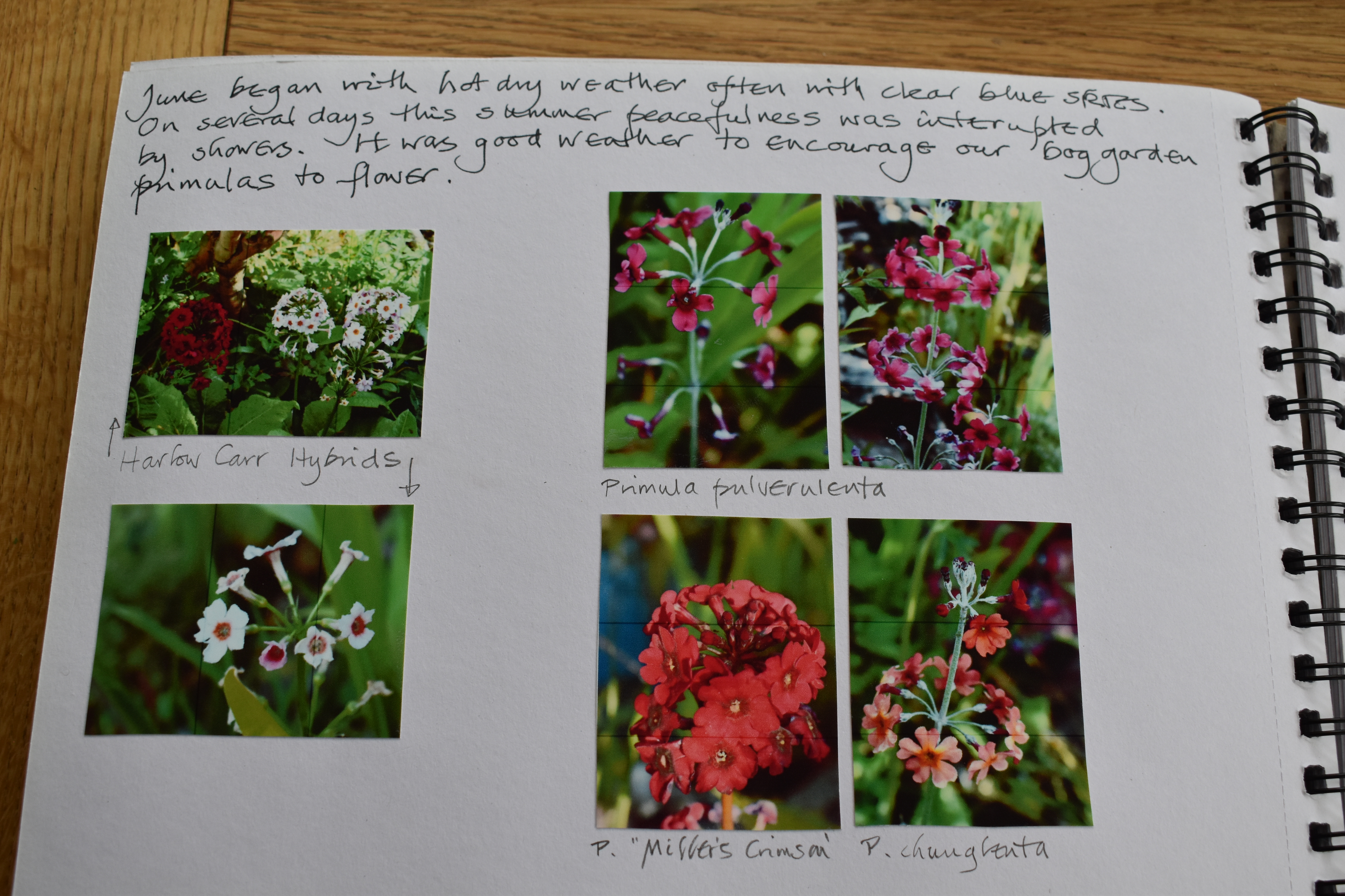 I began by writing, “June began with hot dry weather often with clear blue skies. On several days this summer peacefulness was interrupted by showers. It was good weather to encourage our bog garden primulas to flower.”