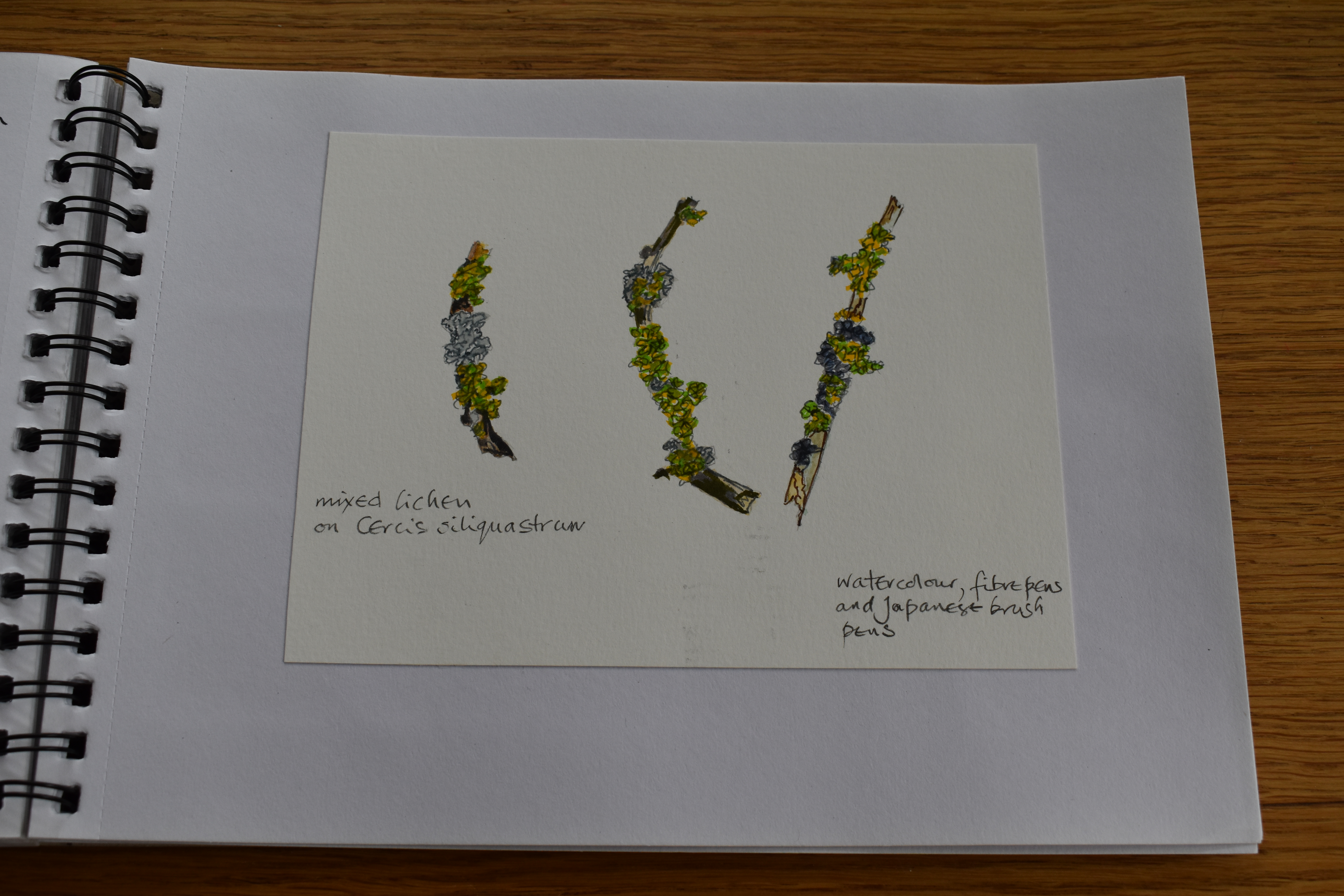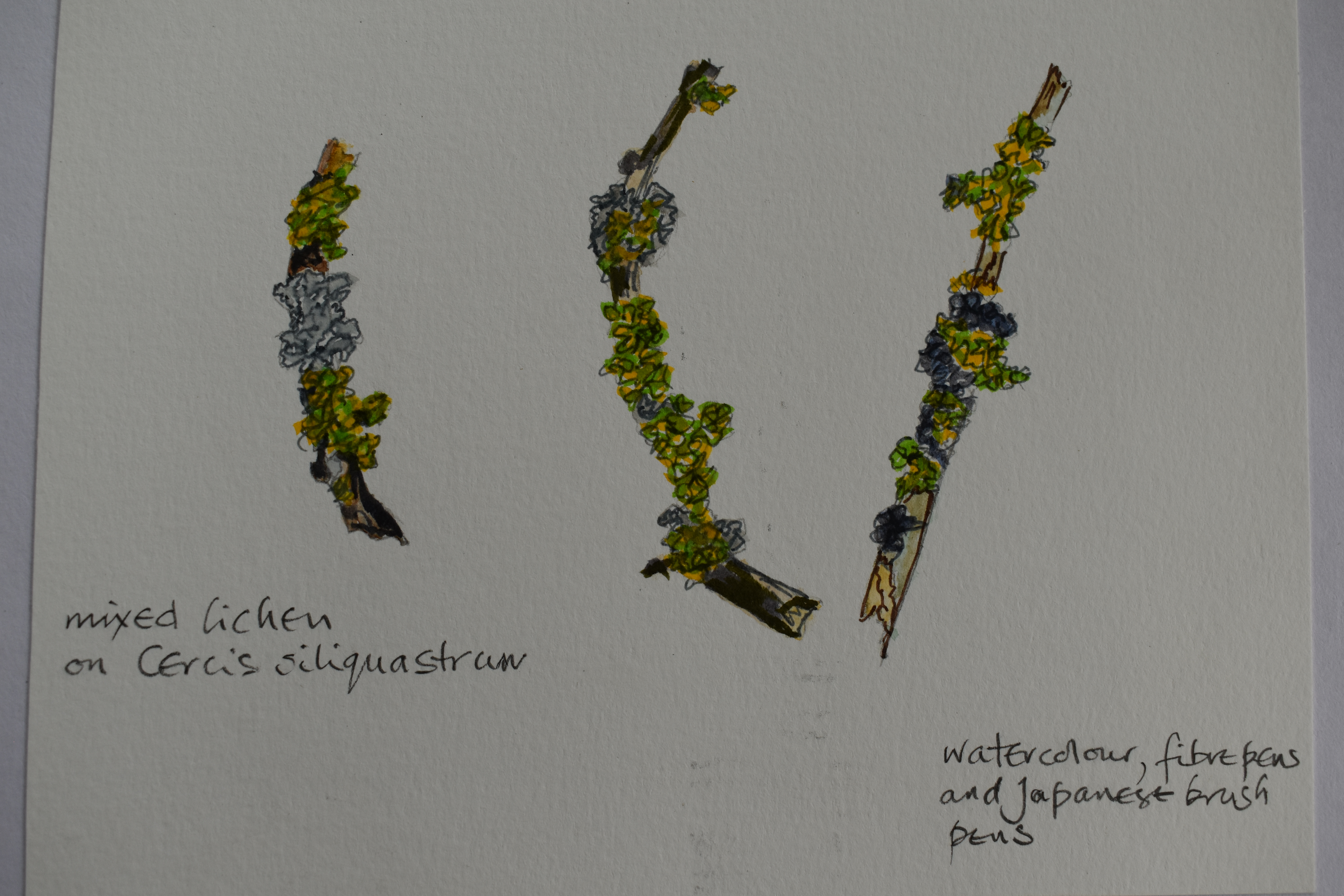 On the next page I feature three drawings I did of some of the lichen found on a dying branch of our Cercis siliquastrum. I sketched them in watercolours, fibre pens and Japanese brush pens. It was quite a challenge!