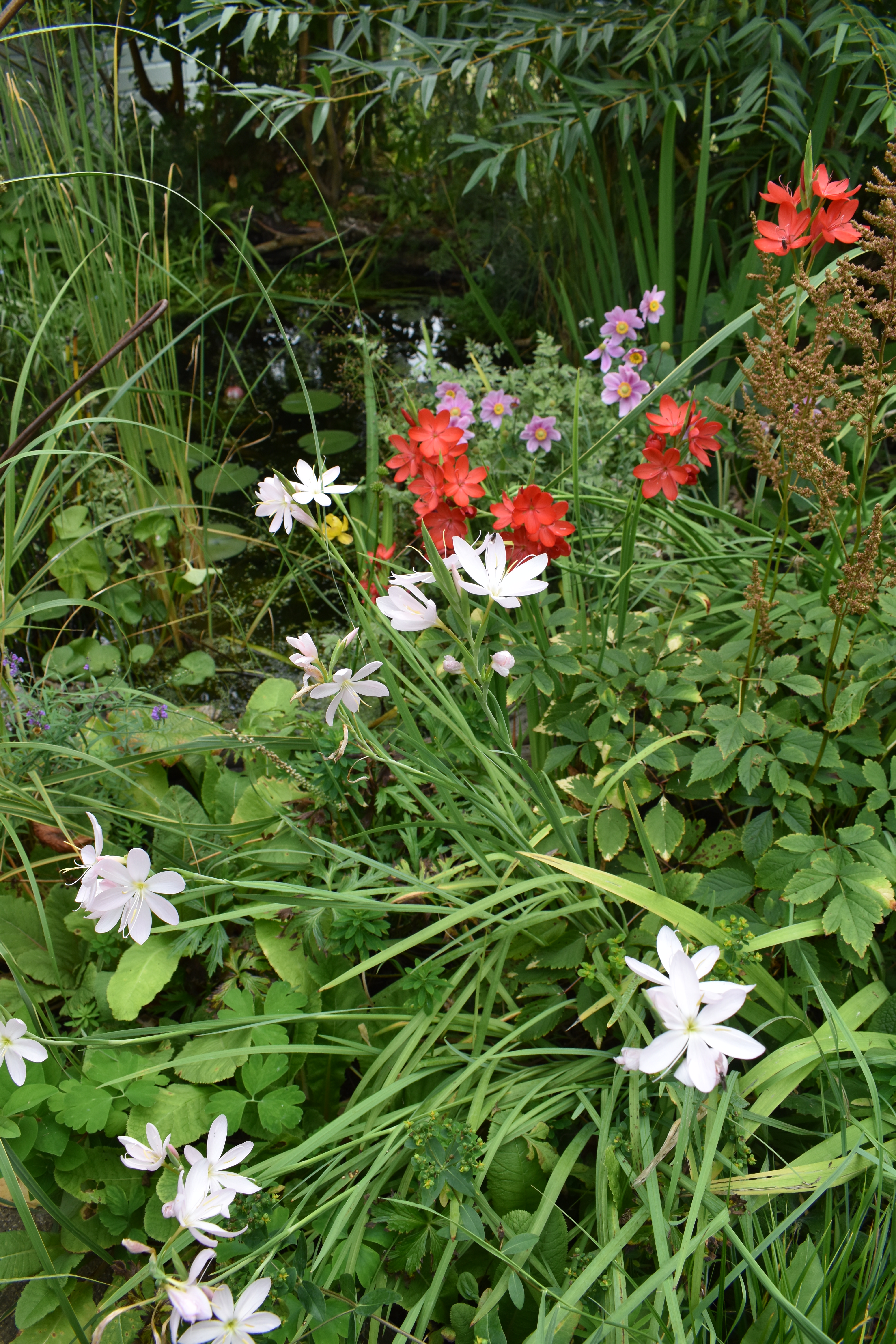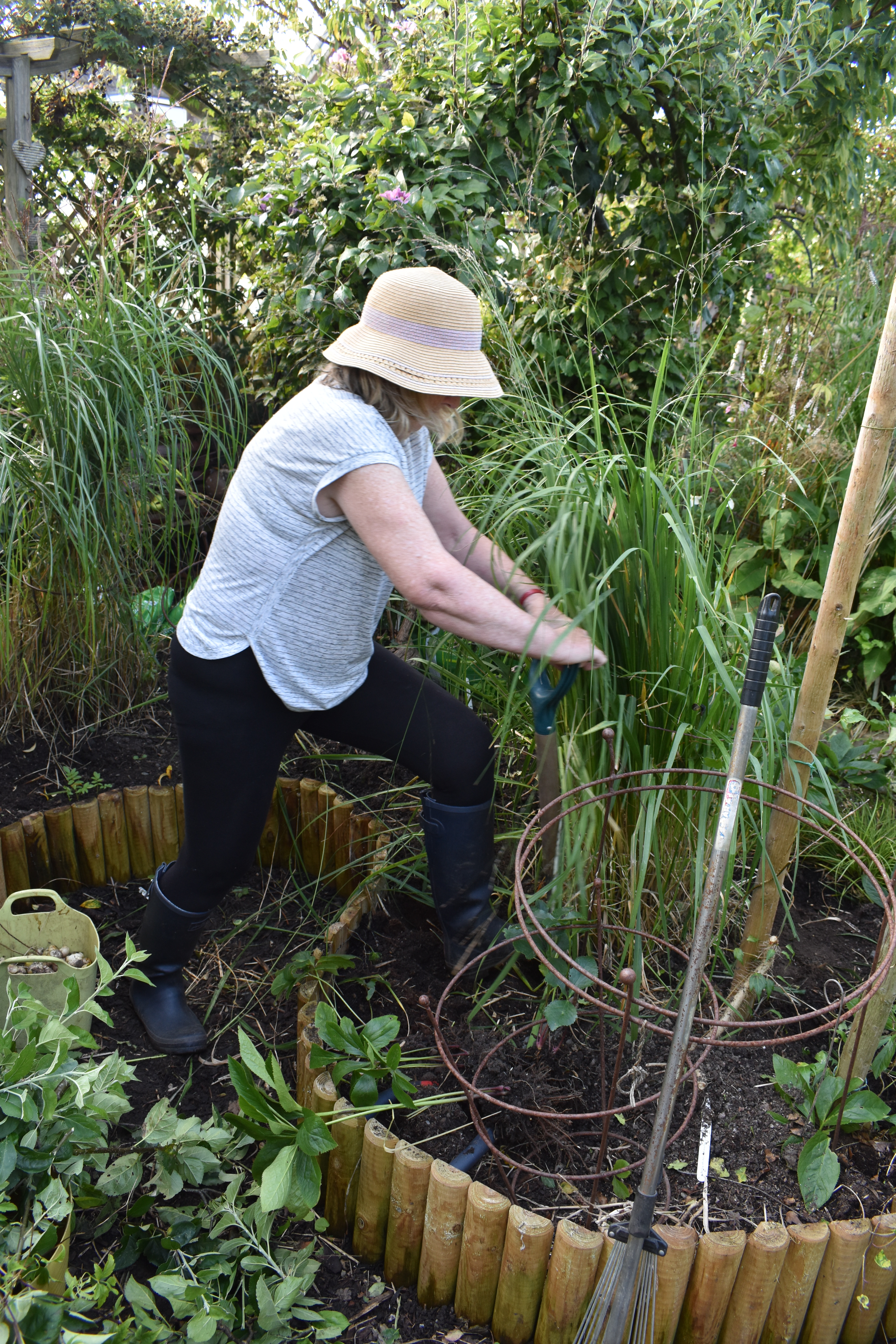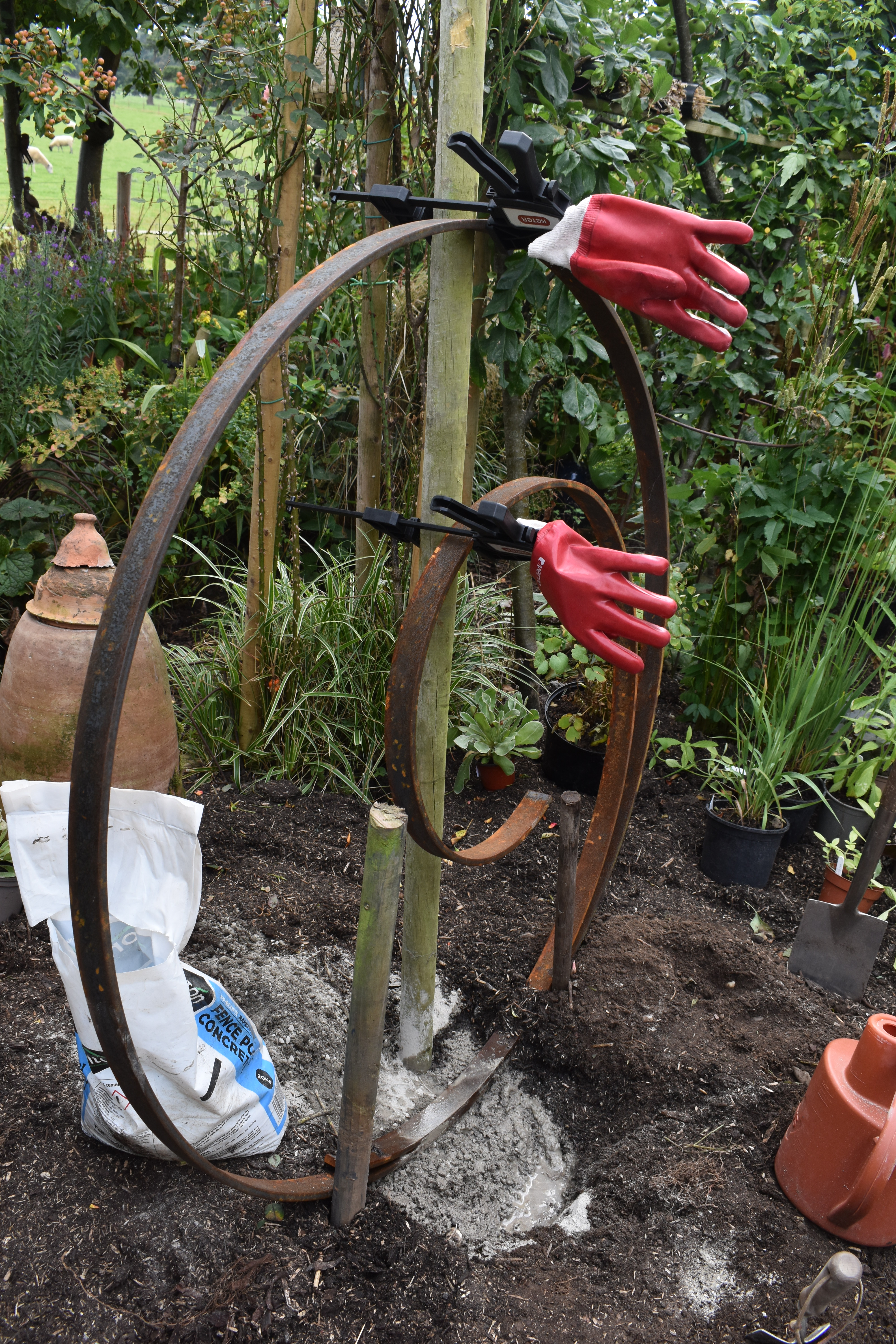 On the opposite page we looked at other garden tasks for later in the month writing, “We fixed our new corten steel sculpture into the bed with concrete, planted all the new planting scheme for a gentle open feel prairie garden. We used carex, hakenochloa, and heuchera as edging. We then needed to thoroughly water the plants in! While the concrete set around the base of the sculpture we supported it using temporary tree stakes and clamped the sculpture to these stakes. The red gloves were to protect our eyes.”