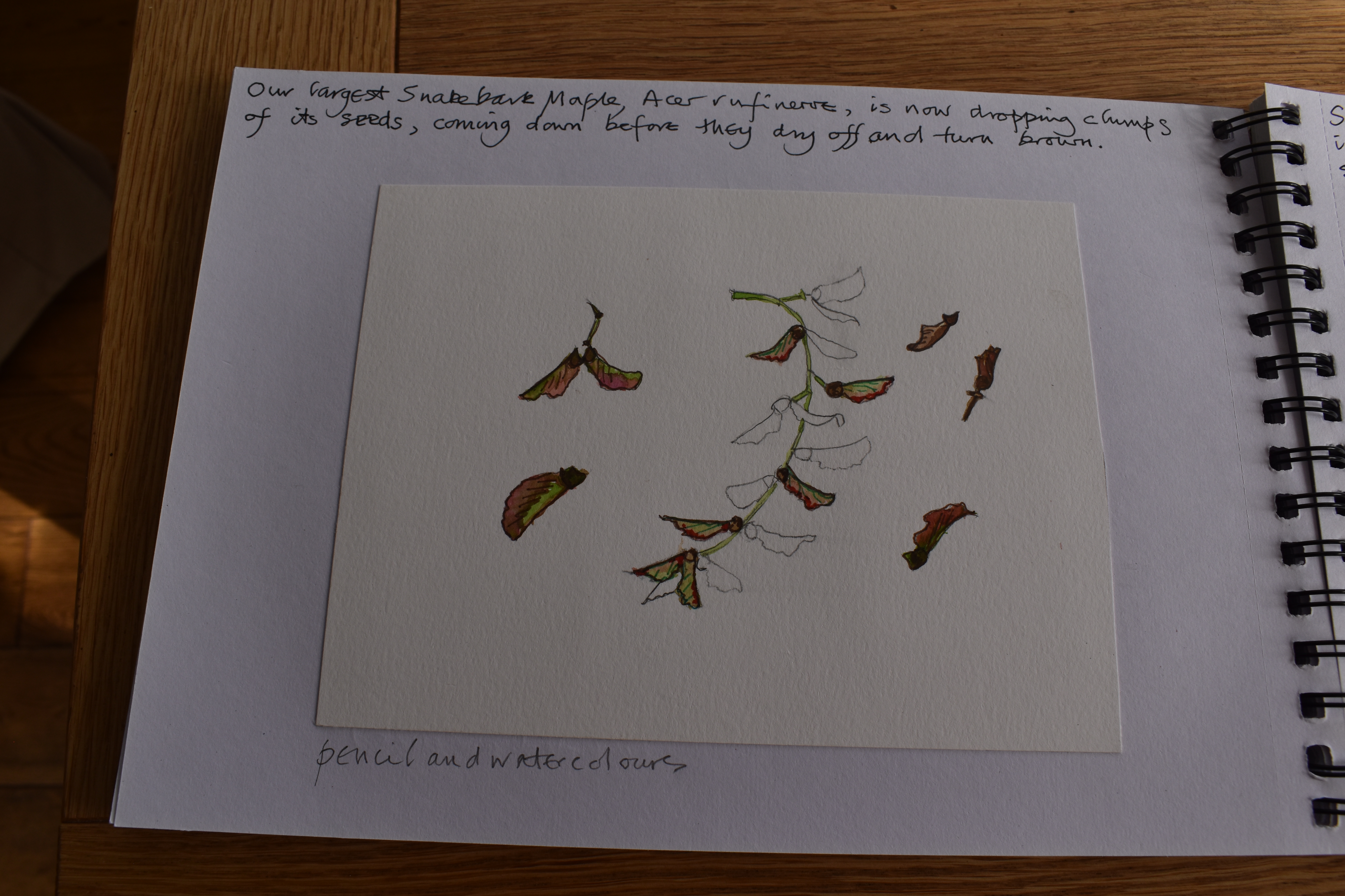 Moving on through the September pages I next shared a set of pencil and watercolour drawings of the seedheads of our mature Acer rufinerve. I wrote, “Our largest snakebark maple, Acer rufinerve, is now dropping clumps of its seeds, coming down before they dry off and turn brown.”