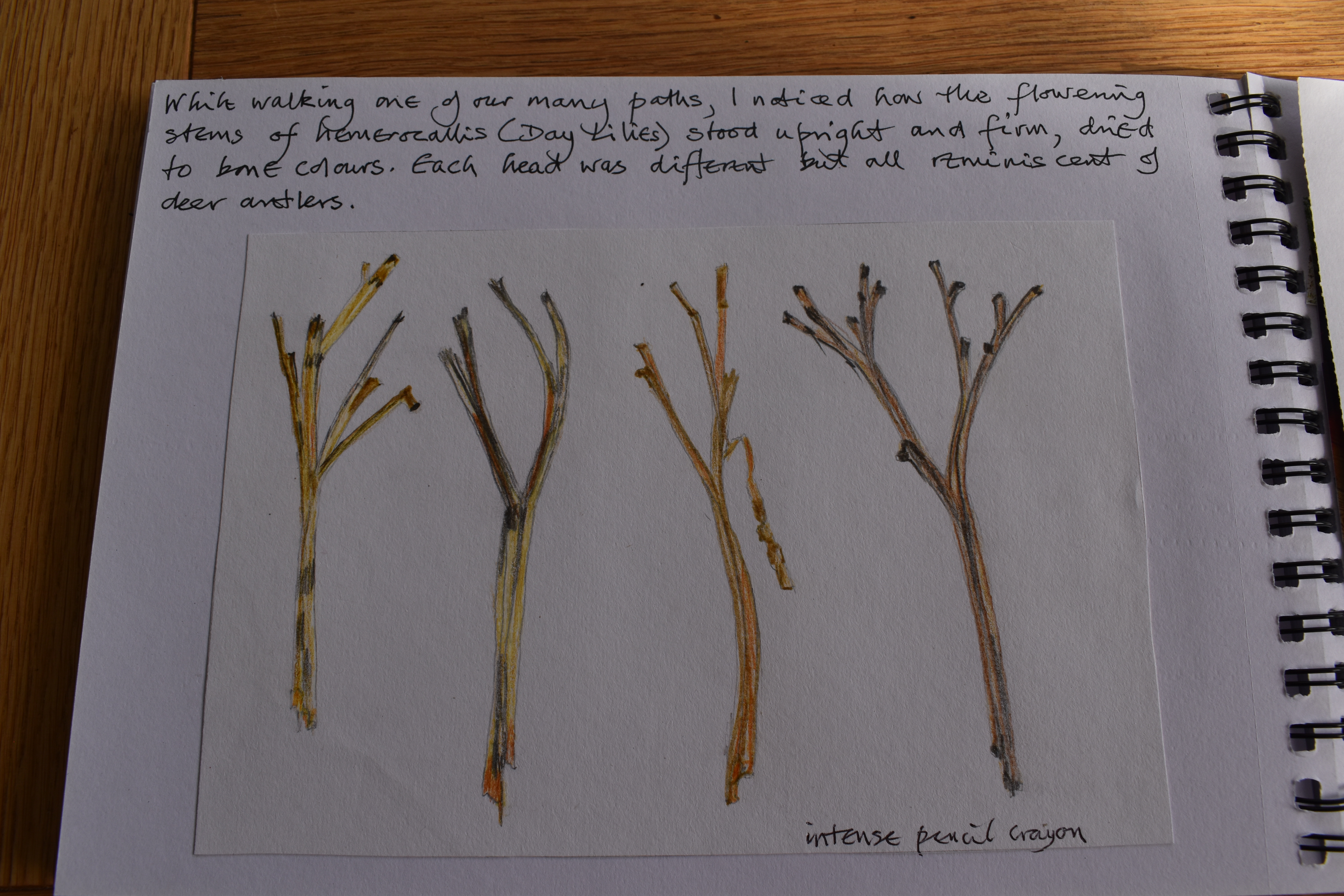 For the final page for September in my garden journal I looked at some surprise dried stems we found. I wrote, “While walking one of our several garden paths, I noticed how the flowering stems of hemerocallis (Day Lilies) stood upright and firm, dried to bone colours. Each head was different but all were reminiscent of deer antlers.”