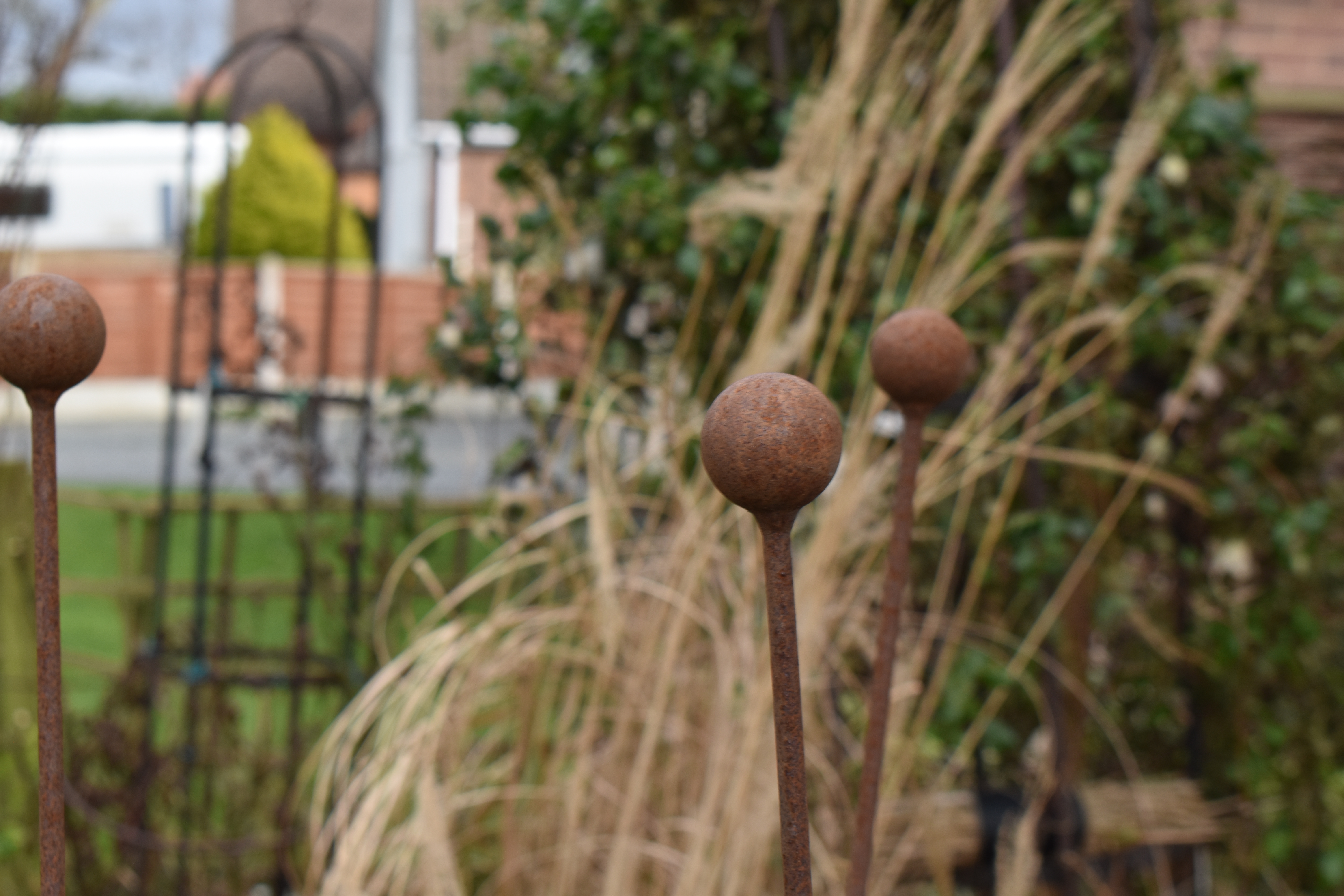 In the front garden in one of our ‘Doughnut’ beds we have a few pieces working together to enhance the planting.