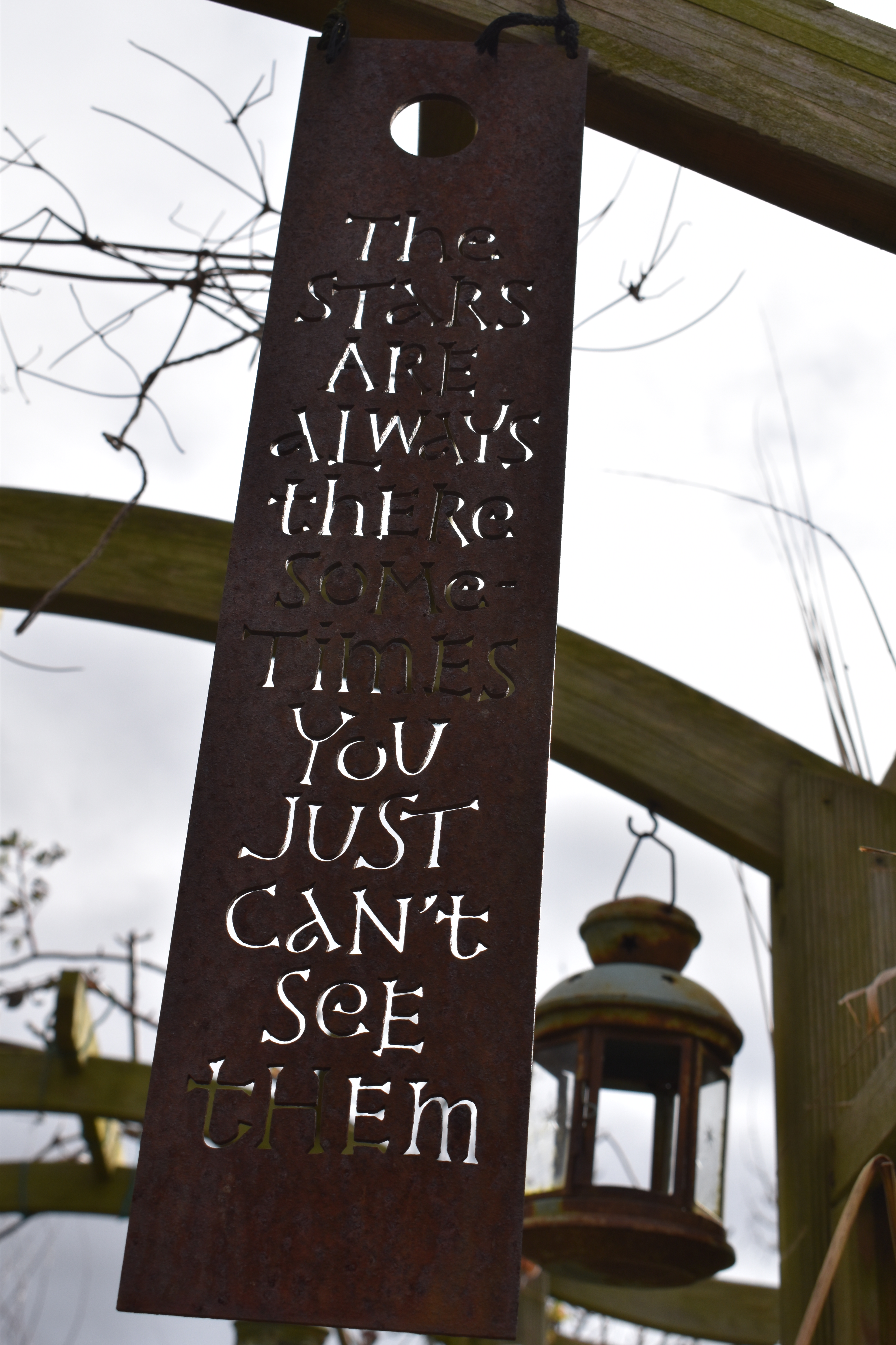 When we visited a National Garden Scheme garden a few years ago in Herefordshire we discovered it to be a garden and gallery for outdoor sculpture and calligraphy work on stone and laser cut into steel. We bought two pieces from a series of corten steel rectangles designed to hang and be seen from both sides. The left hand piece below says, ‘The grass is always greener on the other side with the word ‘greener’ readable from the other side. The right hand photo features the words ‘The stars are always there but sometimes you just can’t see them.