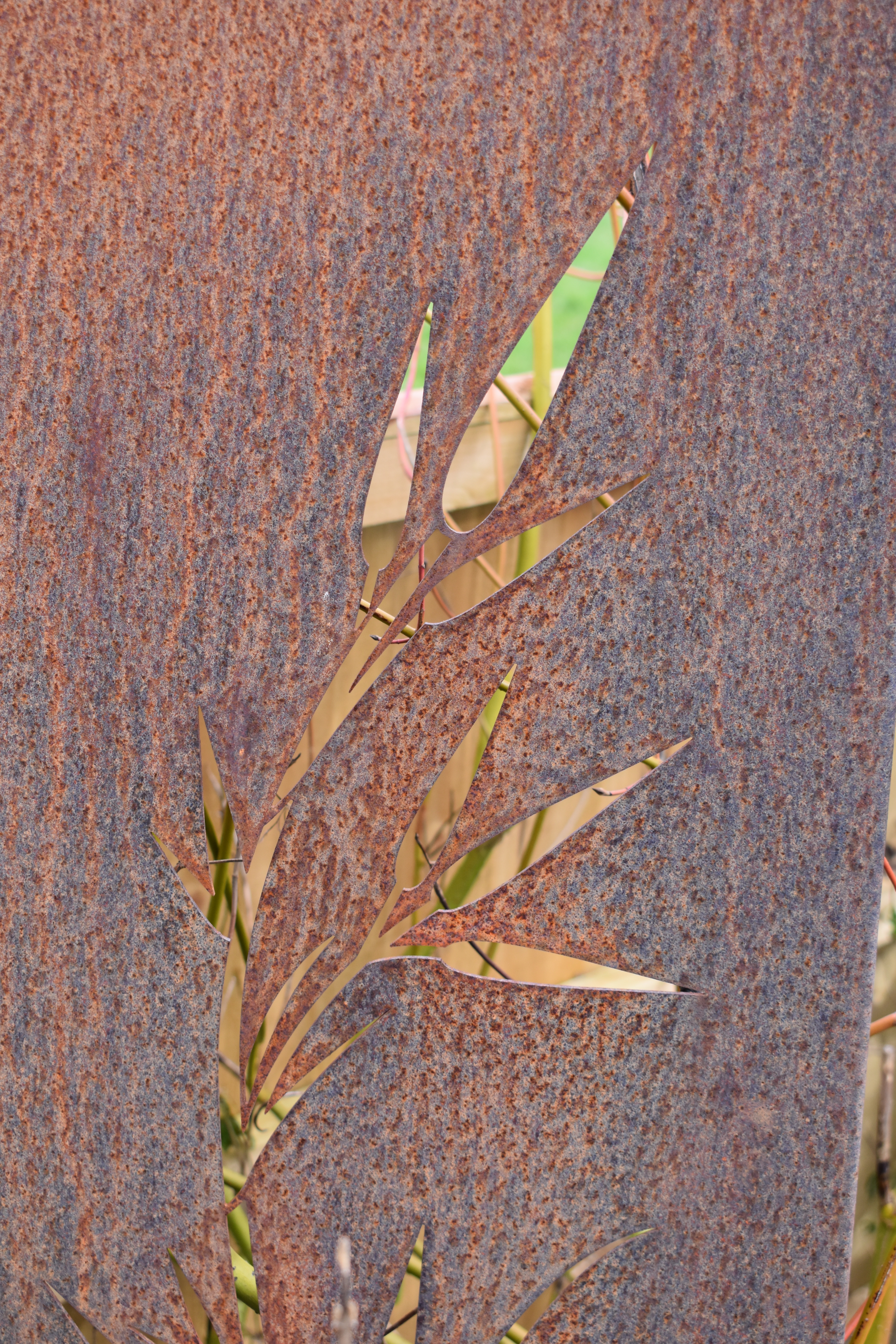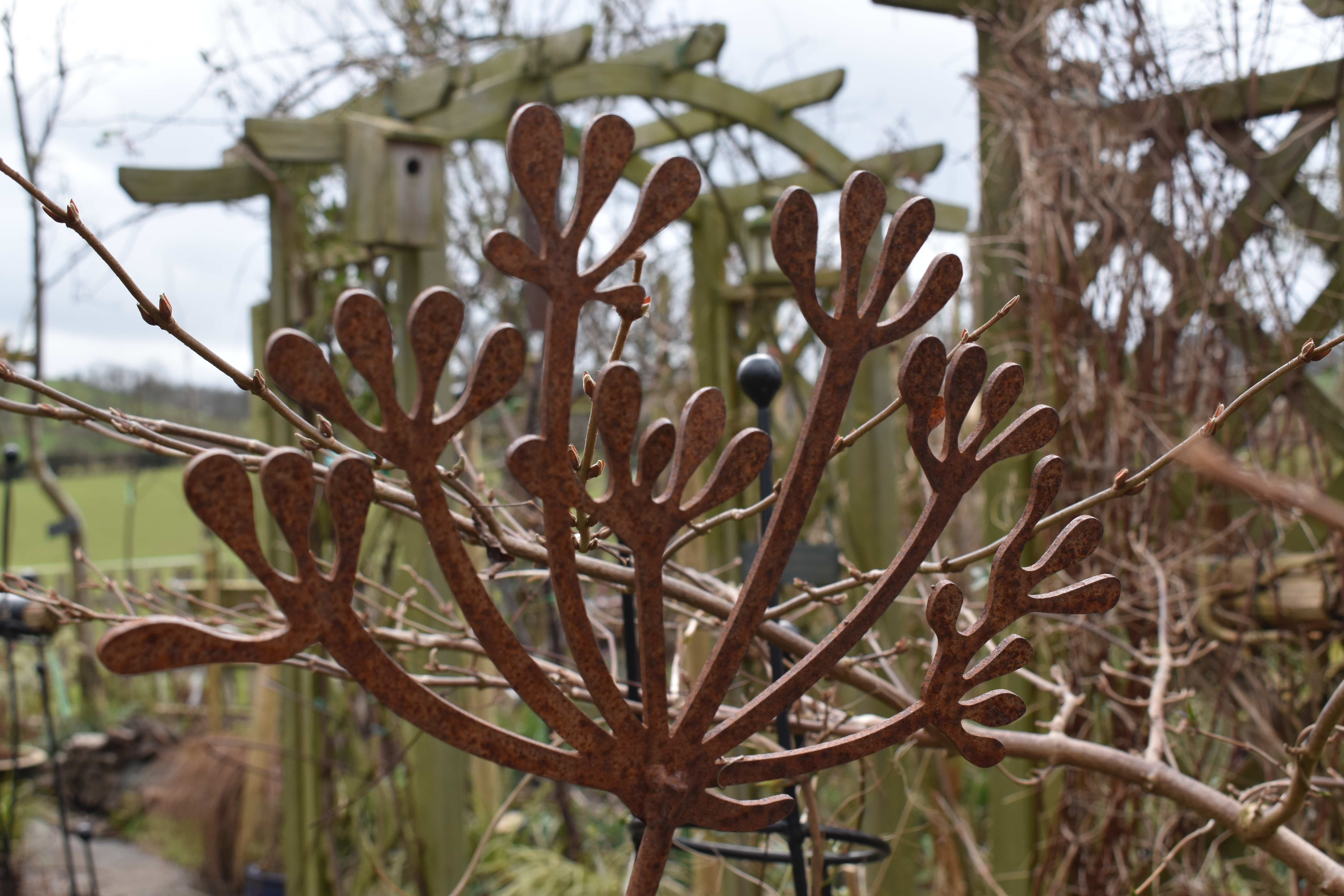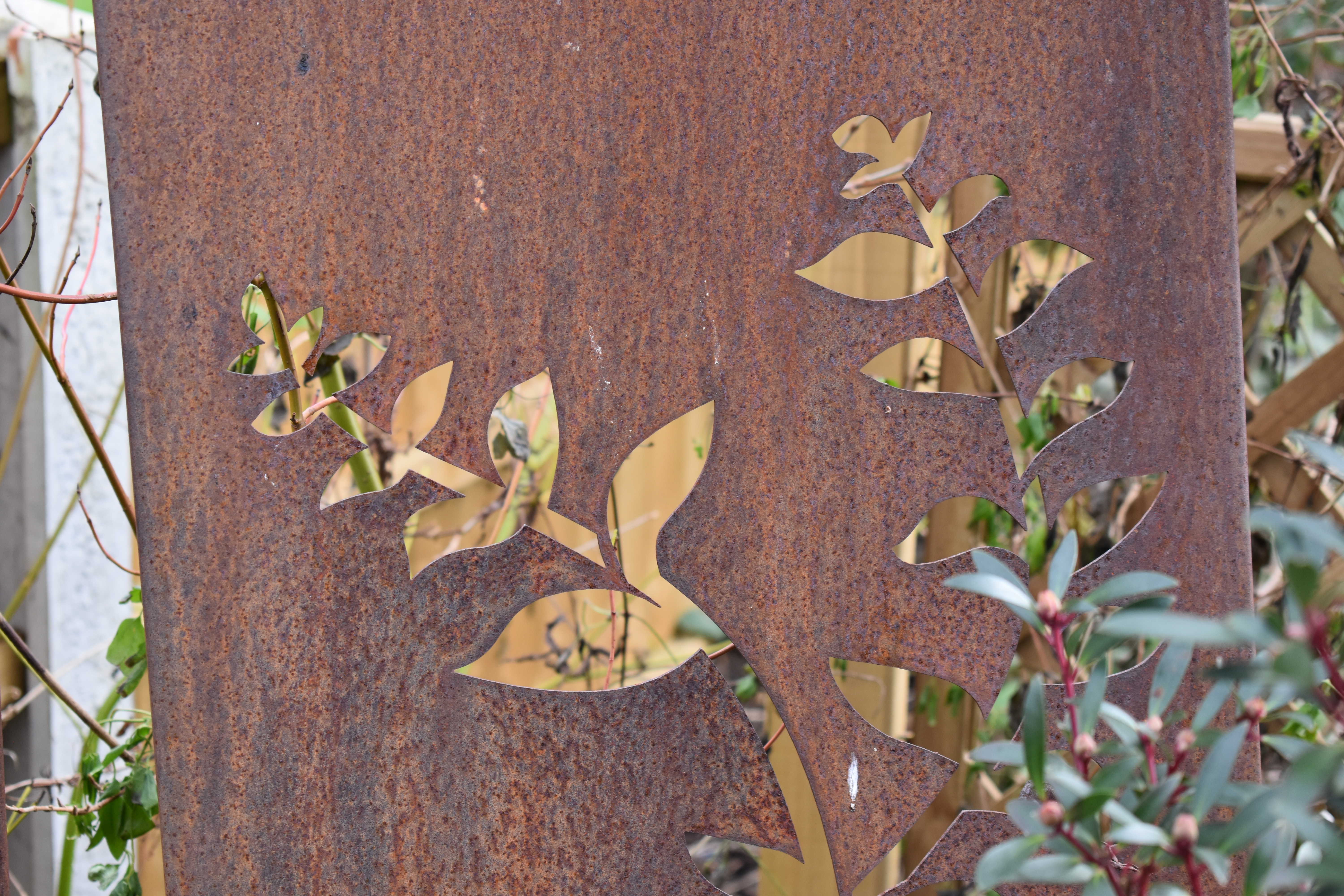 The newest piece we have is a Tree of Life, a lovely metre wide and laser cut from a sheet of corten steel and it fits well where we have fixed it up on our pale cream coloured house wall. It presents as a viewpoint from down our central path looking up from the bottom fence of the back garden.