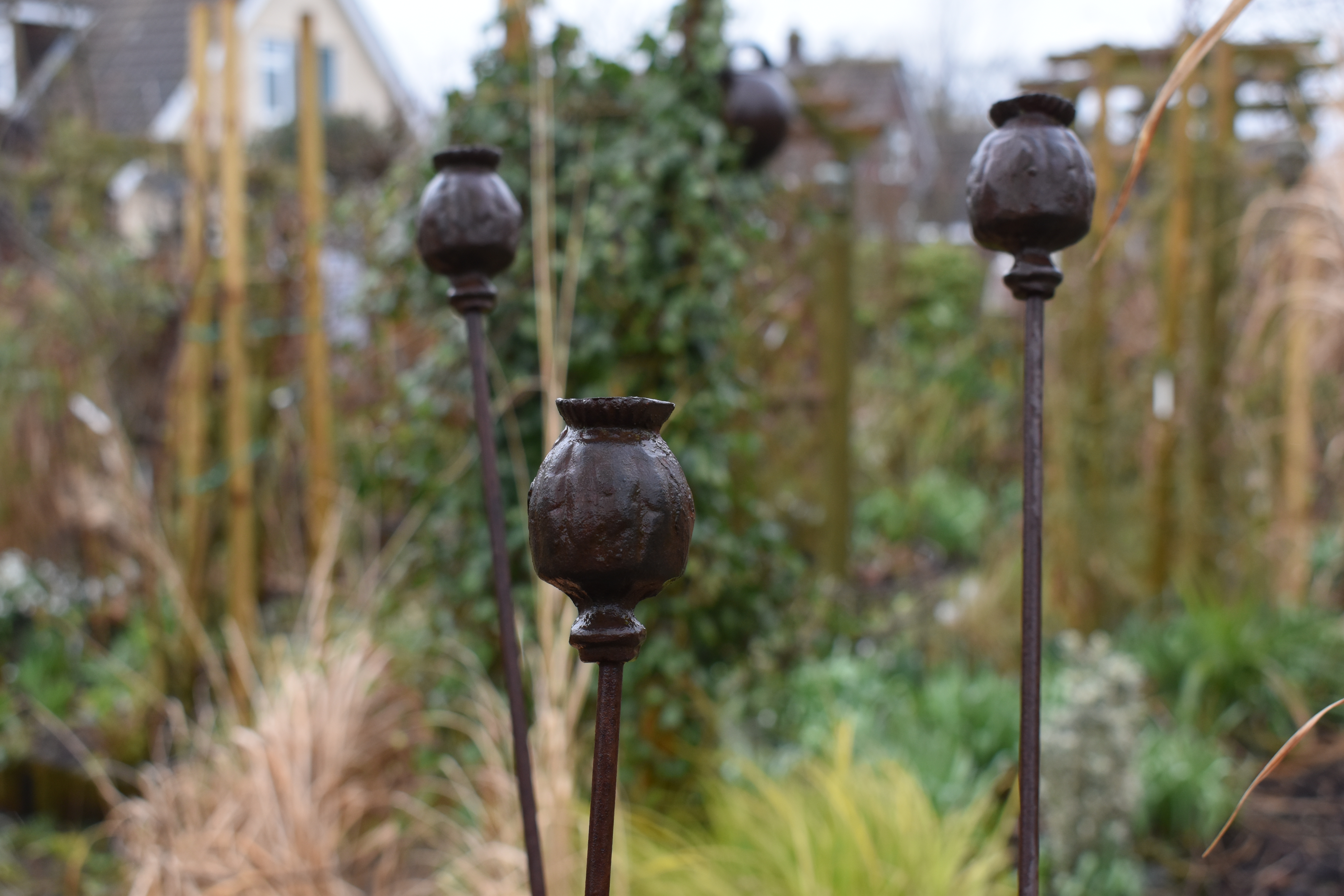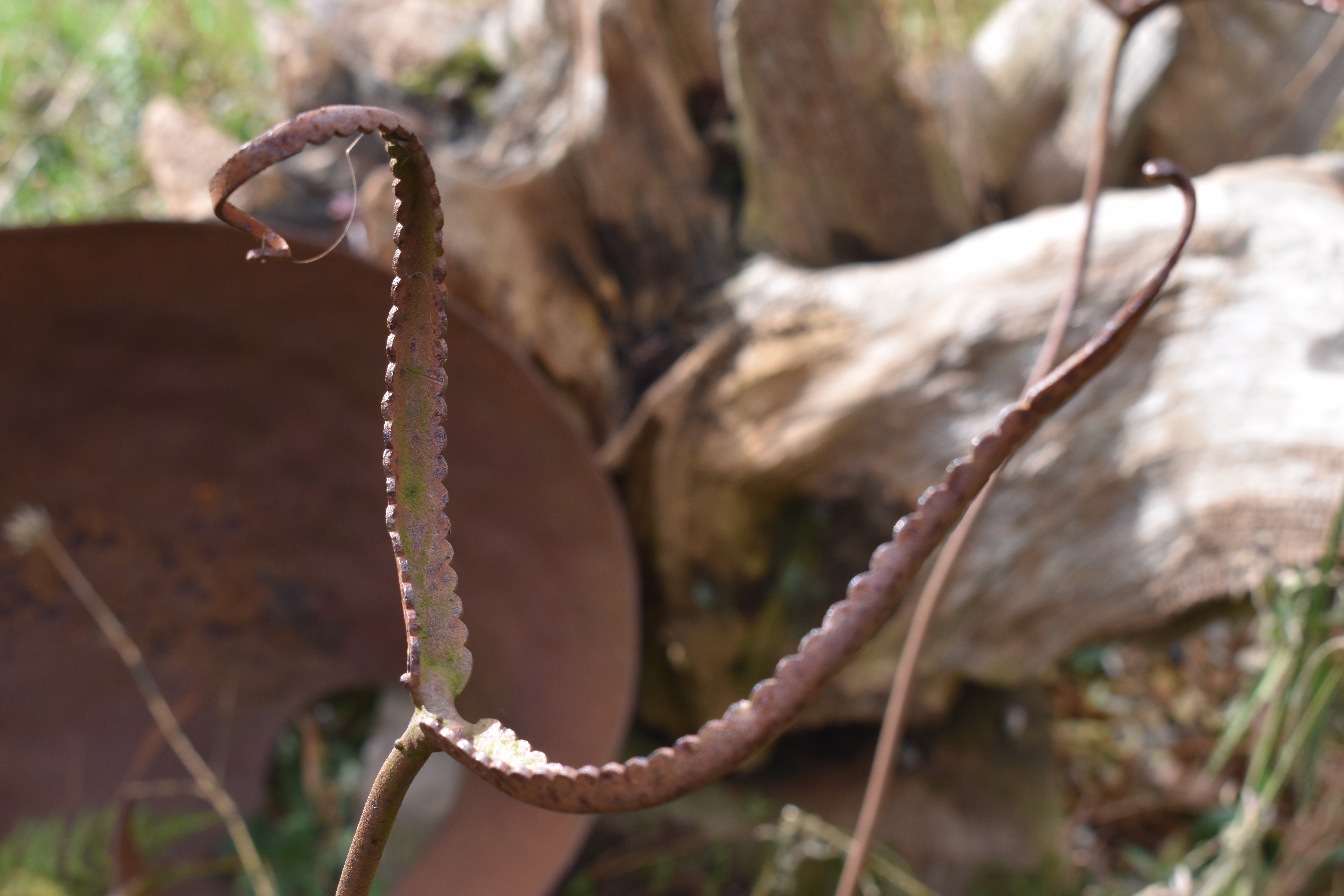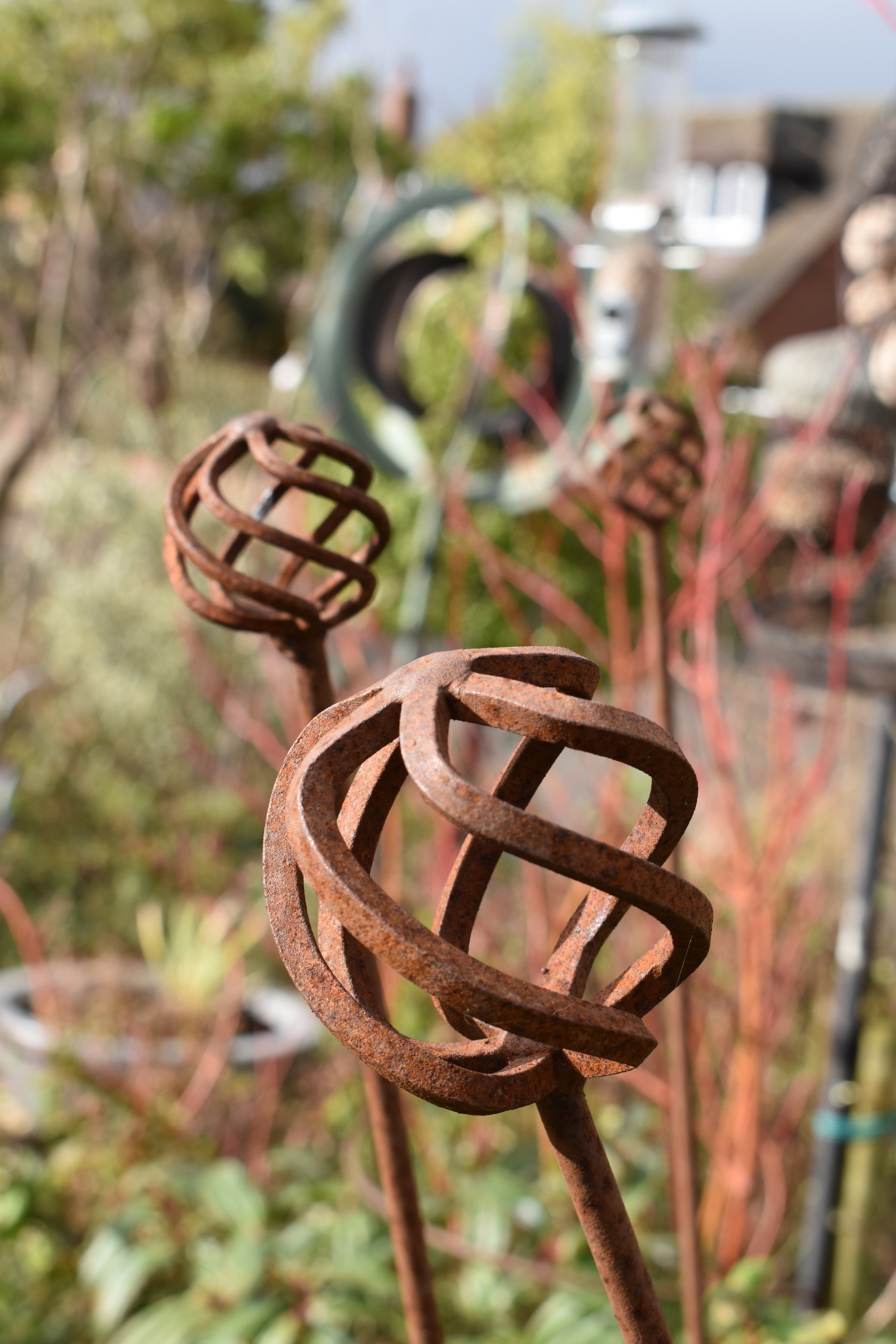 Garden sculpture inevitably often features plants. Ferns are a common subject along with seed-heads. We have several pieces featuring poppy seed-heads on four foot rusted steel stems which can double up a plant supports in the summer. The simplest of this style of sculpture are based on simple sphere. These all fit into borders with herbaceous plants throughout our garden borders. At the other end of the scale is a tall heavy piece based on the fluffy seed-heads of clematis and this is shown in the 4th photo followed by the clematis seed-heads themselves.