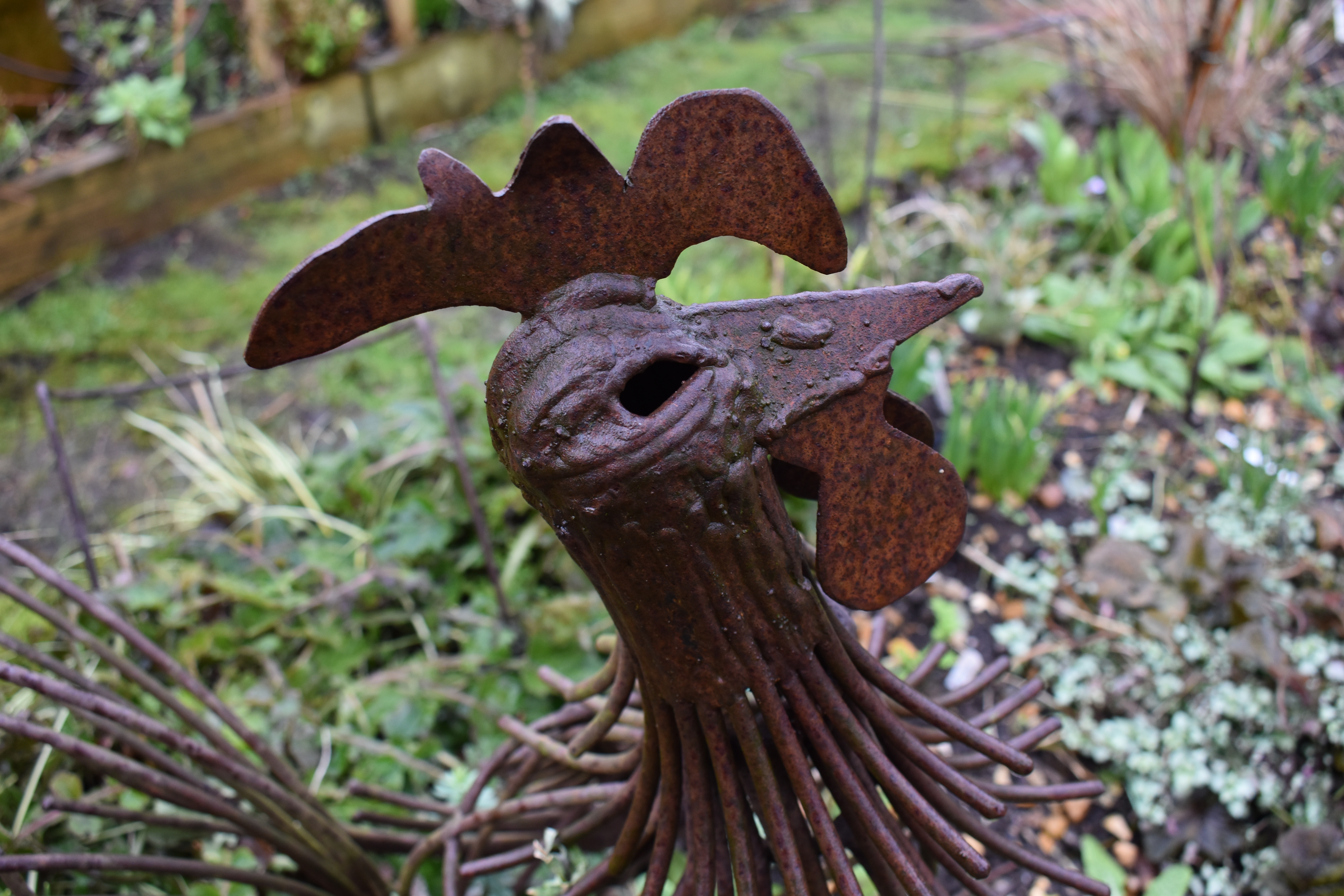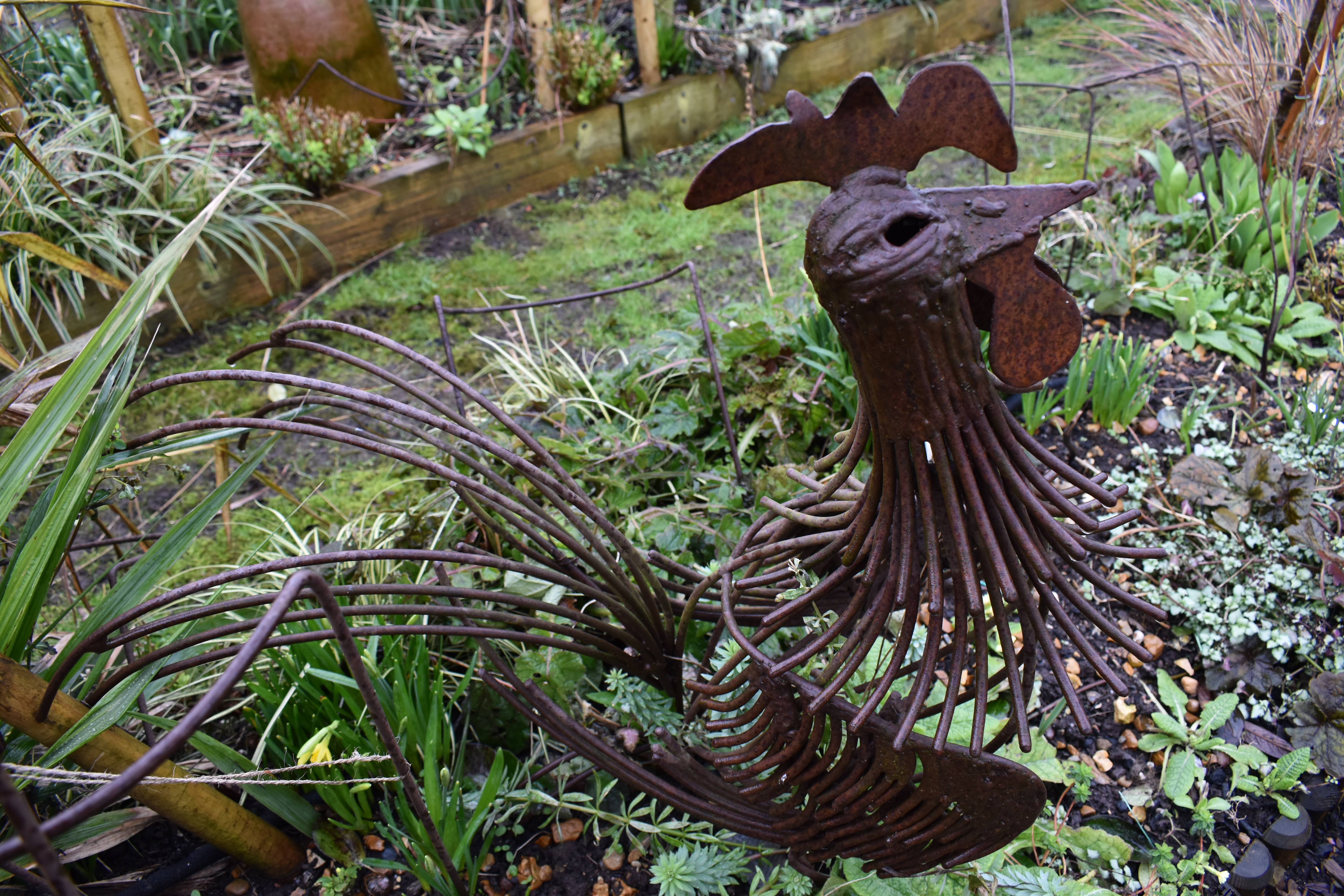 We have two pieces made by an artisan blacksmith who works in South Shropshire, the area of the county in which we live, but he is further south. We bought a tall piece featuring a dragonfly in flight which we have positioned close to the wildlife pond where he looks at home. The second piece is a life sized cockerel which the blacksmith called Gregory and asked us to keep the name!